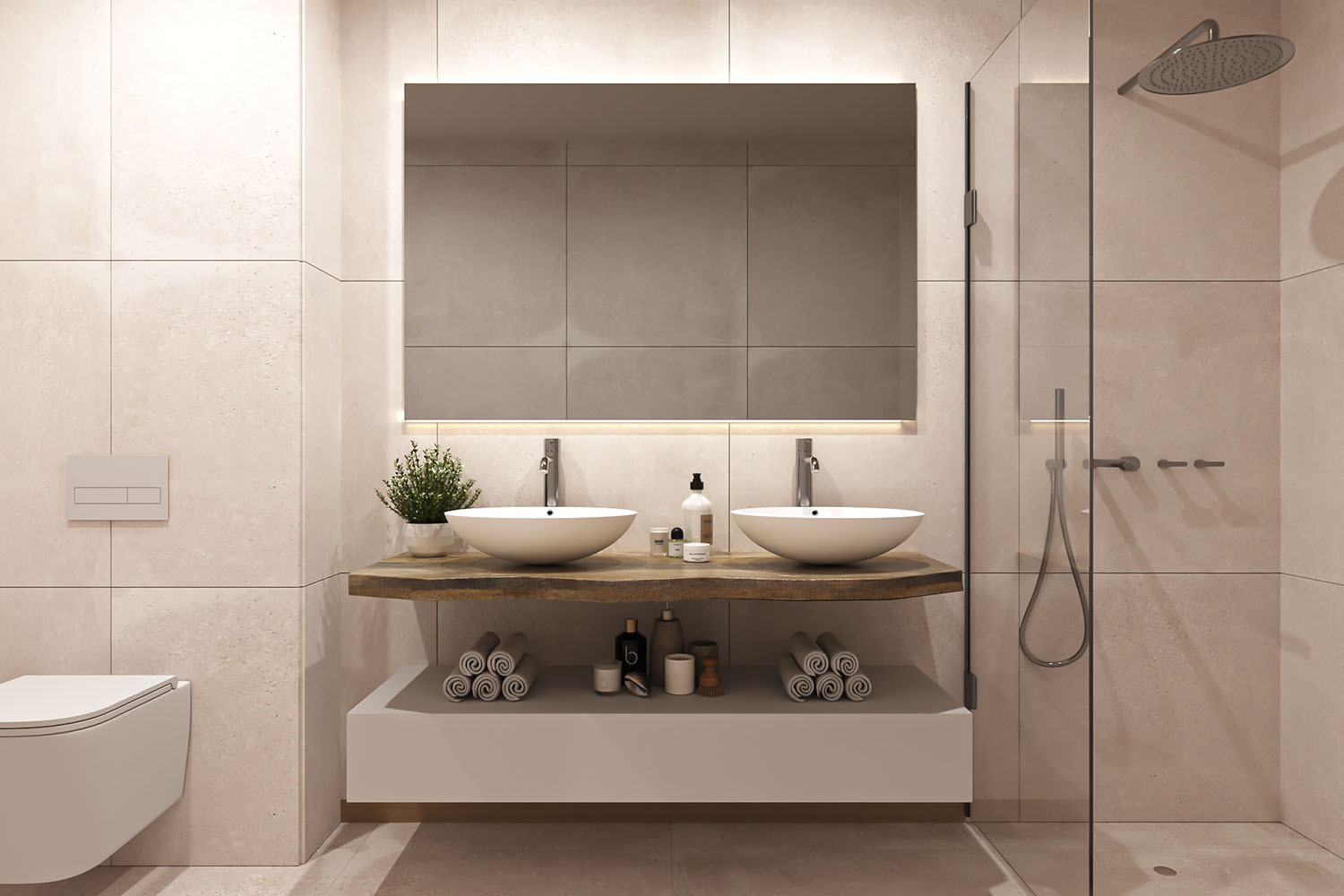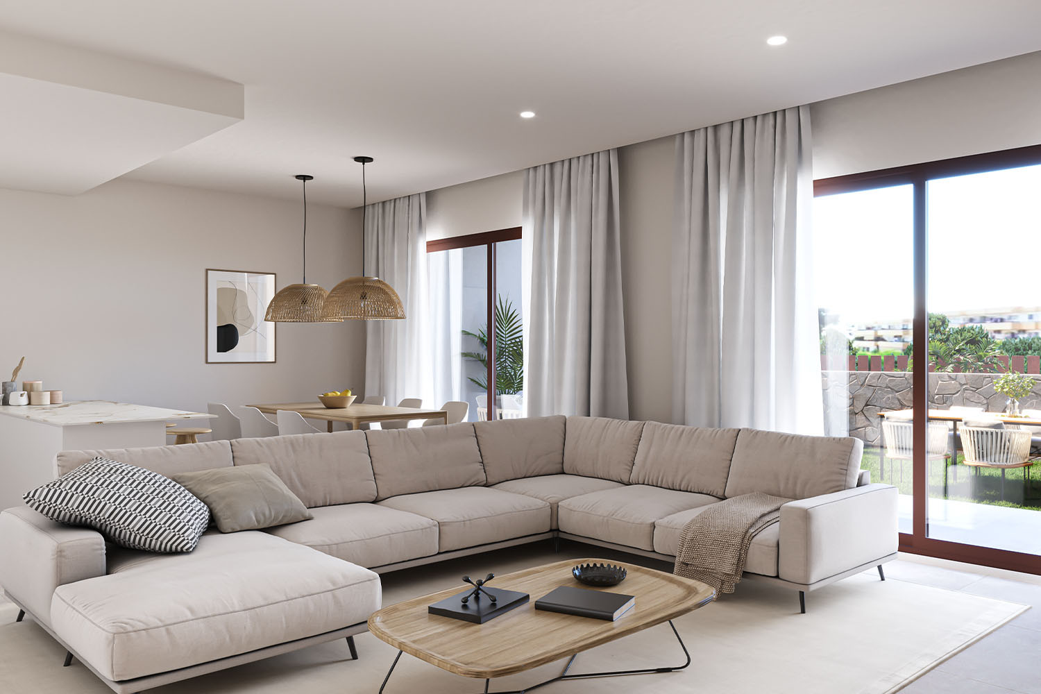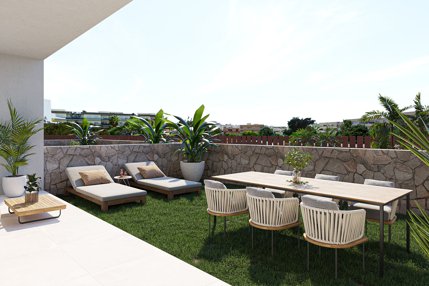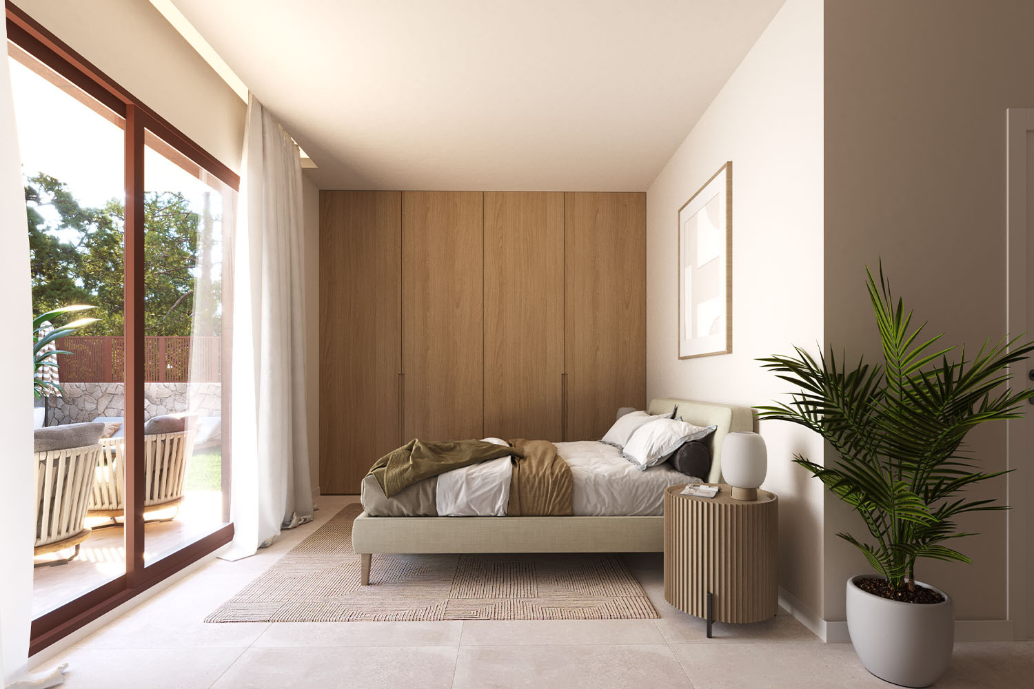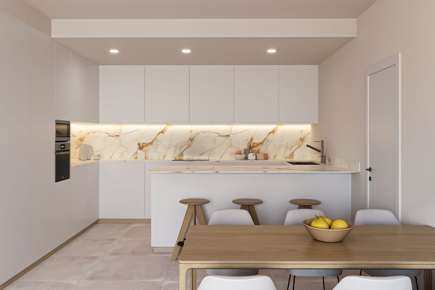 Alle Wohnungen verfügen über drei Schlafzimmer und sind in verschiedenen Typologien erhältlich: Erdgeschosswohnungen mit privaten Gärten, Einheiten im ersten Stock mit großzügigen Terrassen sowie exklusive Penthäuser mit privatem Solarium. Die Grundrisse sind funktional und komfortabel gestaltet und bieten offen gestaltete, gut proportionierte Räume.