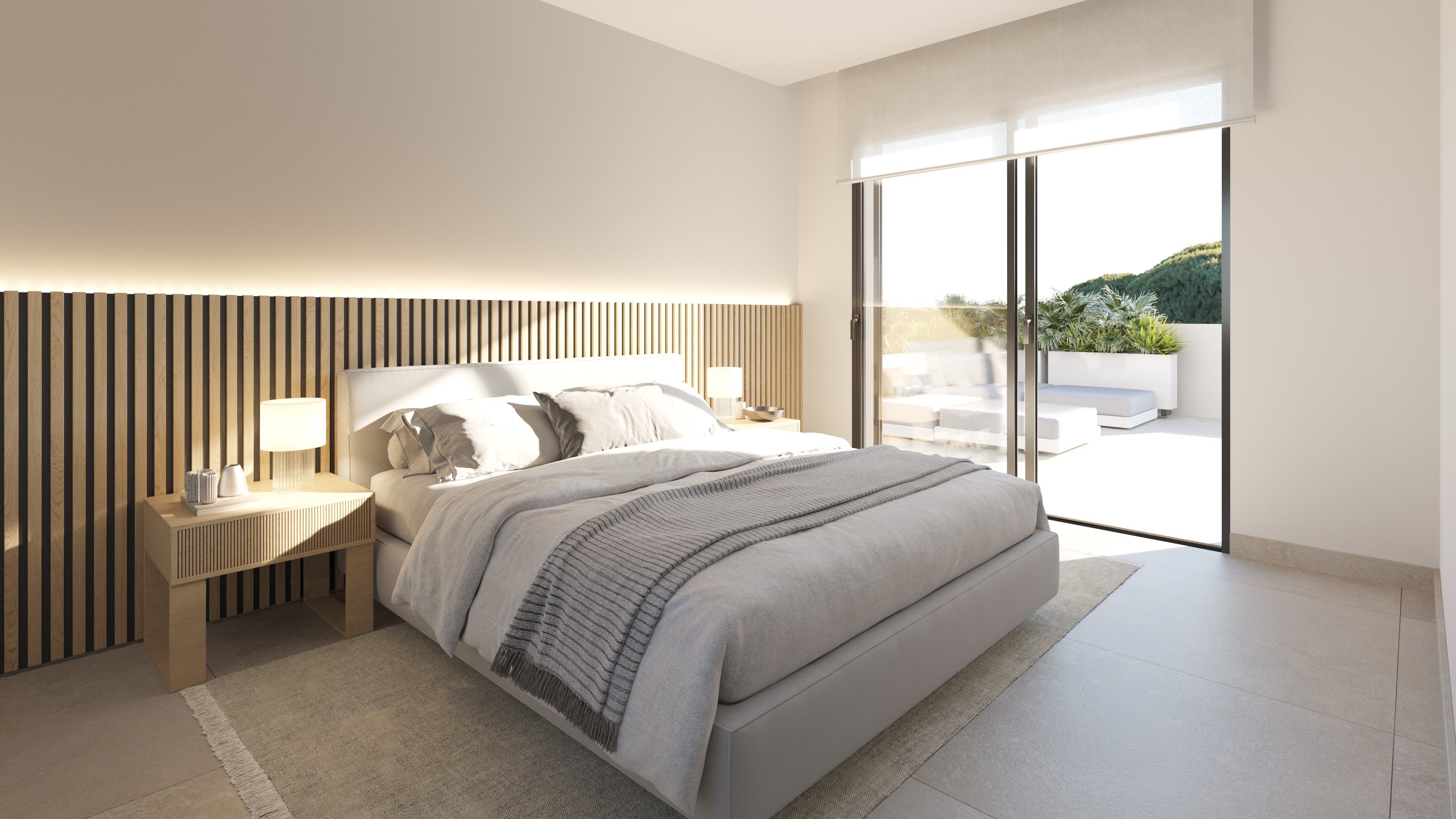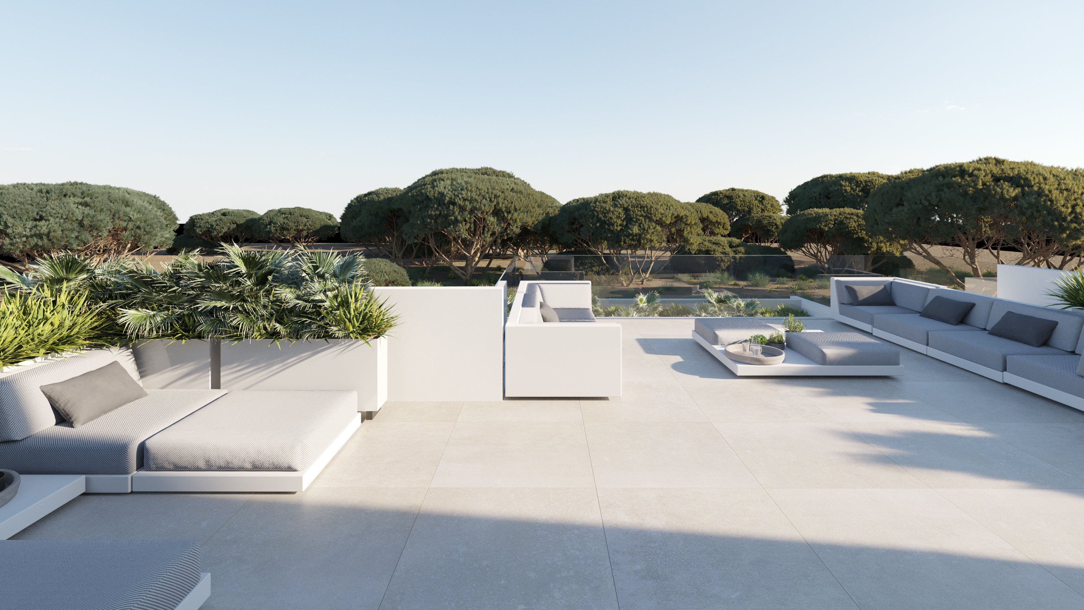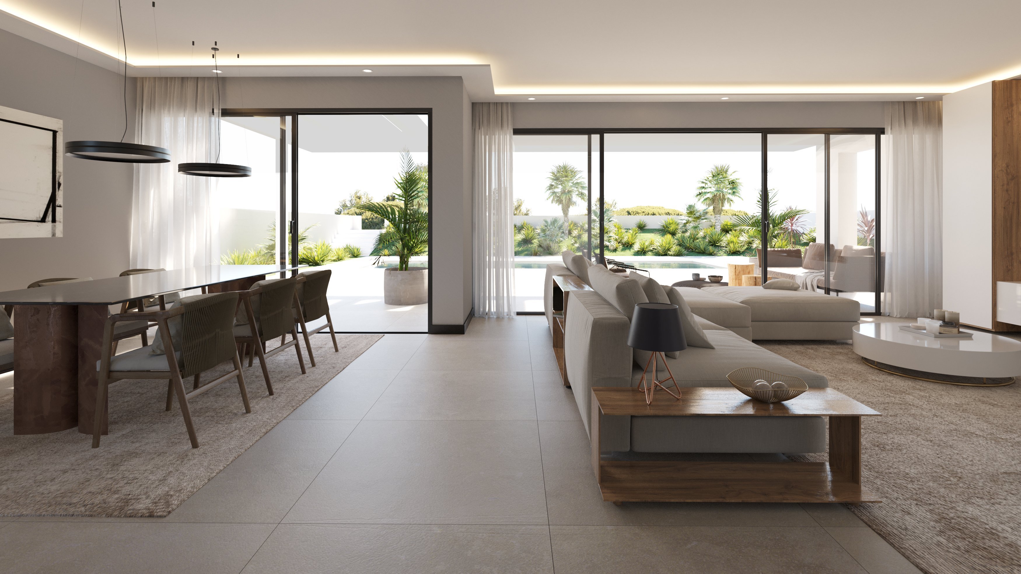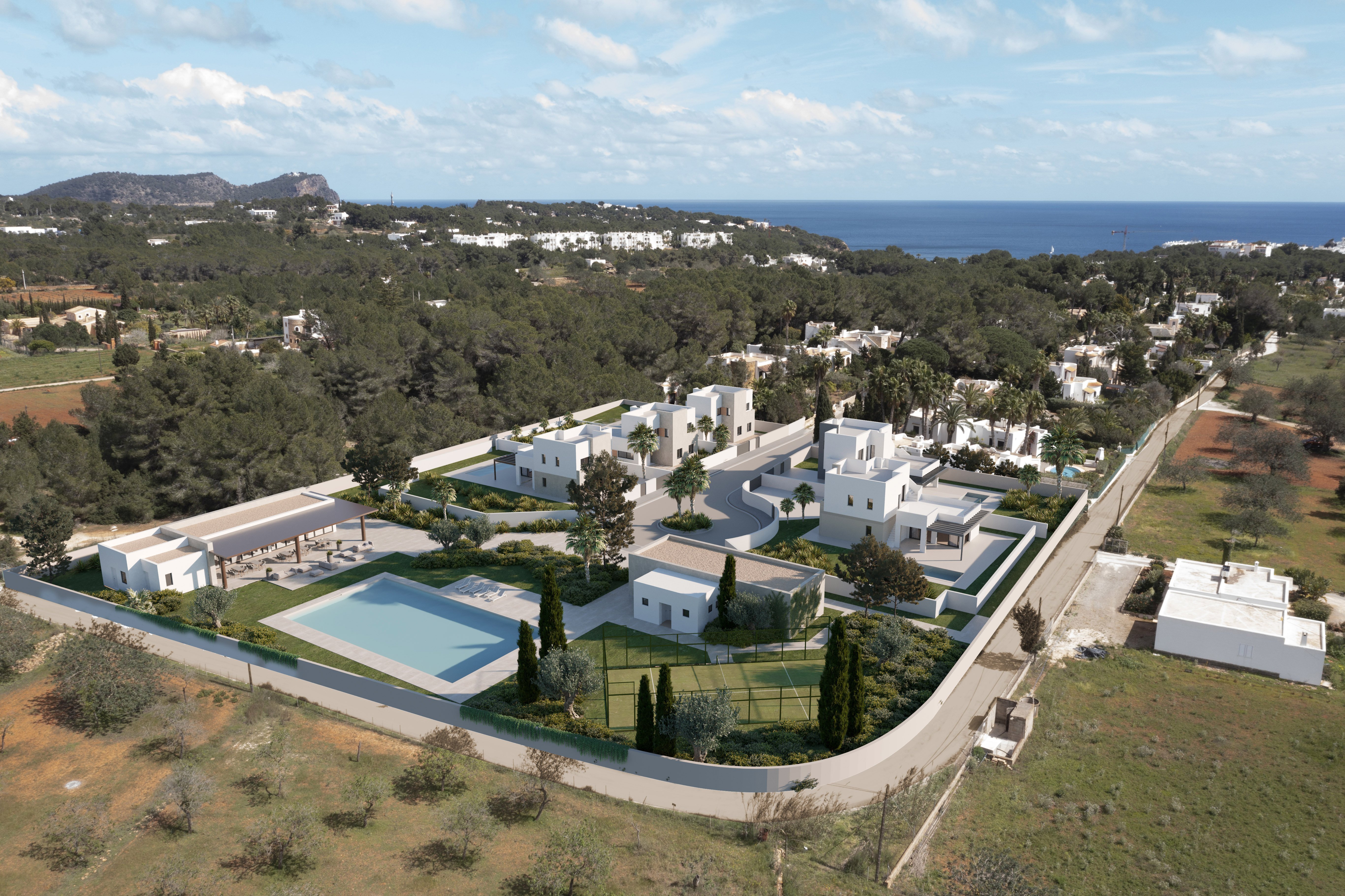 In jeder Villa befinden sich vier Schlafzimmer, verteilt auf zwei Etagen. In der untern Etage befindet sich des Weiteren der Wohnbereich, der an die offen modern Küche anschließt. Von hier aus gelangt man in den Garten mit eigenem Pool und überdachten Terrassen, über eine Treppe gelangt man auch hinauf auf die große Dachterrasse, von der man einen schönen Blick auf die typisch ibizenkische Landschaft bietet. Der große Gemeinschaftspool und der Paddelplatz runden das Angebot ab.