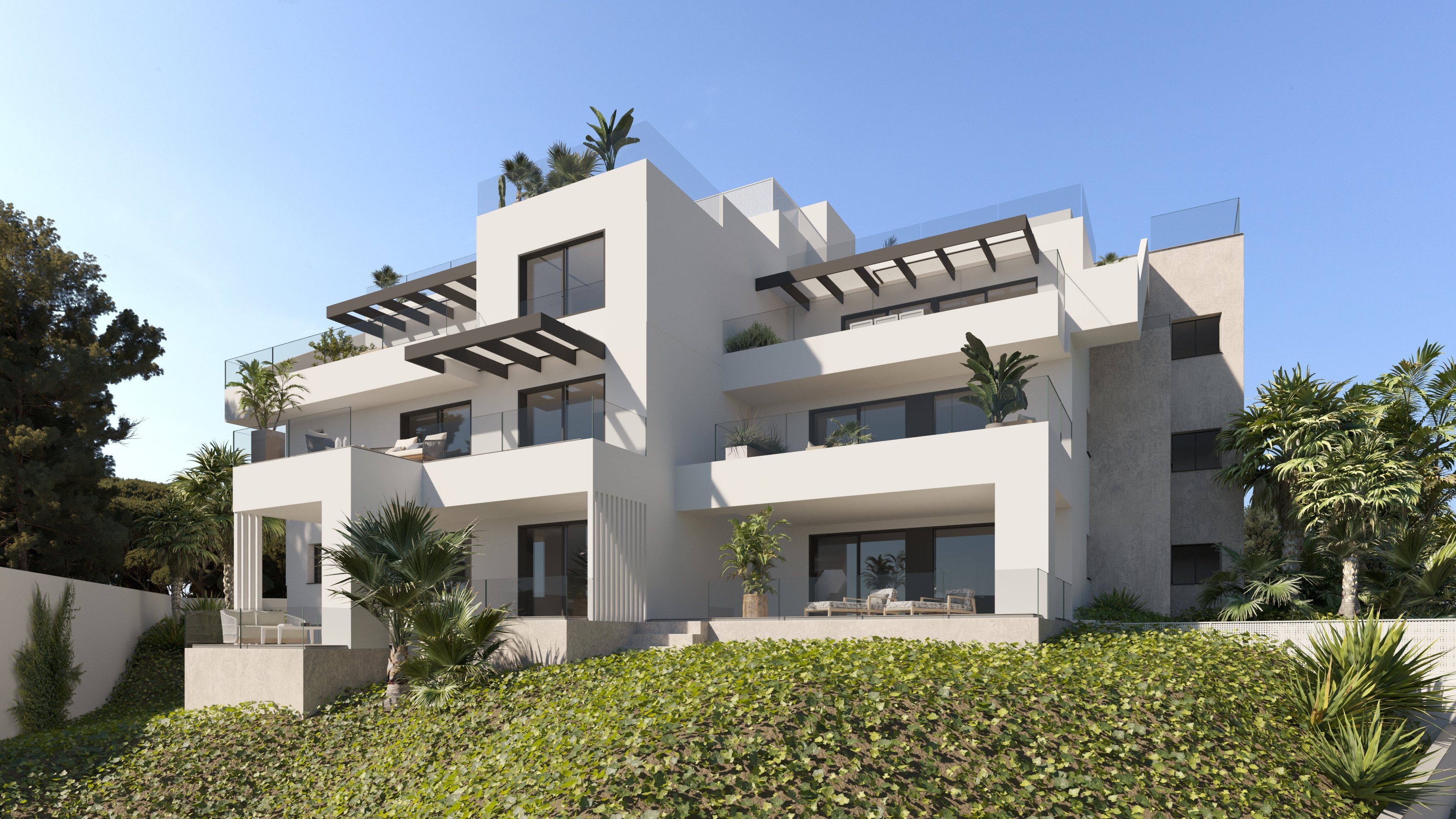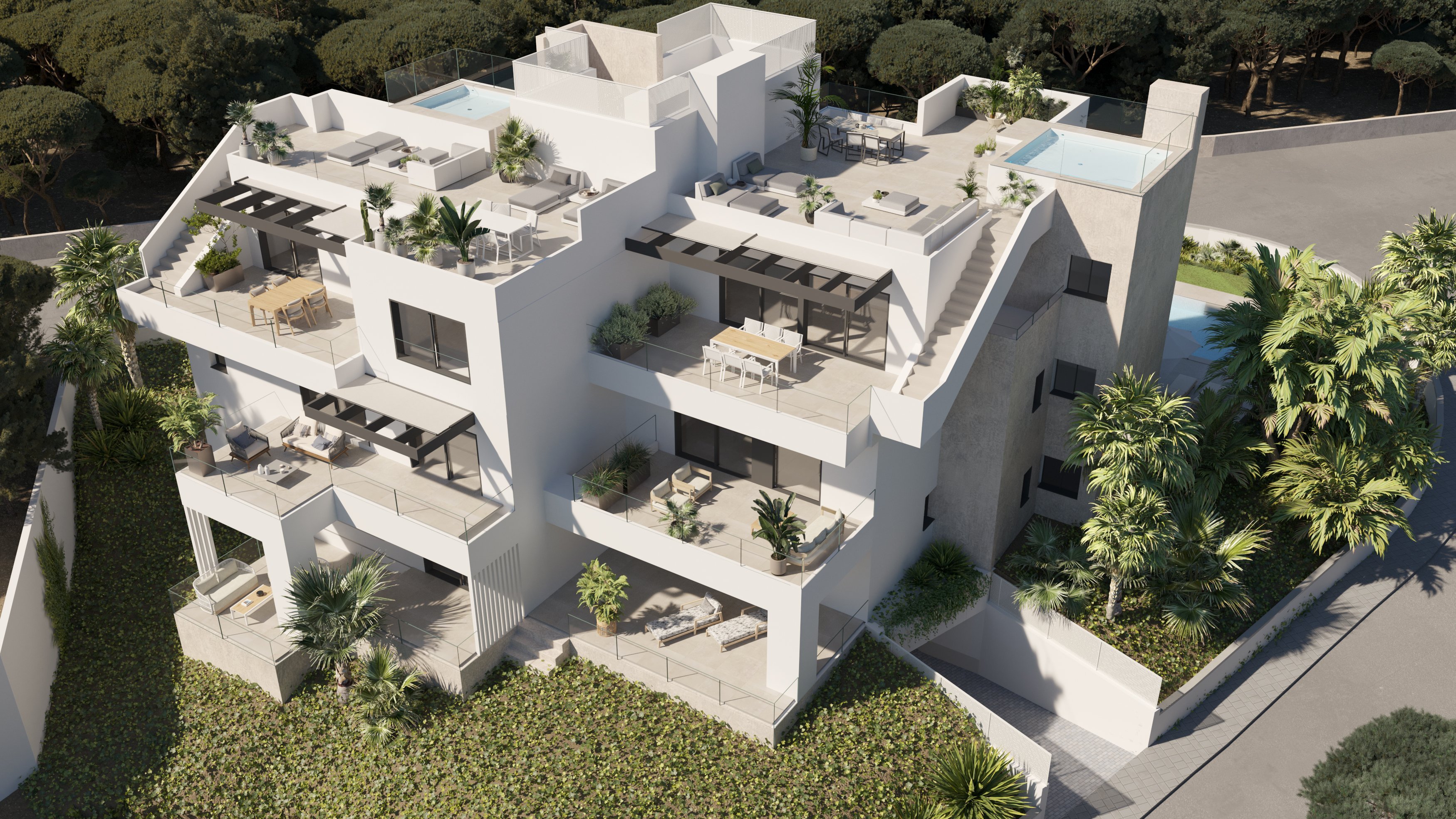 Die Wohnungen im Erdgeschoss und im ersten Stock verfügen über drei Schlafzimmer, zwei Badezimmer und eine Gästetoilette. Die Penthäuser sind mit zwei Schlafzimmern und zwei Badezimmern ausgestattet und bieten eine komfortable und funktionale Aufteilung. Die Wohnungen im Erdgeschoss verfügen über große private Gärten, während die Penthäuser über private Dachterrassen verfügen, von denen Sie einen fantastischen Meerblick genießen können.