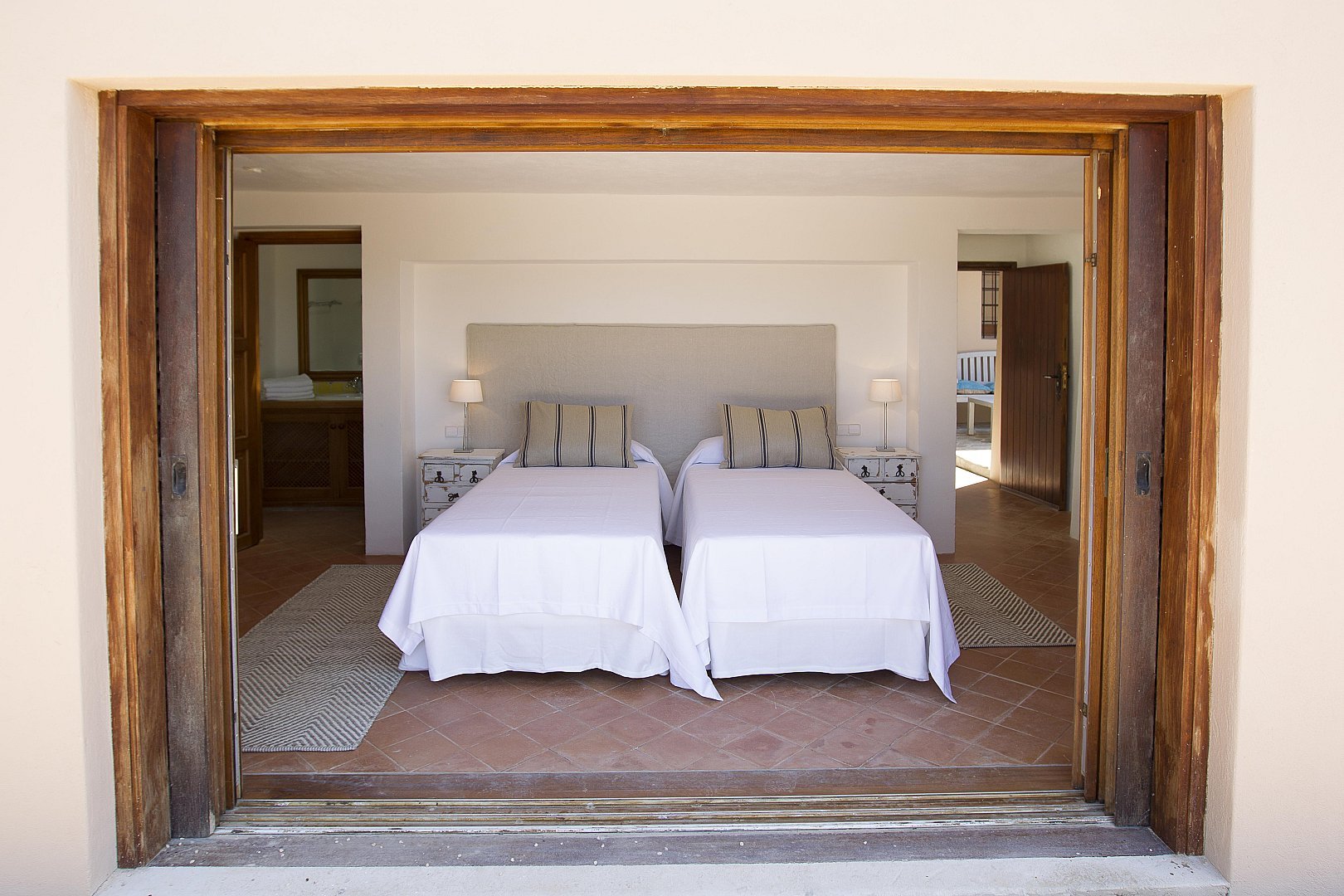 - Schlafzimmer 4: Zwei Einzelbetten mit eigenem Bad (Dusche, WC), Klimaanlage, Zugang zu den Gärten und zum Tennisplatz
