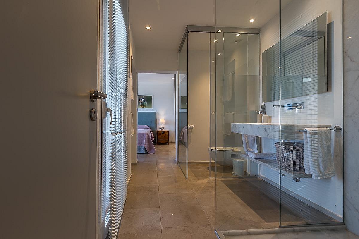 • Schlafzimmer 2: Kingsize-Bett (180 cm), eigenes Badezimmer (Dusche), direkter Zugang zu einer großen Terrasse mit Meerblick