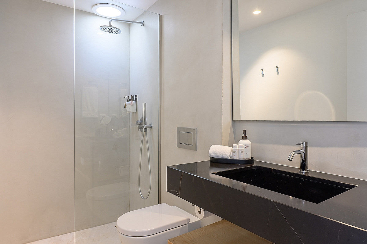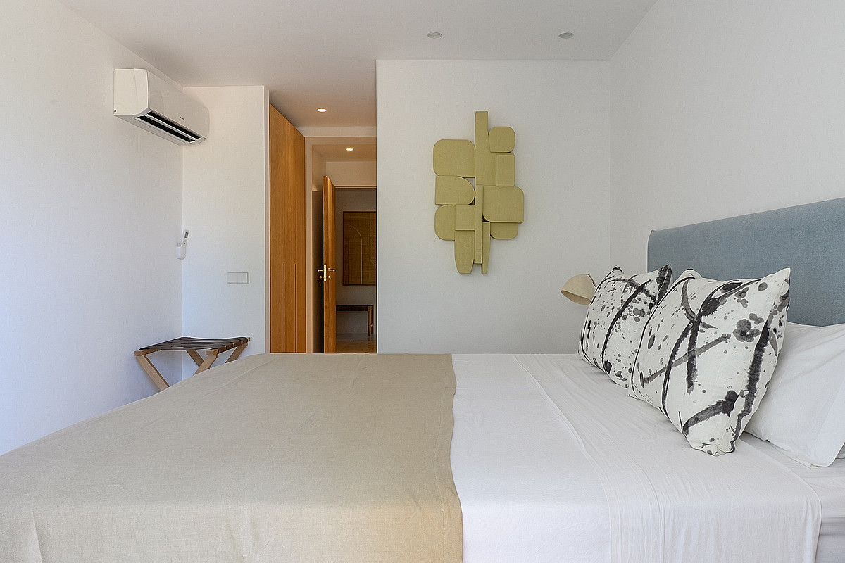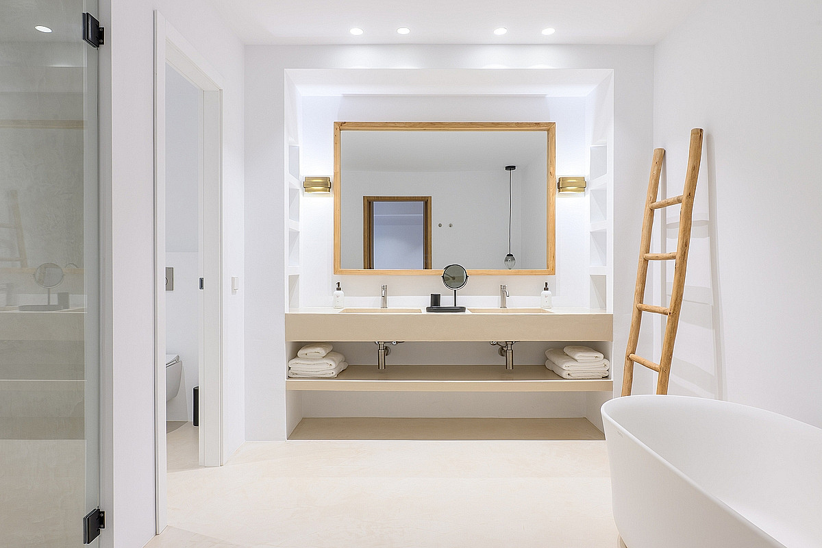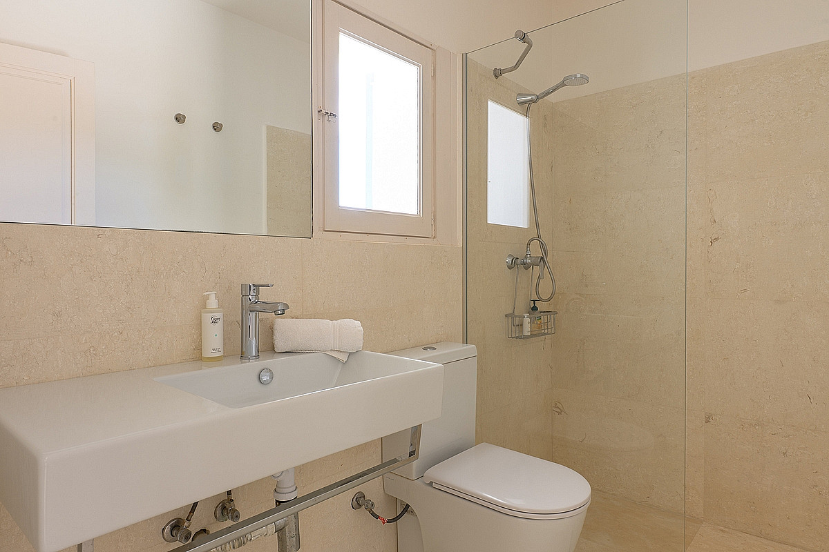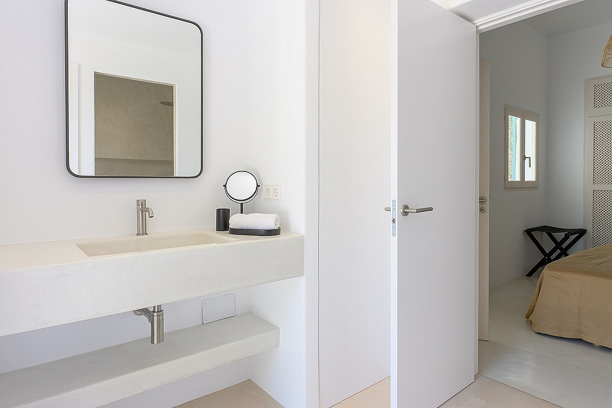 - Gästesuite 1 (Erdgeschoss) – Eigenes Bad, private Veranda mit Meerblick, Ankleidezimmer und Außendusche.
