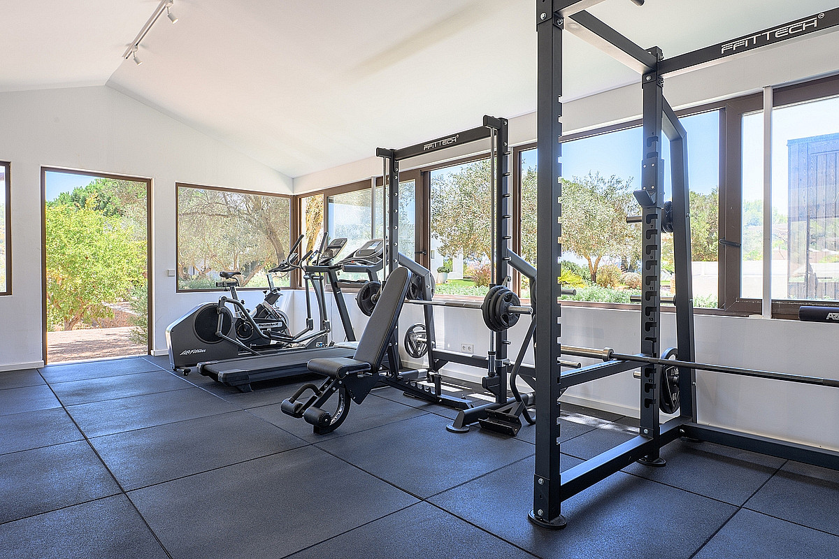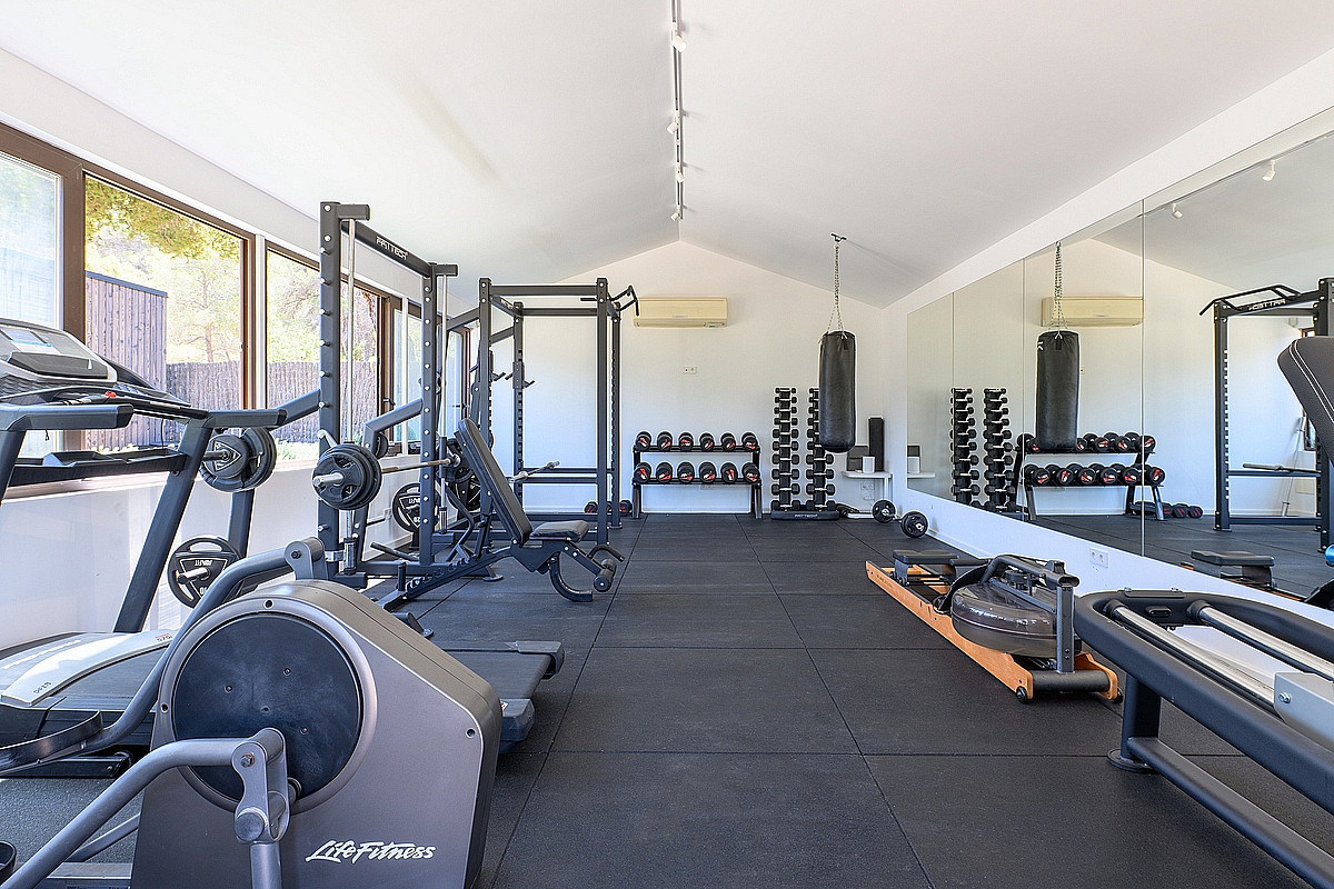 - 40 m² großer, voll ausgestatteter Fitnessraum mit Klimaanlage und Blick auf den Garten