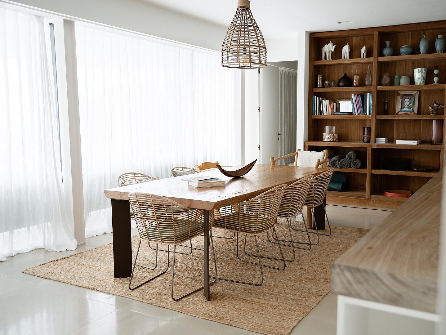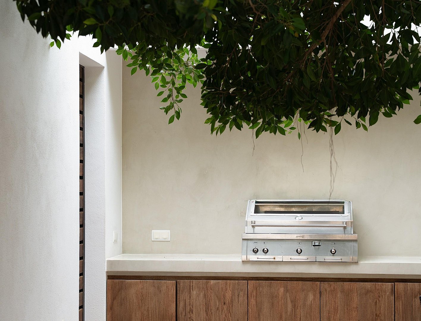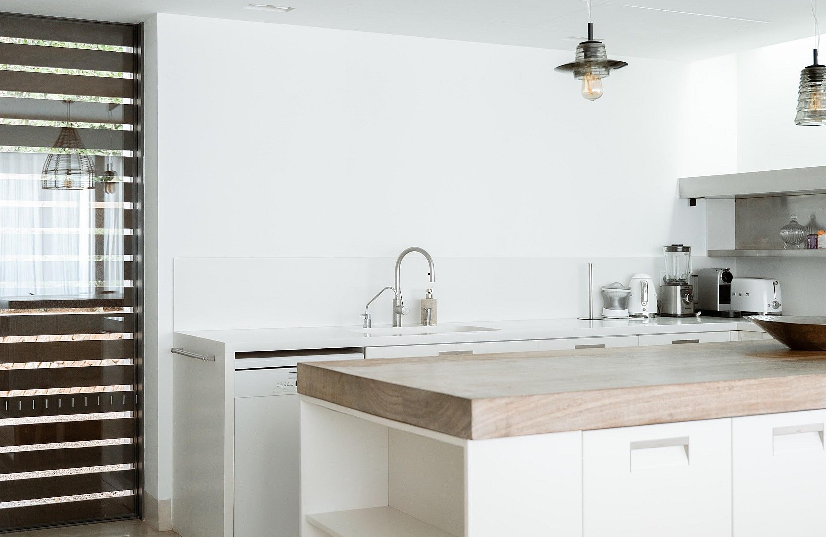 Der offene Innenbereich ist geschmackvoll mit glatten Steinfliesen, weiß getünchten Wänden und organischen Texturen gestaltet und schafft einen hellen und luftigen Wohnraum. Die raumhohen Fenster verbinden die Küchen-, Ess- und Wohnbereiche nahtlos mit der atemberaubenden Außenterrasse und sorgen für einen kontinuierlichen Fluss von natürlichem Licht und einer atemberaubenden Landschaft.