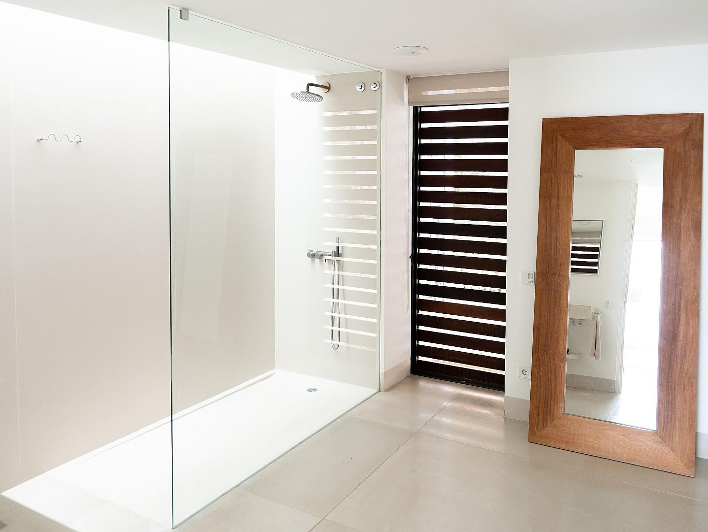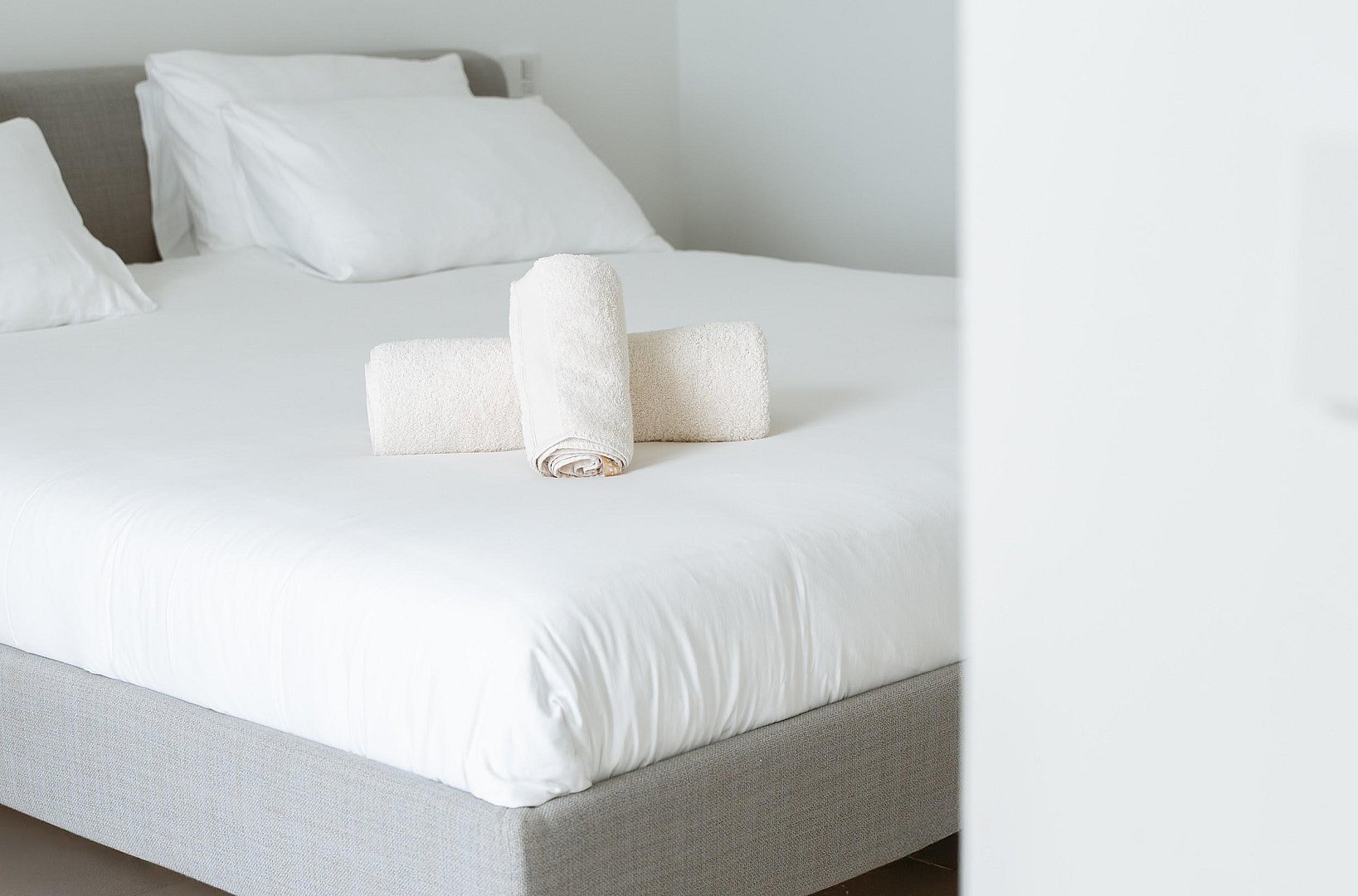 Jede der drei Hauptschlafzimmer-Suiten ist sorgfältig in neutralen Farbtönen und mit natürlichen Texturen gestaltet, was die ruhige Atmosphäre der Villa unterstreicht.