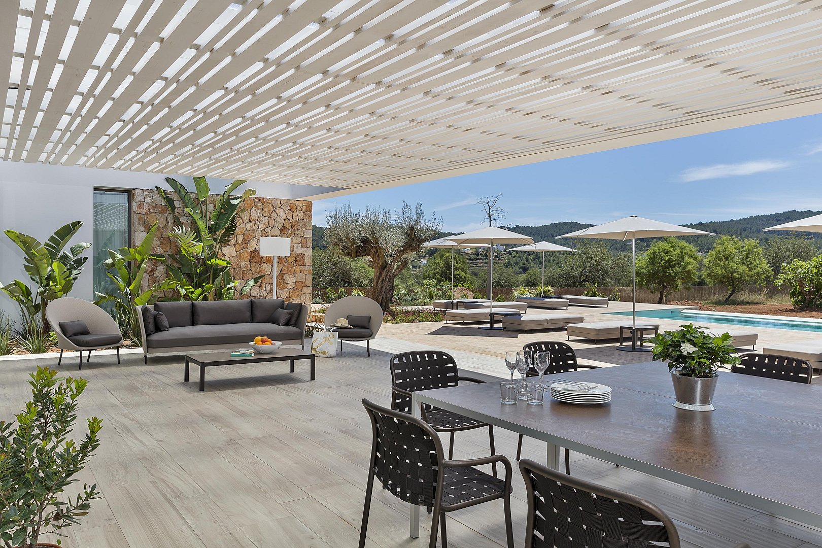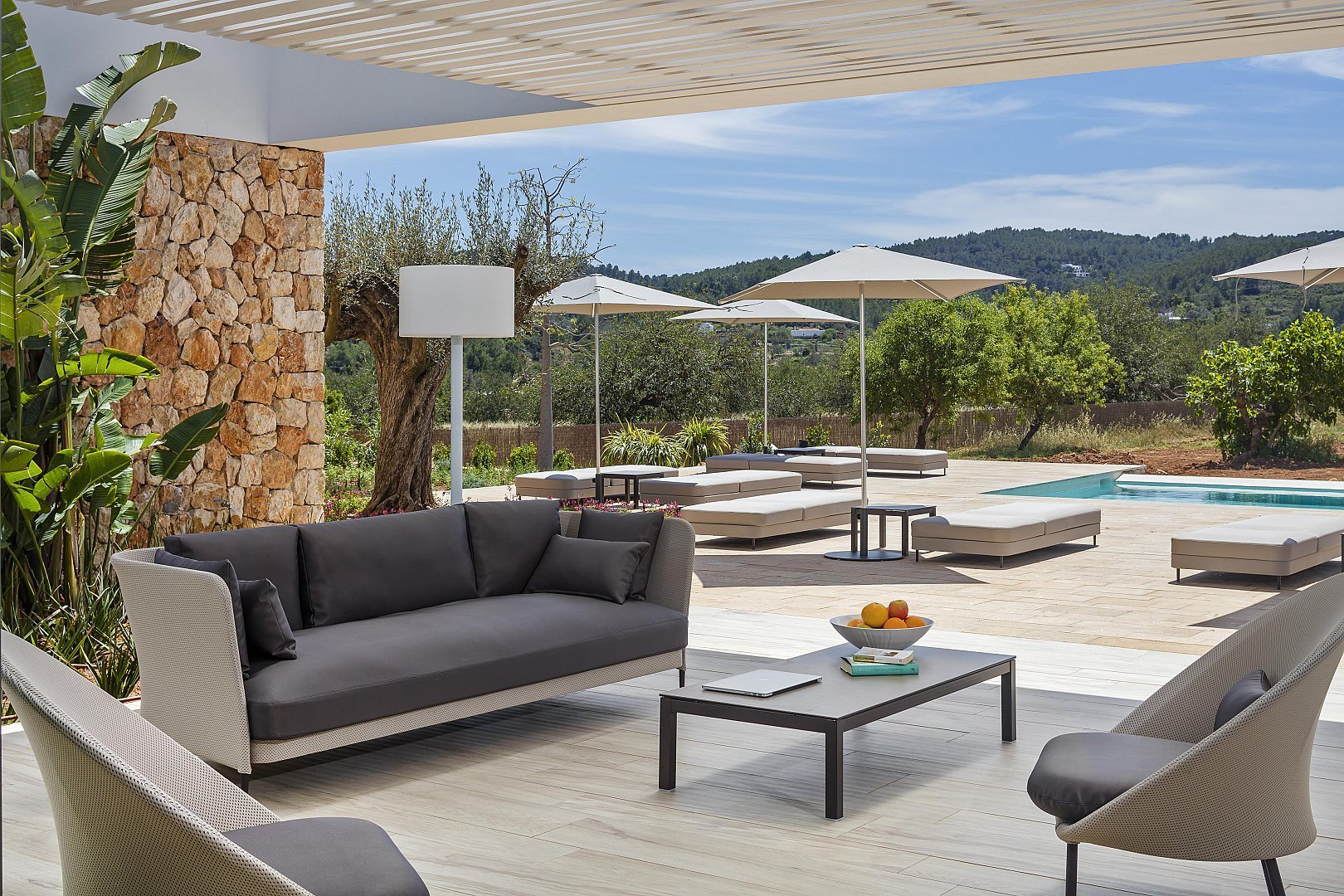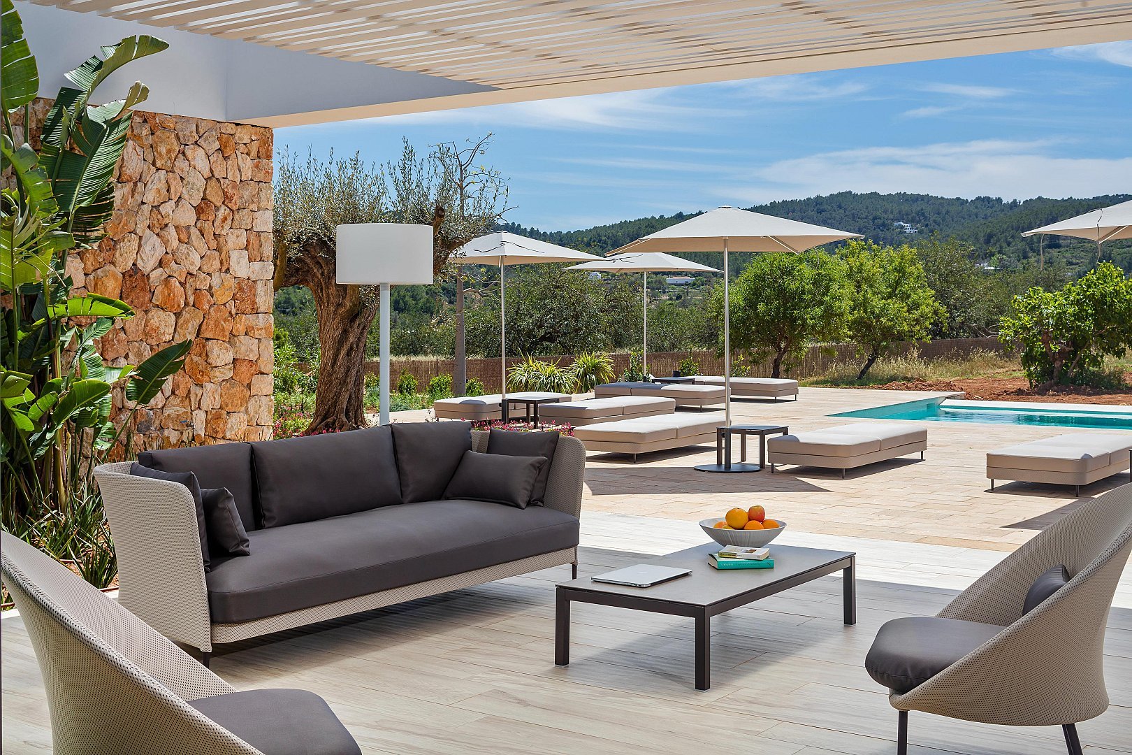 • Mehrere überdachte und offene Terrassen – Mit Sofas und Liegestühlen ausgestattet