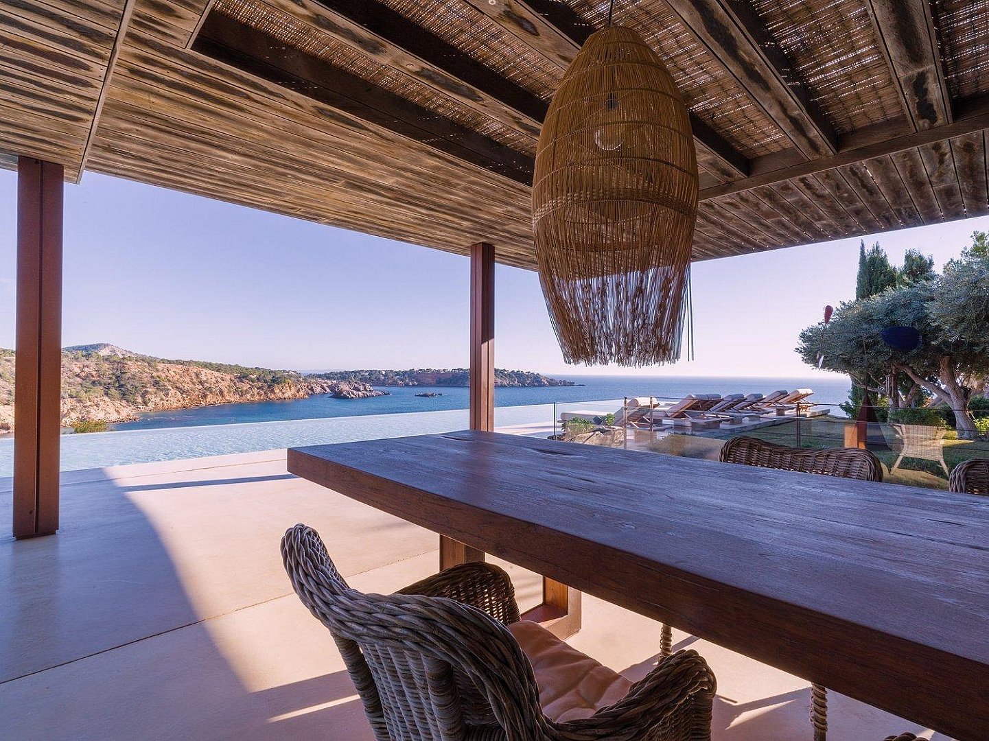 Diese atemberaubende Villa am Meer befindet sich in der prestigeträchtigen Wohnanlage Vista Alegre und bietet unvergleichlichen Luxus, Privatsphäre und einen atemberaubenden Blick auf das Mittelmeer. Die Villa liegt ideal in der Nähe von Cala Jondal, Es Torrent und Es Cubells und bietet einen Panoramablick nach Süden auf Porroig und Formentera.