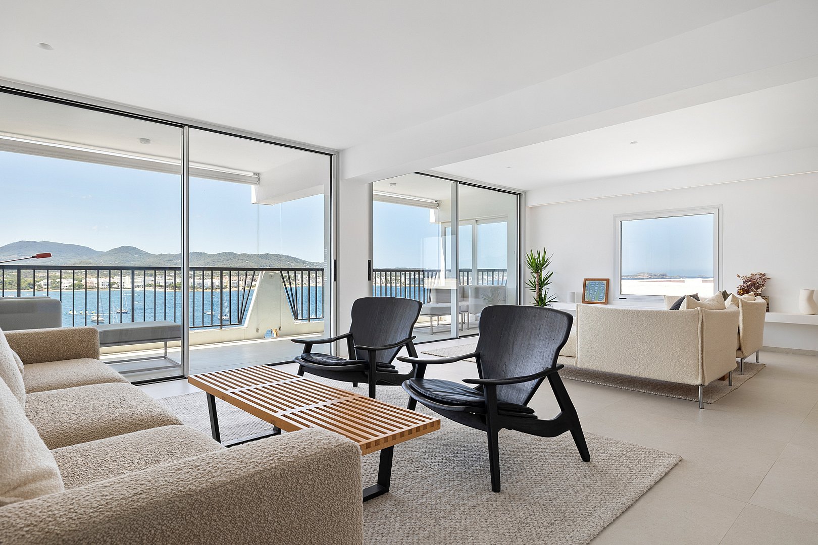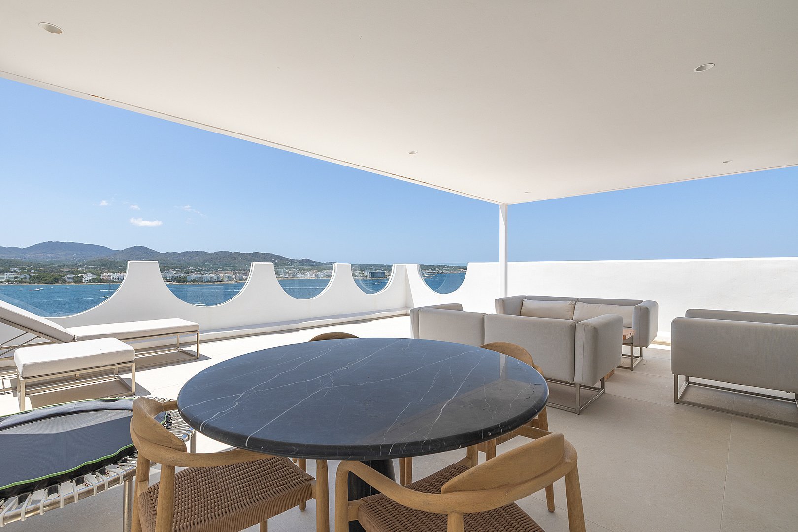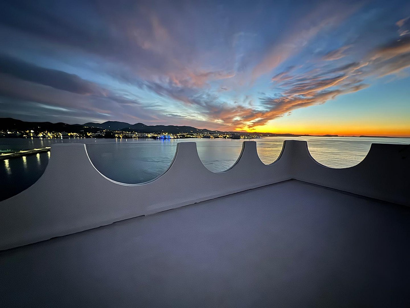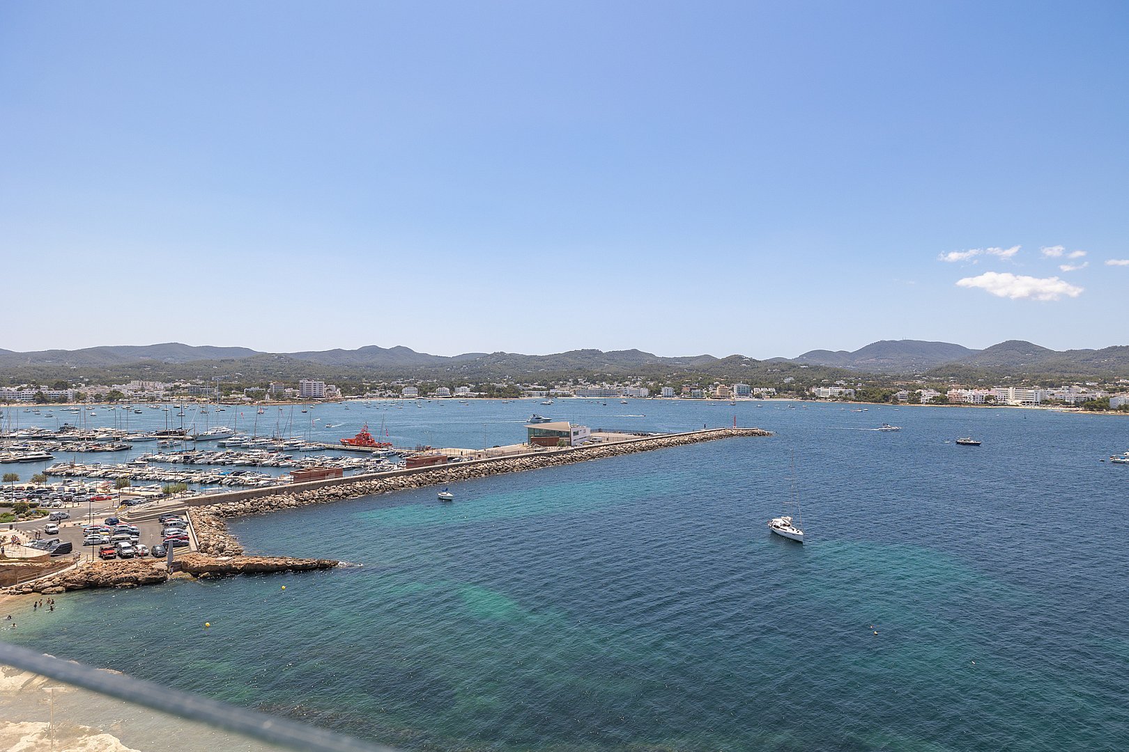 Dieses Apartment befindet sich in einzigartiger und ruhiger Lage direkt am Meer, nahe dem Hafen von San Antonio. Es liegt in der siebten Etage eines gepflegten Gebäudes und vereint Komfort, Qualität und Eleganz auf höchstem Niveau. Ein Highlight ist die großzügige private Dachterrasse mit herrlichem Blick auf das Meer und atemberaubende Sonnenuntergänge. Der großzügige Wohn- und Essbereich überzeugt durch Offenheit und Licht, ideal zum Entspannen oder für stilvolle Zusammenkünfte. Die Küche ist voll ausgestattet unter anderem mit Miele Dampf- und Mikrowellen-Grillöfen – und erfüllt höchste Ansprüche an Funktionalität und Design. Das Apartment verfügt über zwei geräumige Schlafzimmer sowie modernste Haustechnik: Zentrale Klimaanlage auf beiden Etagen für Heizung und Kühlung, sowie Fußbodenheizung auf beiden Ebenen für ganzjährigen Wohnkomfort. Zusätzlich steht ein weiteres Schlafzimmer im achten Stock zur Verfügung, das über ein Bad en Suite mit Badewanne verfügt. Die Lage ist strategisch günstig und dennoch ruhig, in unmittelbarer Nähe zum Strand sowie zu privater und öffentlicher Infrastruktur. Die gepflegte Wohnanlage bietet zudem einen Gemeinschaftspool.