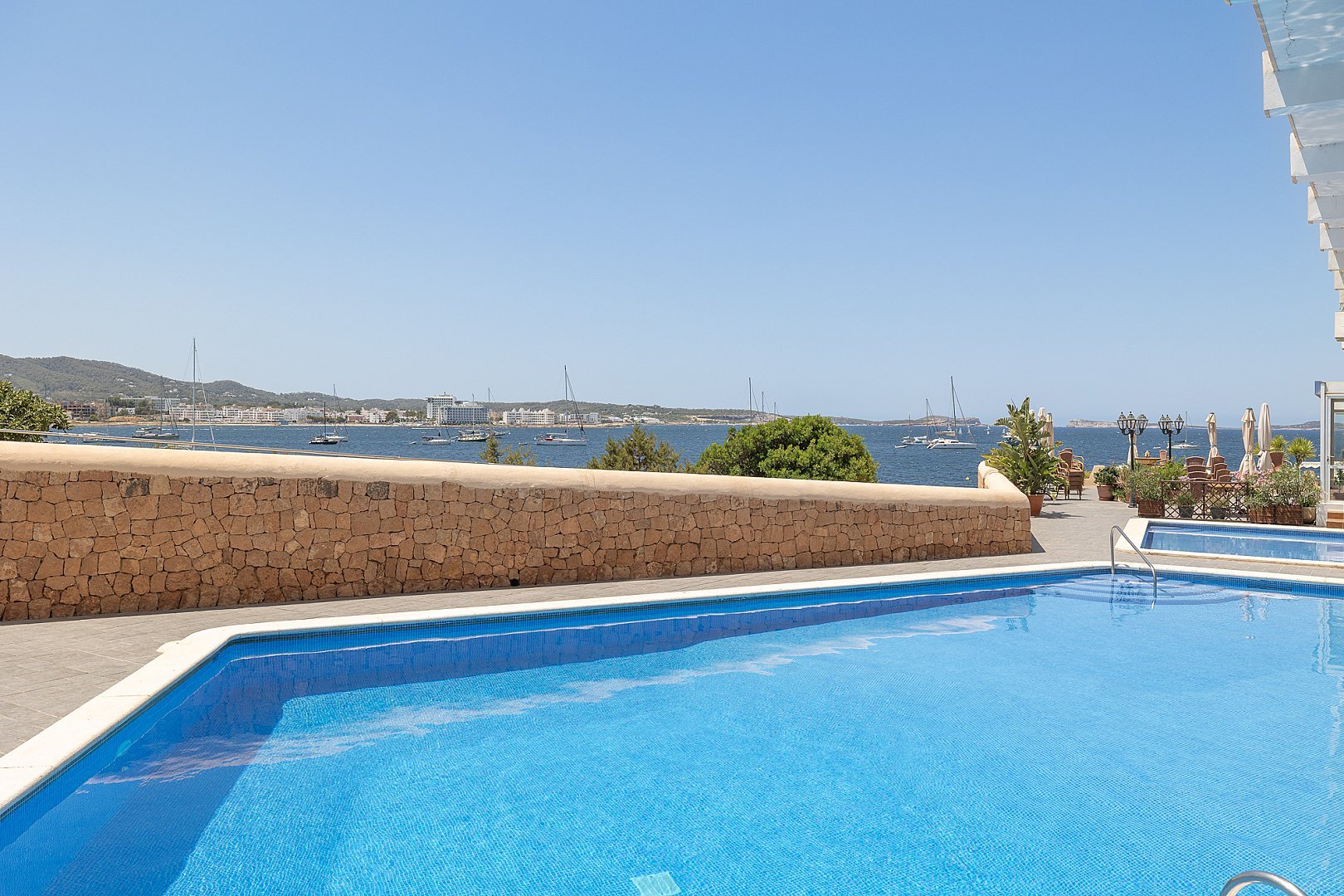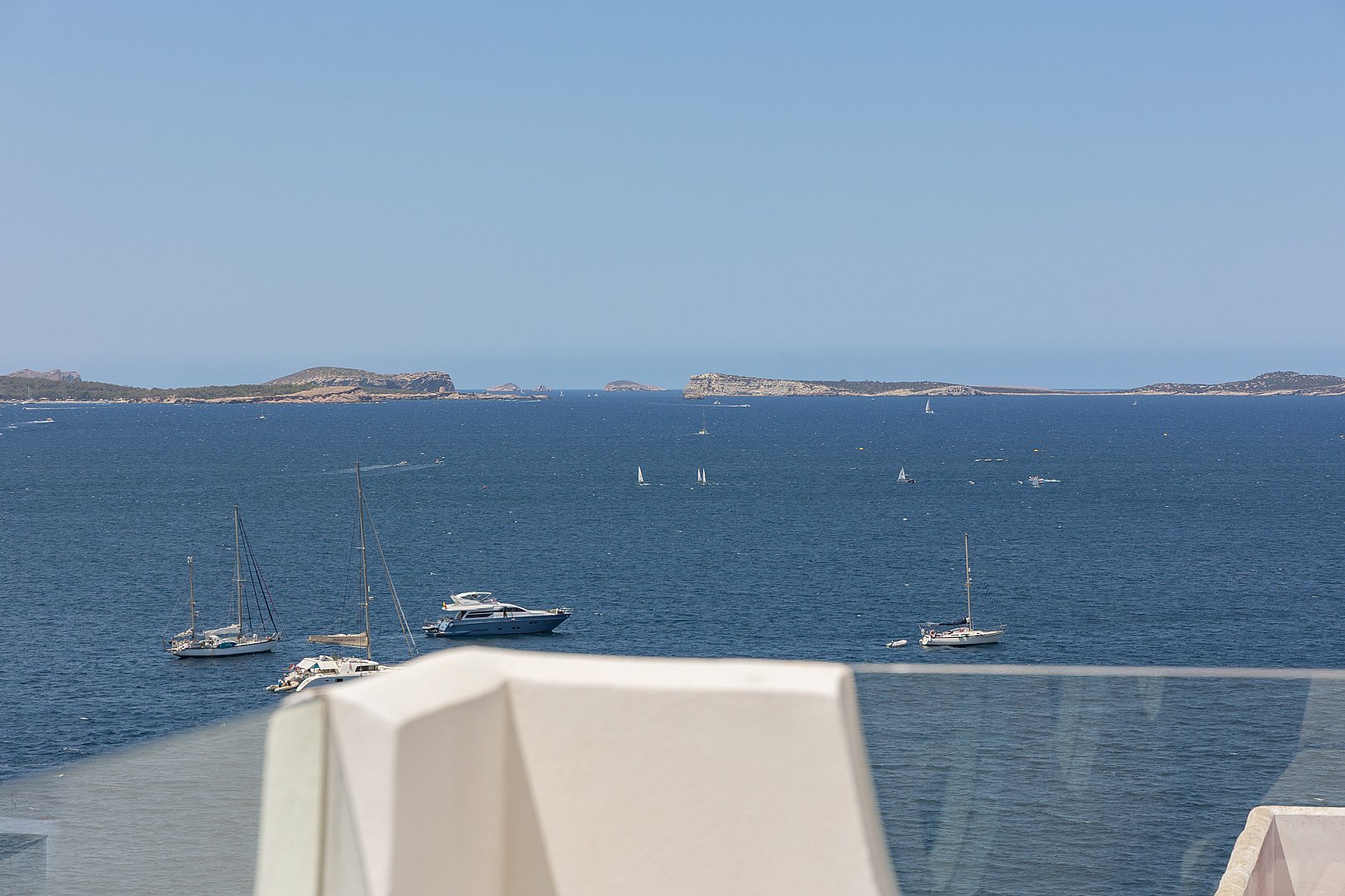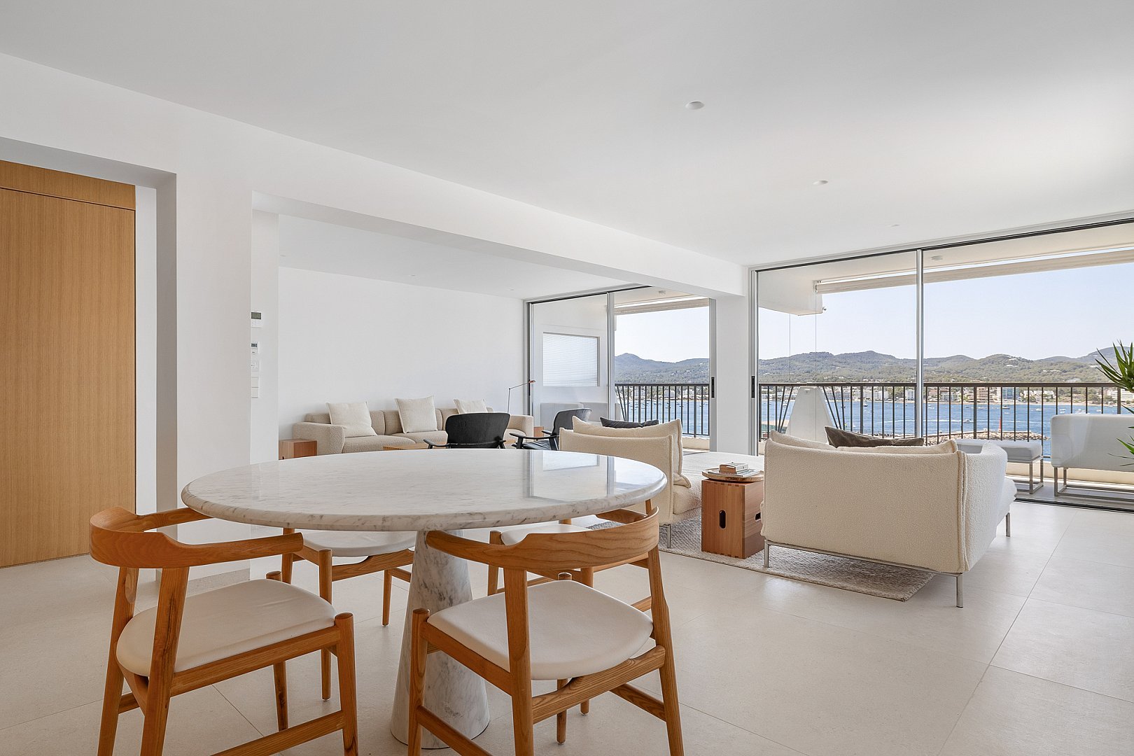 Dieses Apartment befindet sich in einzigartiger und ruhiger Lage direkt am Meer, nahe dem Hafen von San Antonio. Es liegt in der siebten Etage eines gepflegten Gebäudes und vereint Komfort, Qualität und Eleganz auf höchstem Niveau. Ein Highlight ist die großzügige private Dachterrasse mit herrlichem Blick auf das Meer und atemberaubende Sonnenuntergänge. Der großzügige Wohn- und Essbereich überzeugt durch Offenheit und Licht, ideal zum Entspannen oder für stilvolle Zusammenkünfte. Die Küche ist voll ausgestattet unter anderem mit Miele Dampf- und Mikrowellen-Grillöfen – und erfüllt höchste Ansprüche an Funktionalität und Design. Das Apartment verfügt über zwei geräumige Schlafzimmer sowie modernste Haustechnik: Zentrale Klimaanlage auf beiden Etagen für Heizung und Kühlung, sowie Fußbodenheizung auf beiden Ebenen für ganzjährigen Wohnkomfort. Zusätzlich steht ein weiteres Schlafzimmer im achten Stock zur Verfügung, das über ein Bad en Suite mit Badewanne verfügt. Die Lage ist strategisch günstig und dennoch ruhig, in unmittelbarer Nähe zum Strand sowie zu privater und öffentlicher Infrastruktur. Die gepflegte Wohnanlage bietet zudem einen Gemeinschaftspool.