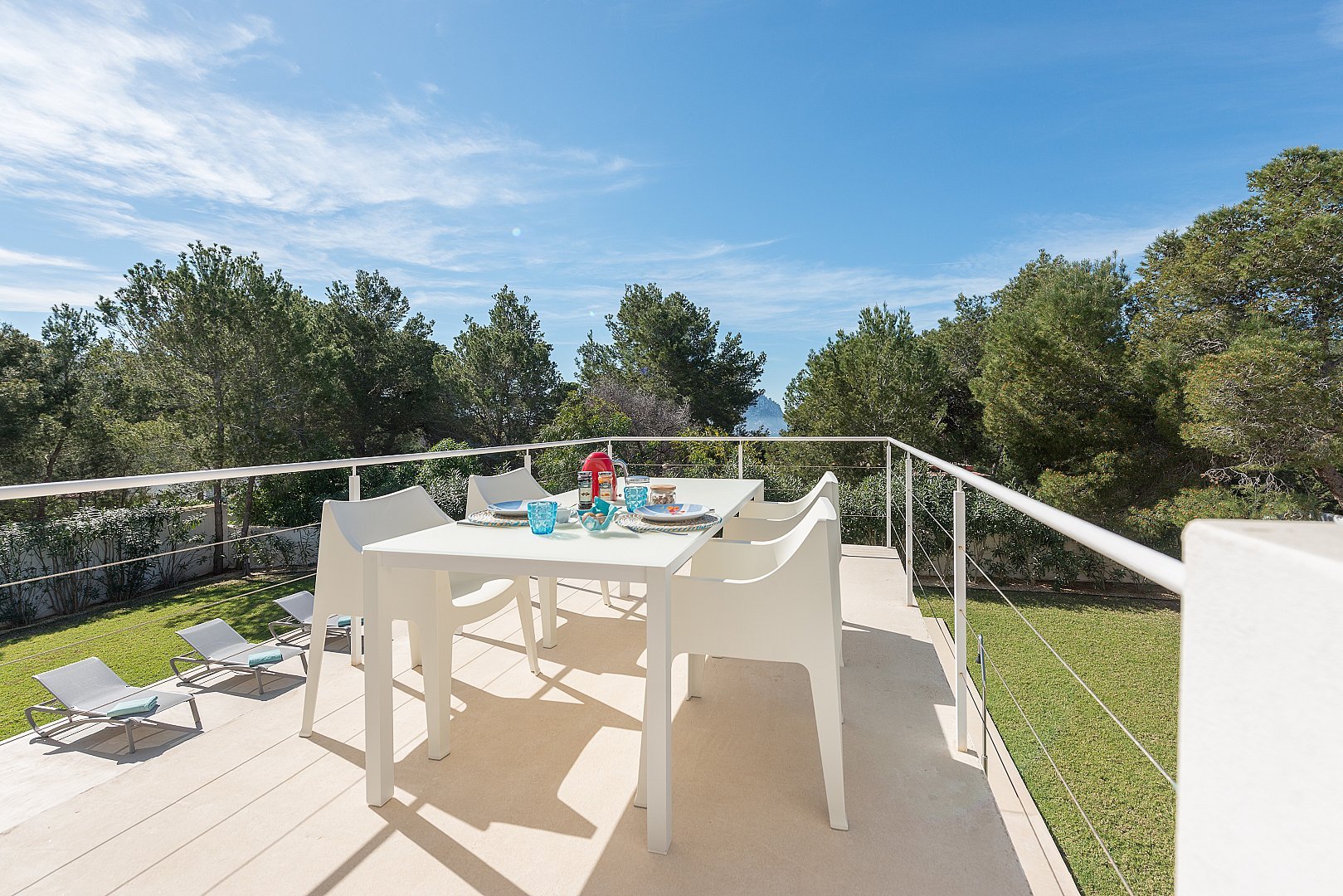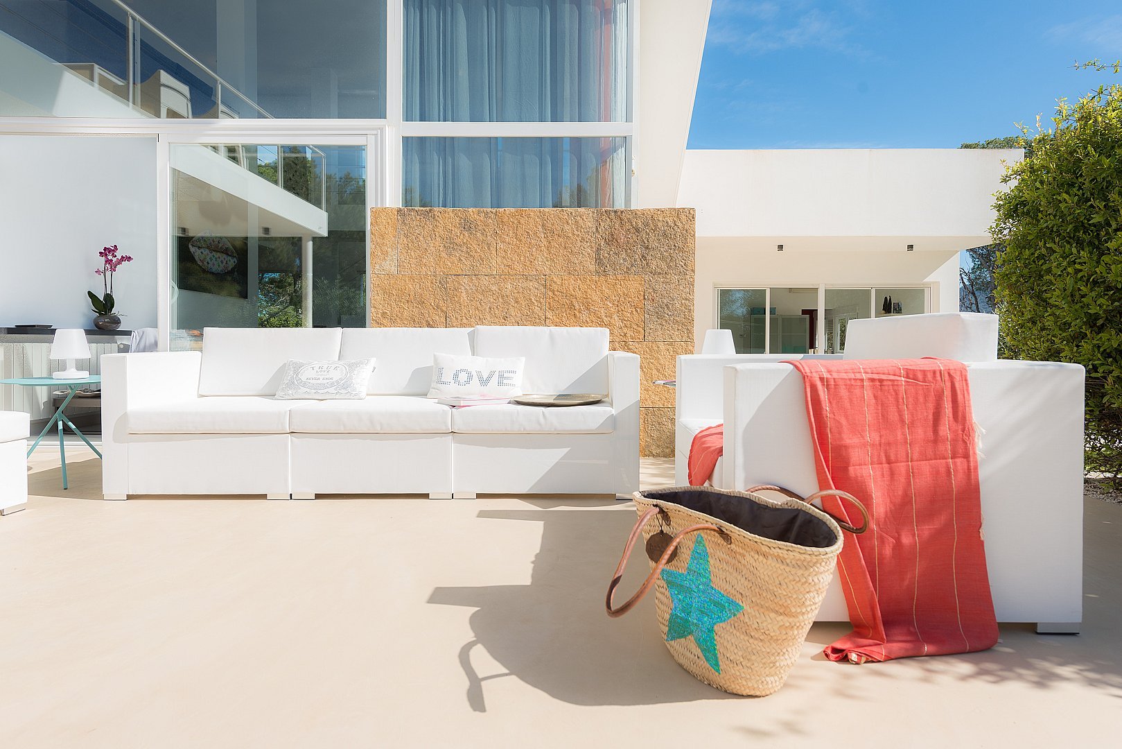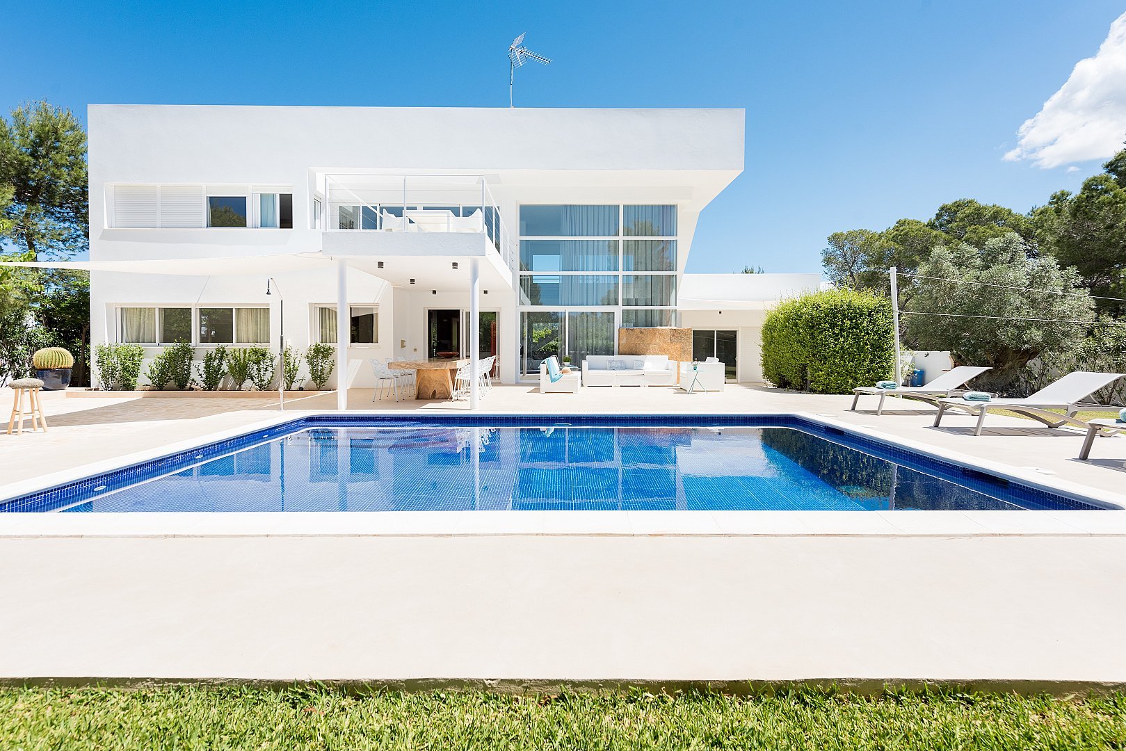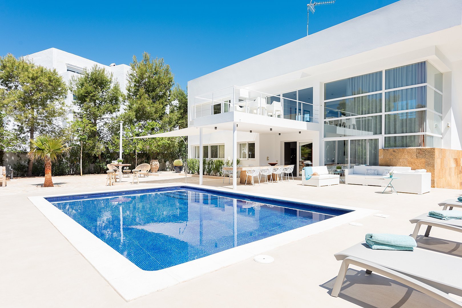 Dieses moderne, neu gebaute Haus befindet sich auf einem komplett eingezäunten Grundstück, mit einem schönen Garten und mehreren Terrassen rund um den Pool, in Strandnähe im südlichen Teil der Cala Vadella. Das Haupthaus besteht aus zwei Ebenen. Das geräumige Wohn-/Esszimmer, die Küche und vier Schlafzimmer befinden sich im Erdgeschoss. Über eine offene Treppe erreicht man das Haupt-Schlafzimmer und einen großen Chill-out-Bereich, von welchem aus man den unteren Wohnbereich überblickt. Von der oberen Etage hat man einen Ausblick auf Es Vedra und die s'Espartar-Inseln. Das separate Gästehaus verfügt über eine eigene Küche, ein Schlafzimmer und zwei Bäder. Eine Garage für drei Autos macht das Haus komplett. Eine zusätzliche Mietlizenz macht die Investition perfekt.