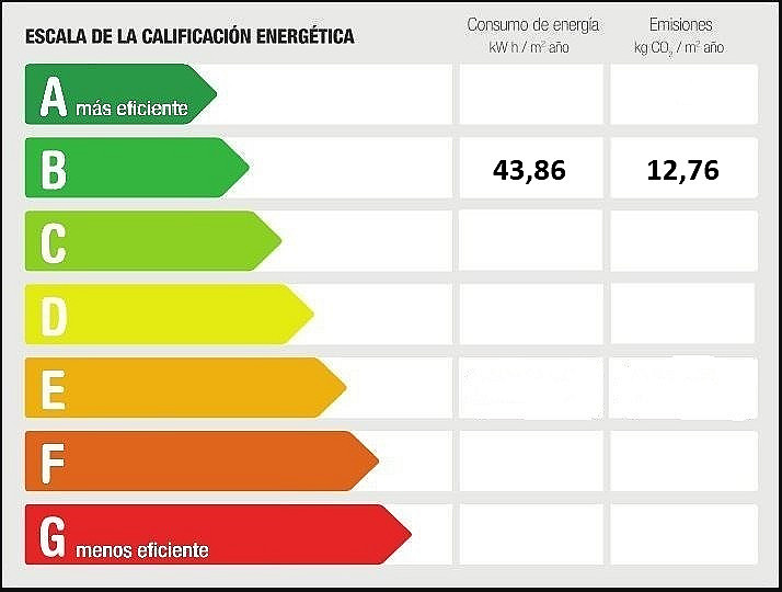 Baujahr 2022 · Energieverbrauchskennwert 43.86 kWh/(m2*a) · CO2-Emission 12.76 kg/m2 · CO2 Emissionsklasse B · Energieeffizienzklasse B