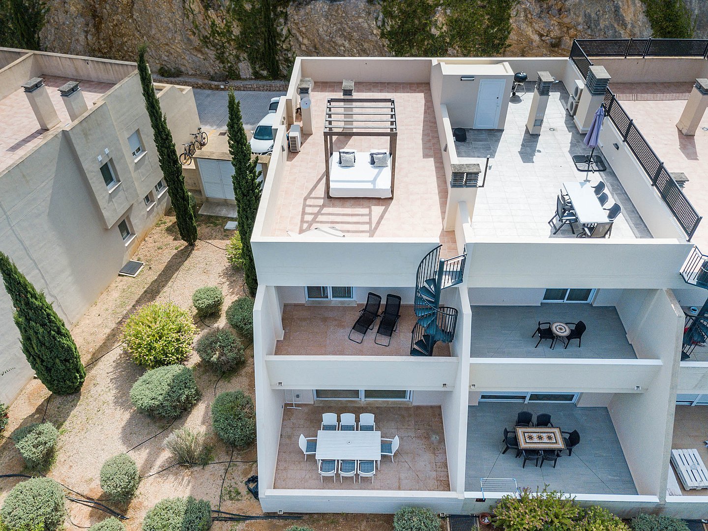 *JAHRESMIETE* Dieses moderne Stadthaus befindet sich in der exklusiven Wohnanlage von Roca Llisa am Fuße des Golfplatzes. Das Stadthaus ist renoviert, möbliert und mit allem Komfort ausgestattet, um das ganze Jahr zu leben. Im Erdgeschoss befindet sich das Wohnzimmer mit Zugang zur Terrasse, eine vollausgestattete Offene Küche mit Markengeräten, ein Doppelzimmer, ein Einzelbettzimmer und eine Waschküche. Im Obergeschoss befindet sich das Hauptschlafzimmer mit Badezimmer en Suite, Zugang zur Terrasse, ein Doppelbettzimmer und ein Badezimmer. Auf dem Dach finden wir ein 60m2 großes Solarium mit Bali Bett und Landschaftsblick. Ein 24-Stunden-Sicherheitsdienst, ein Parkplatz und ein Gemeinschaftsschwimmbad vervollständigen dieses Angebot.