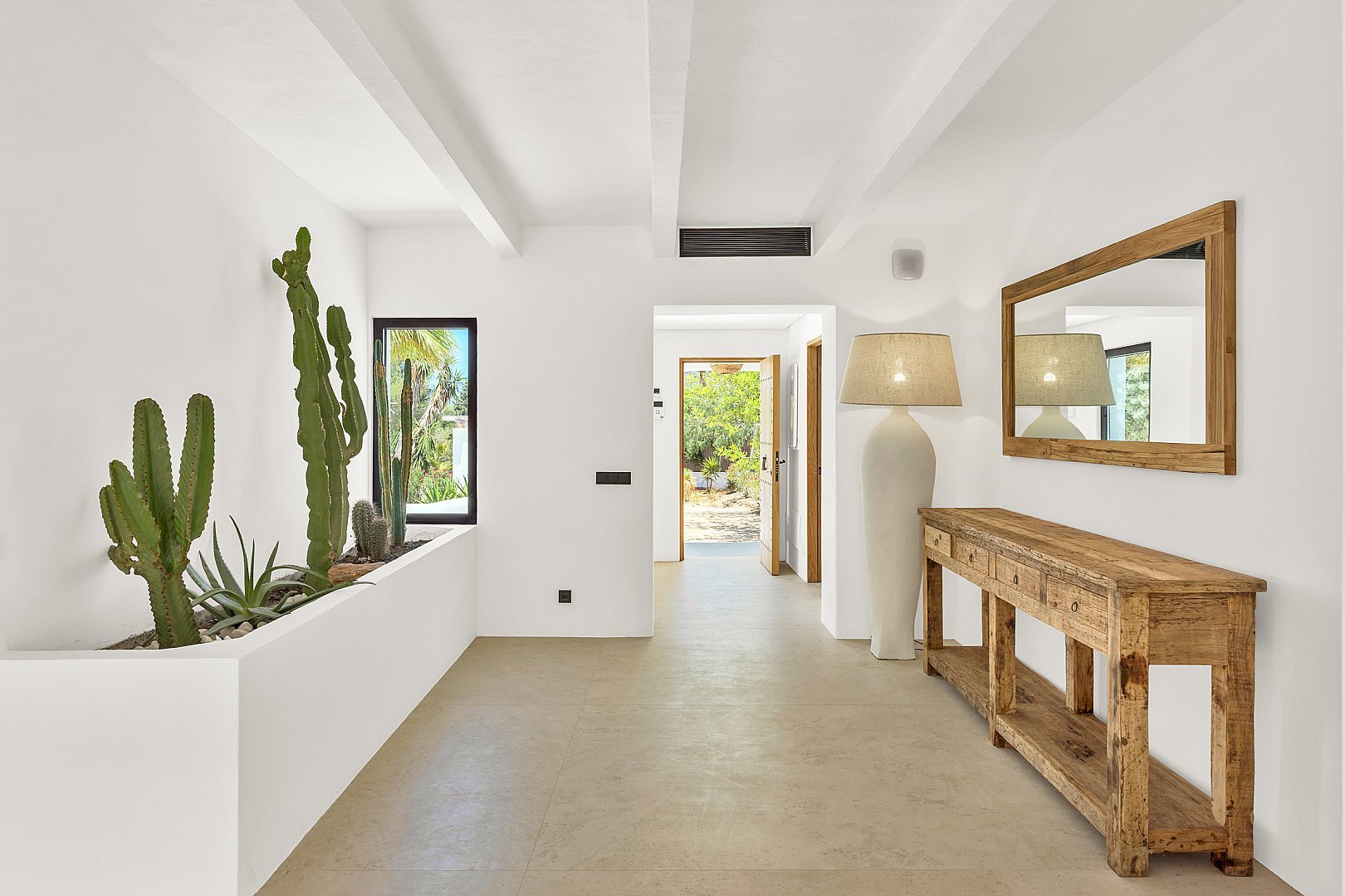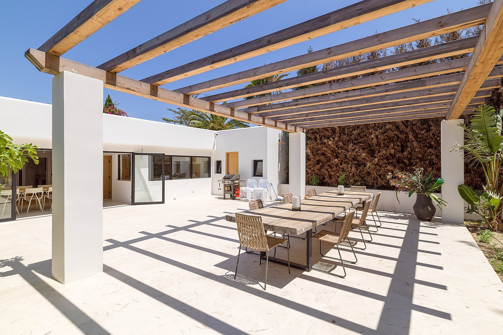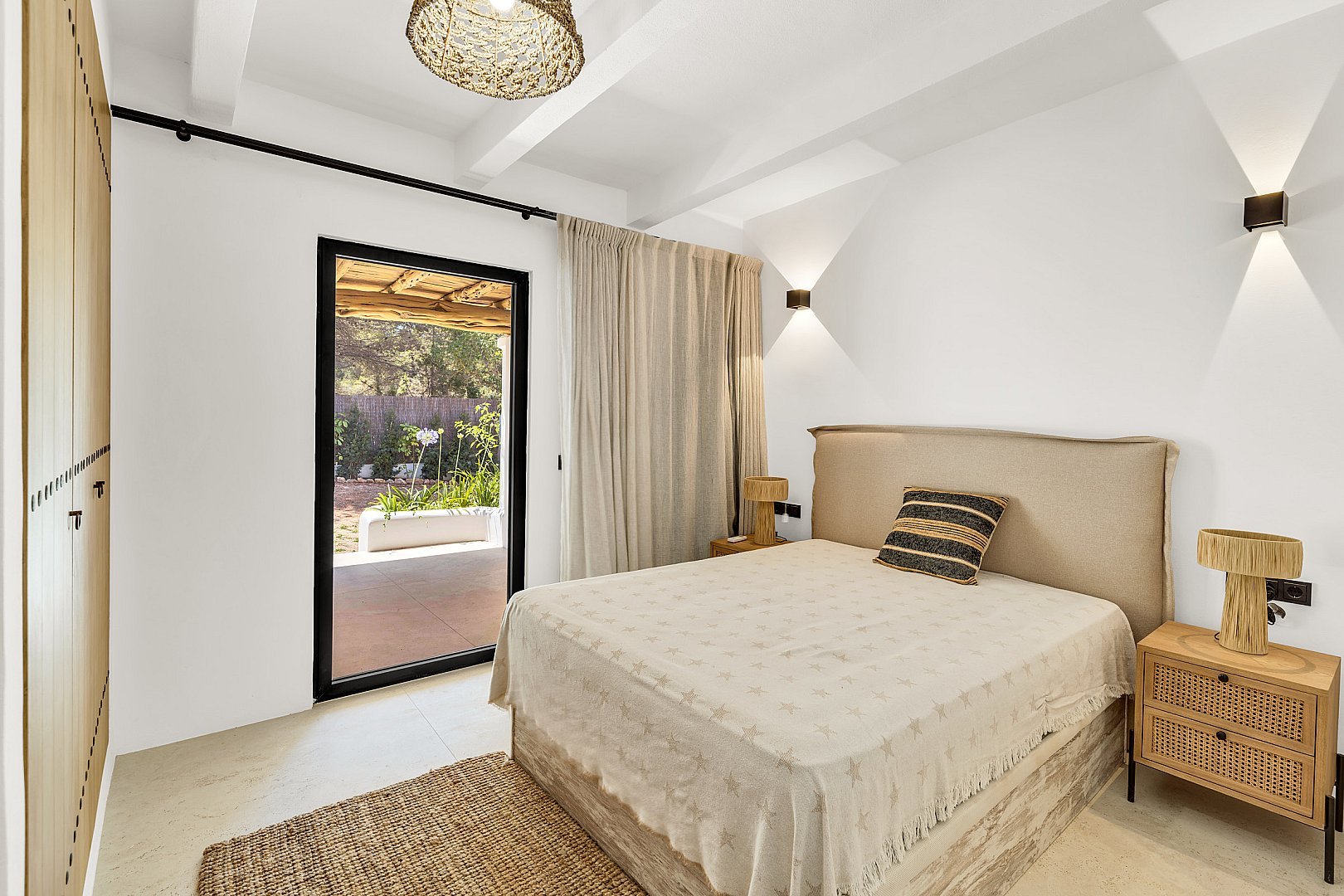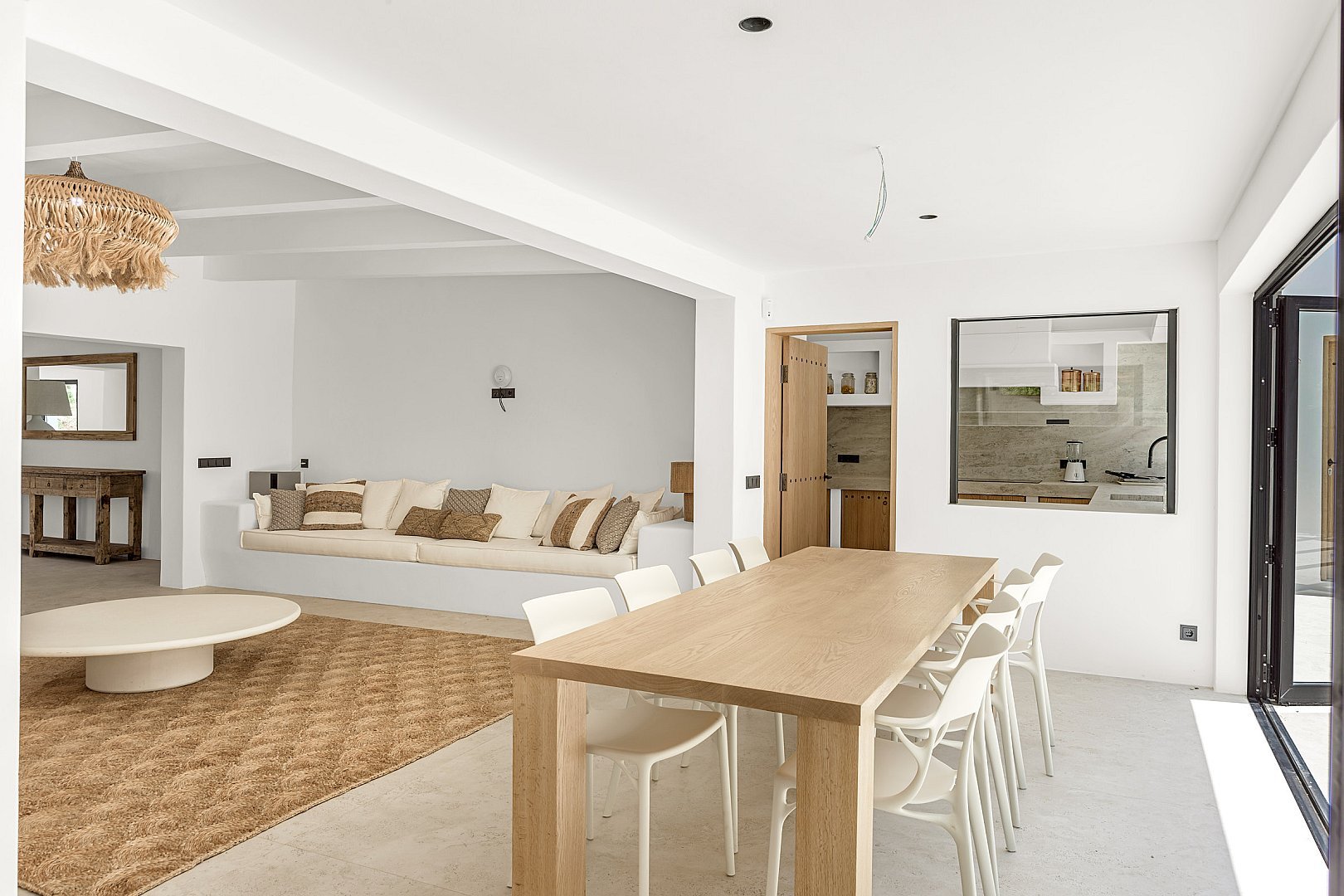 Diese umfassend und hochwertig renovierte Villa vereint zeitgemäße Eleganz mit funktionalem Wohnen auf einer Ebene. Das Haupthaus verfügt über vier großzügige Schlafzimmer mit jeweils eigenem Bad sowie über eine moderne, offen gestaltete Wohnküche mit direktem Zugang zu den Wohn- und Essbereichen. Der Raum ist durch große Fensterflächen lichtdurchflutet und schafft ein angenehmes Wohnambiente. Ein angrenzender, bereits installierter Anbau (inkl. Leitungen und Elektrik) bietet weiteres Potenzial – etwa für eine Gästesuite, ein Büro oder Atelier. Das komplett möblierte Haus wird bezugsfertig angeboten. Die Ausstattung wurde geschmackvoll und hochwertig gewählt. Über eine ruhige Nebenstraße erreichbar, bietet das Anwesen eine private Zufahrt mit überdachtem Doppelcarport. Die großzügigen Terrassenflächen an Vorder- und Rückseite des Hauses schaffen vielfältige Möglichkeiten für Aufenthalte im Freien. Der angelegte Garten mit altem Baumbestand bietet Schatten und Privatsphäre. Das Grundstück ist flach und pflegeleicht und eignet sich ideal für Familien, die ein sofort nutzbares Ferien- oder Dauerwohnsitz suchen – ebenso wie für Kapitalanleger, die eine wertstabile Immobilie in einer der gefragtesten Lagen im ländlichen Ibiza erwerben möchten.