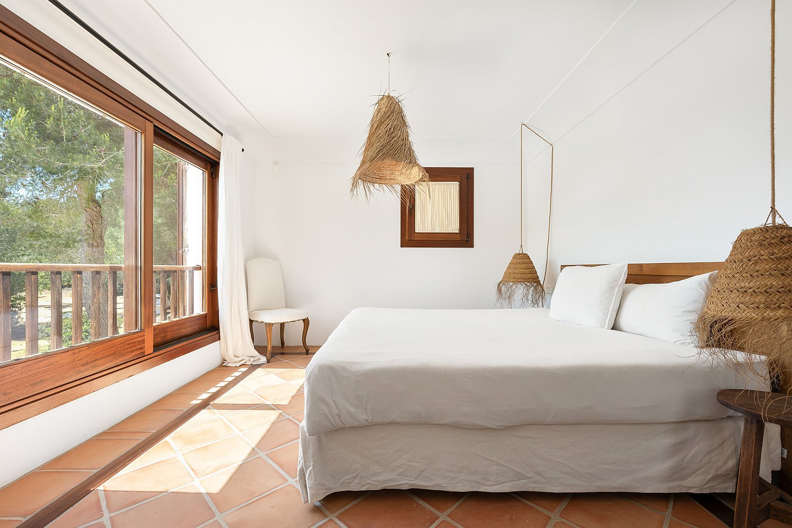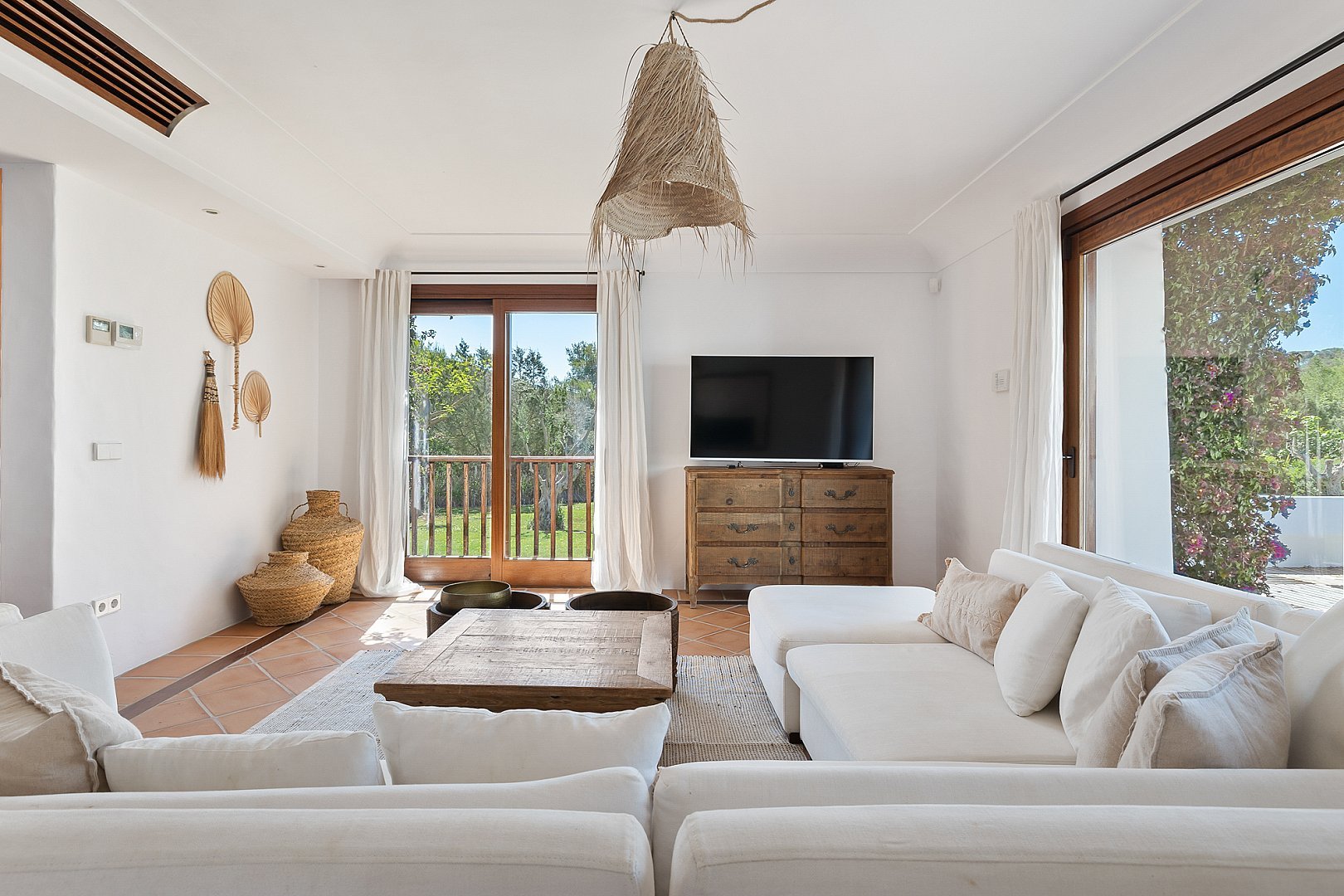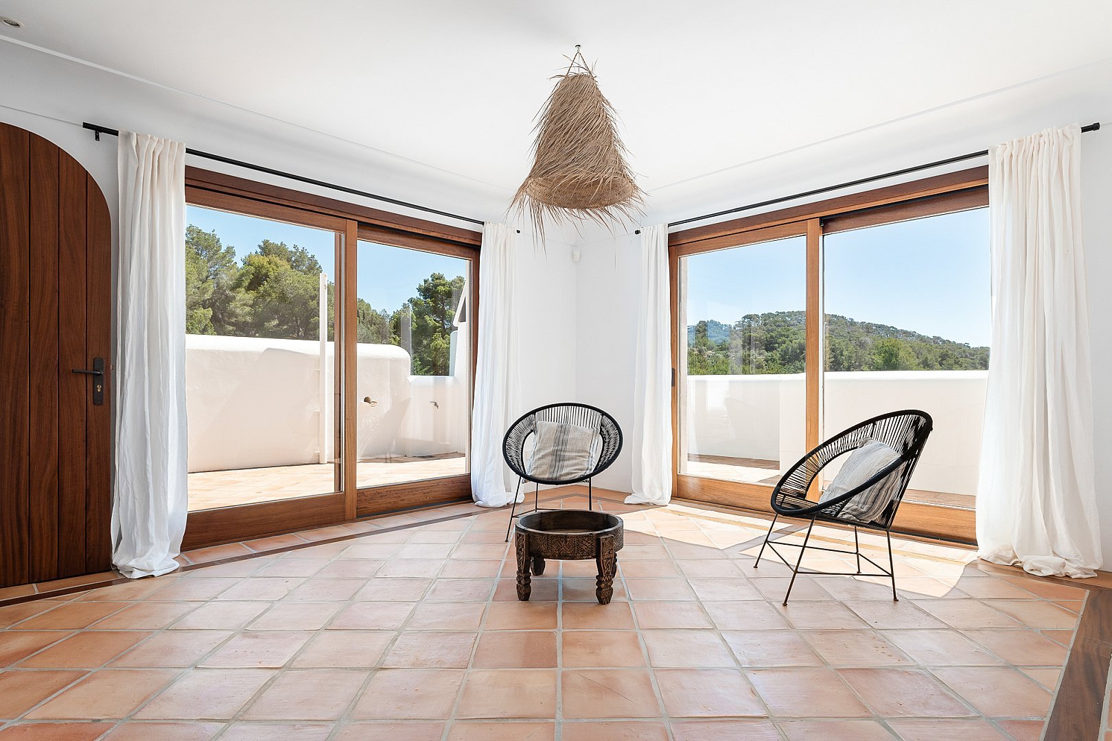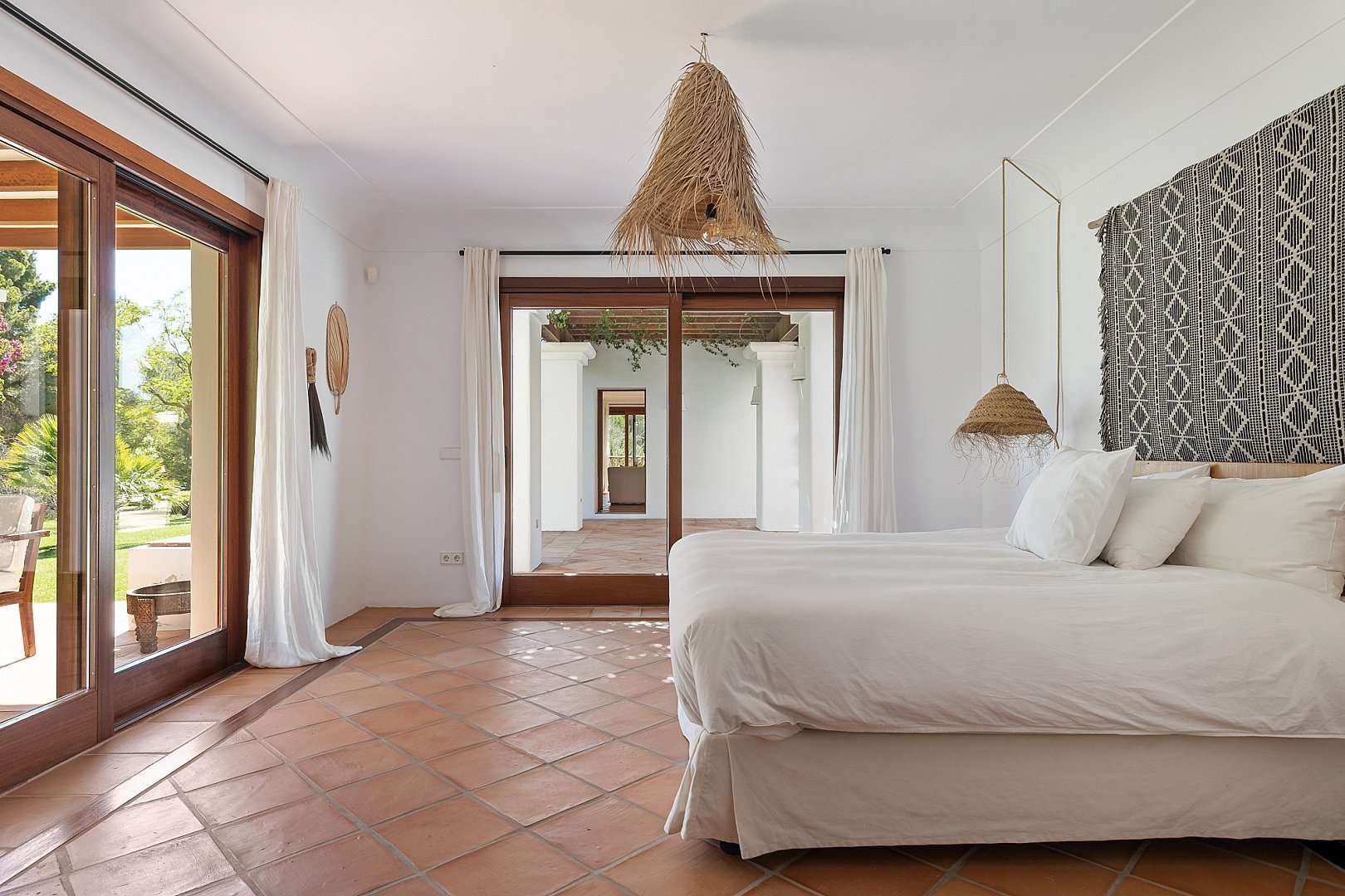 Diese atemberaubende Finca, eingebettet in die ruhige Landschaft Ibizas, bietet einen luxuriösen und friedlichen Rückzugsort. Das Anwesen liegt etwas außerhalb des begehrten Dorfes Jesús und verfügt über fünf geräumige Schlafzimmer, jedes mit eigenem Eingang und begehbarem Kleiderschrank, sowie ein separates Personalhaus. Beim Betreten des Anwesens werden Sie von einer wunderschönen, von Zypressen gesäumten Einfahrt begrüßt, die zu einem Innenhof mit Springbrunnen und Jasminblüten führt. Das Innere der Finca verfügt über eine großzügige offene Küche, einen Essbereich und ein Wohnzimmer mit großem Kamin. Die großen Fenster verbinden nahtlos den Innen- und Außenbereich und schaffen eine perfekte Harmonie zwischen beiden. Im Erdgeschoss befinden sich drei geräumige Gästezimmer, jedes mit begehbarem Kleiderschrank, Badezimmer mit Badewanne und Dusche sowie Zugang zu einer privaten Terrasse, die zum Garten oder Pool führt. Die Turmsuite verfügt über ein Wohnzimmer, eine Gästetoilette und ein Schlafzimmer mit atemberaubendem Blick auf die umliegende Grünanlage. Die Master-Suite, die sich im anderen Flügel befindet, verfügt über ein Wohnzimmer, ein Schlafzimmer und ein Badezimmer sowie eine private Terrasse mit atemberaubendem Blick auf die Landschaft. Der üppige Garten bietet viele Möglichkeiten, darunter einen Grillplatz unter einem schönen Baum und Platz zum Anpflanzen von eigenem Gemüse und Obstbäumen. Das Anwesen verfügt außerdem über einen großen Pool mit viel Platz für Sonnenliegen und Chill-out-Bereiche, ideal für Familienfeiern und Treffen mit Freunden. Die Finca verfügt außerdem über eine Dachterrasse mit Blick auf die Berge, einen Fitnessraum, der sowohl als Innen- als auch als Außenbereich genutzt werden kann, und Parkplätze für über 10 Autos. Wenn Sie auf der Suche nach einem luxuriösen und ruhigen Rückzugsort auf dem Land von Ibiza sind, ist diese Finca eine großartige Gelegenheit. Mit ihrem traditionellen ibizenkischen Stil, den dicken Mauern und den großen Fenstern bietet diese Immobilie die perfekte Mischung aus rustikalem Charme und modernem Luxus.