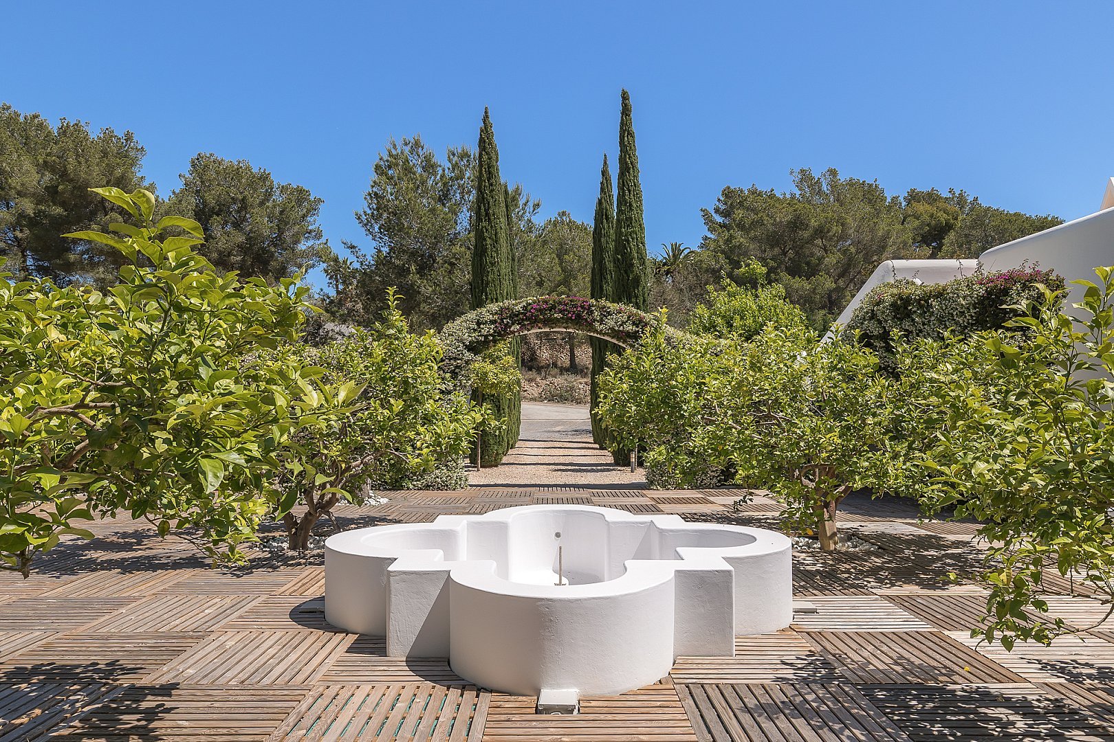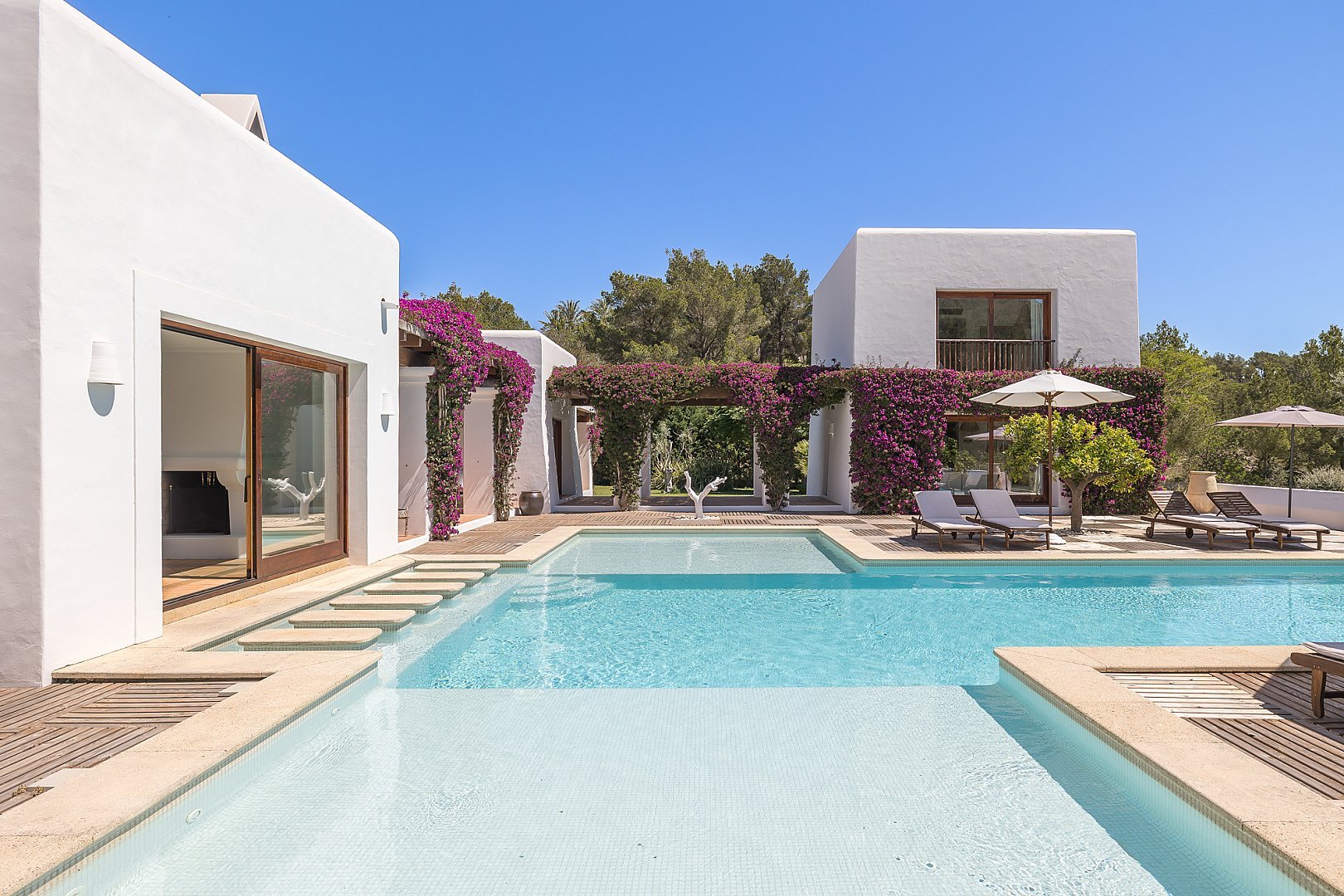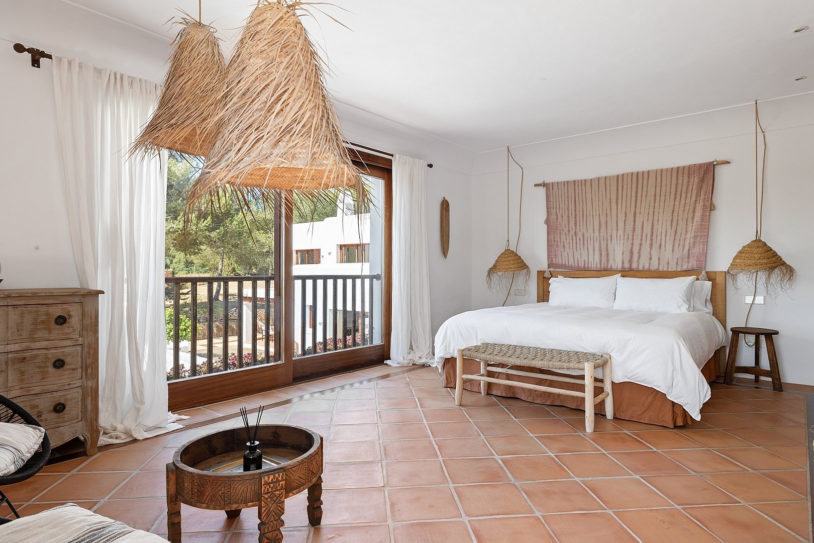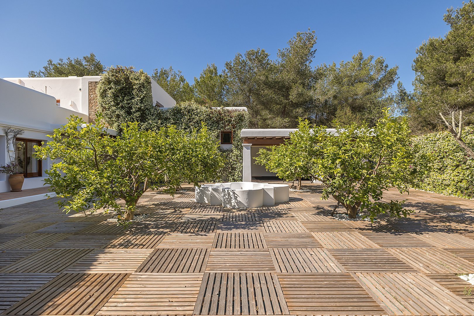 Diese atemberaubende Finca, eingebettet in die ruhige Landschaft Ibizas, bietet einen luxuriösen und friedlichen Rückzugsort. Das Anwesen liegt etwas außerhalb des begehrten Dorfes Jesús und verfügt über fünf geräumige Schlafzimmer, jedes mit eigenem Eingang und begehbarem Kleiderschrank, sowie ein separates Personalhaus. Beim Betreten des Anwesens werden Sie von einer wunderschönen, von Zypressen gesäumten Einfahrt begrüßt, die zu einem Innenhof mit Springbrunnen und Jasminblüten führt. Das Innere der Finca verfügt über eine großzügige offene Küche, einen Essbereich und ein Wohnzimmer mit großem Kamin. Die großen Fenster verbinden nahtlos den Innen- und Außenbereich und schaffen eine perfekte Harmonie zwischen beiden. Im Erdgeschoss befinden sich drei geräumige Gästezimmer, jedes mit begehbarem Kleiderschrank, Badezimmer mit Badewanne und Dusche sowie Zugang zu einer privaten Terrasse, die zum Garten oder Pool führt. Die Turmsuite verfügt über ein Wohnzimmer, eine Gästetoilette und ein Schlafzimmer mit atemberaubendem Blick auf die umliegende Grünanlage. Die Master-Suite, die sich im anderen Flügel befindet, verfügt über ein Wohnzimmer, ein Schlafzimmer und ein Badezimmer sowie eine private Terrasse mit atemberaubendem Blick auf die Landschaft. Der üppige Garten bietet viele Möglichkeiten, darunter einen Grillplatz unter einem schönen Baum und Platz zum Anpflanzen von eigenem Gemüse und Obstbäumen. Das Anwesen verfügt außerdem über einen großen Pool mit viel Platz für Sonnenliegen und Chill-out-Bereiche, ideal für Familienfeiern und Treffen mit Freunden. Die Finca verfügt außerdem über eine Dachterrasse mit Blick auf die Berge, einen Fitnessraum, der sowohl als Innen- als auch als Außenbereich genutzt werden kann, und Parkplätze für über 10 Autos. Wenn Sie auf der Suche nach einem luxuriösen und ruhigen Rückzugsort auf dem Land von Ibiza sind, ist diese Finca eine großartige Gelegenheit. Mit ihrem traditionellen ibizenkischen Stil, den dicken Mauern und den großen Fenstern bietet diese Immobilie die perfekte Mischung aus rustikalem Charme und modernem Luxus.