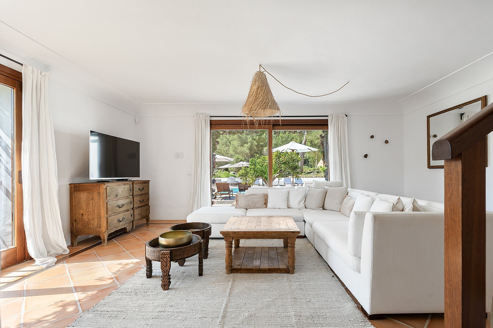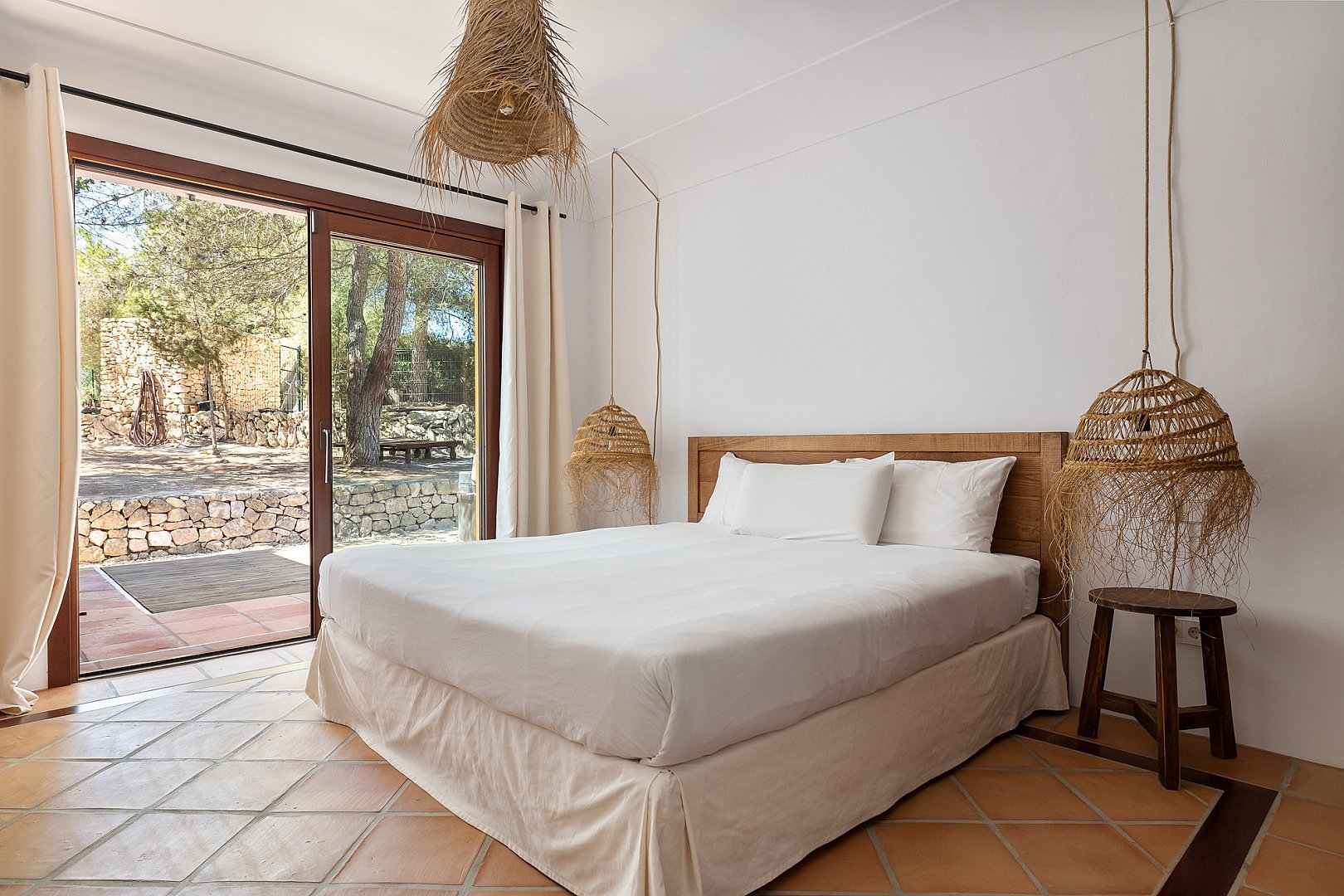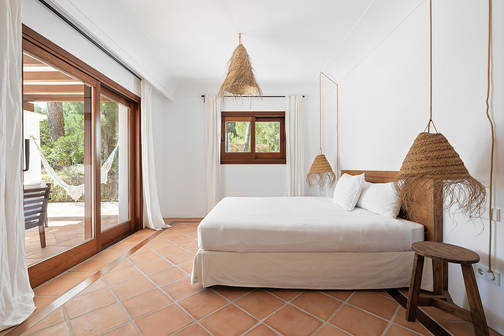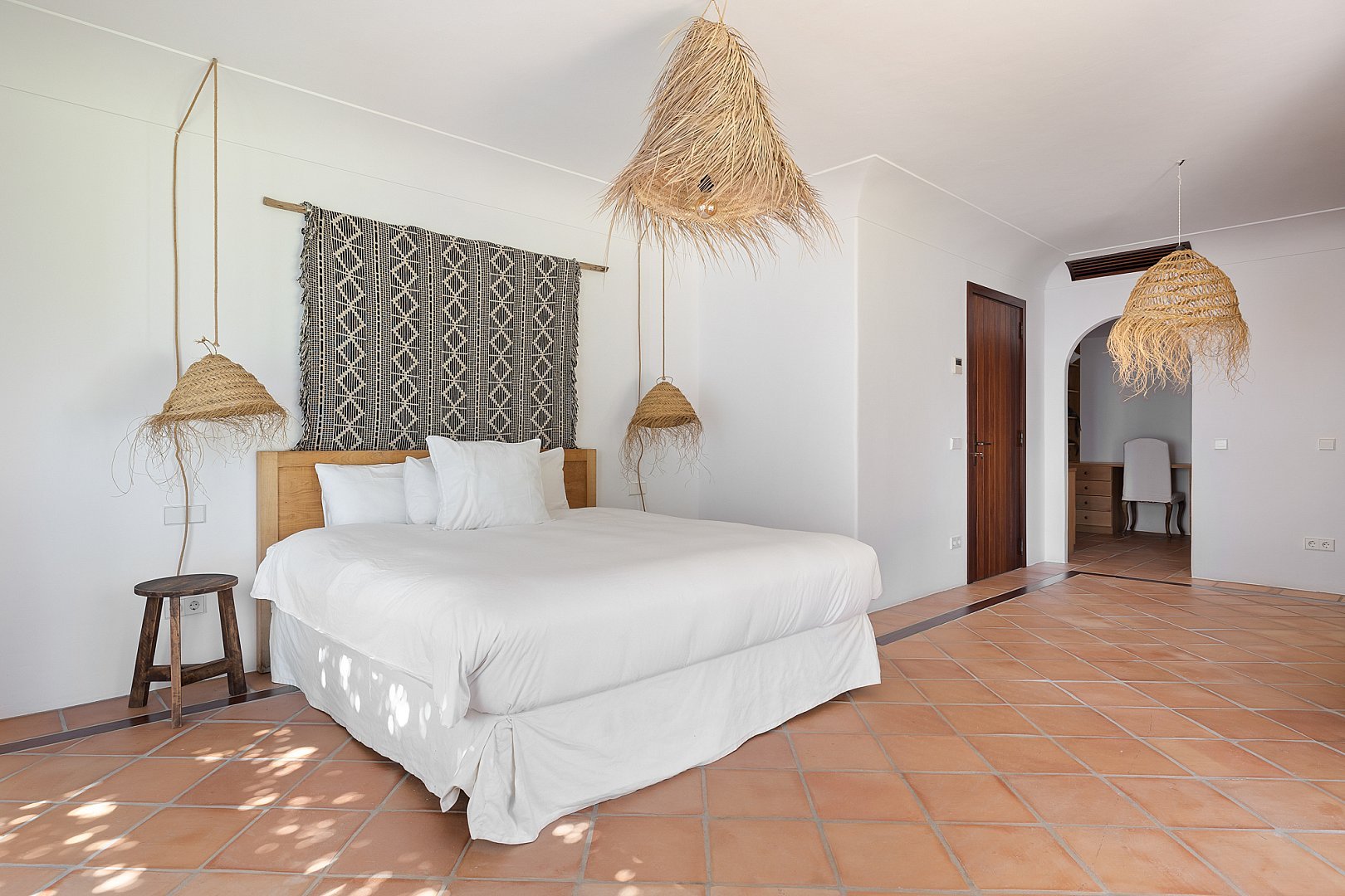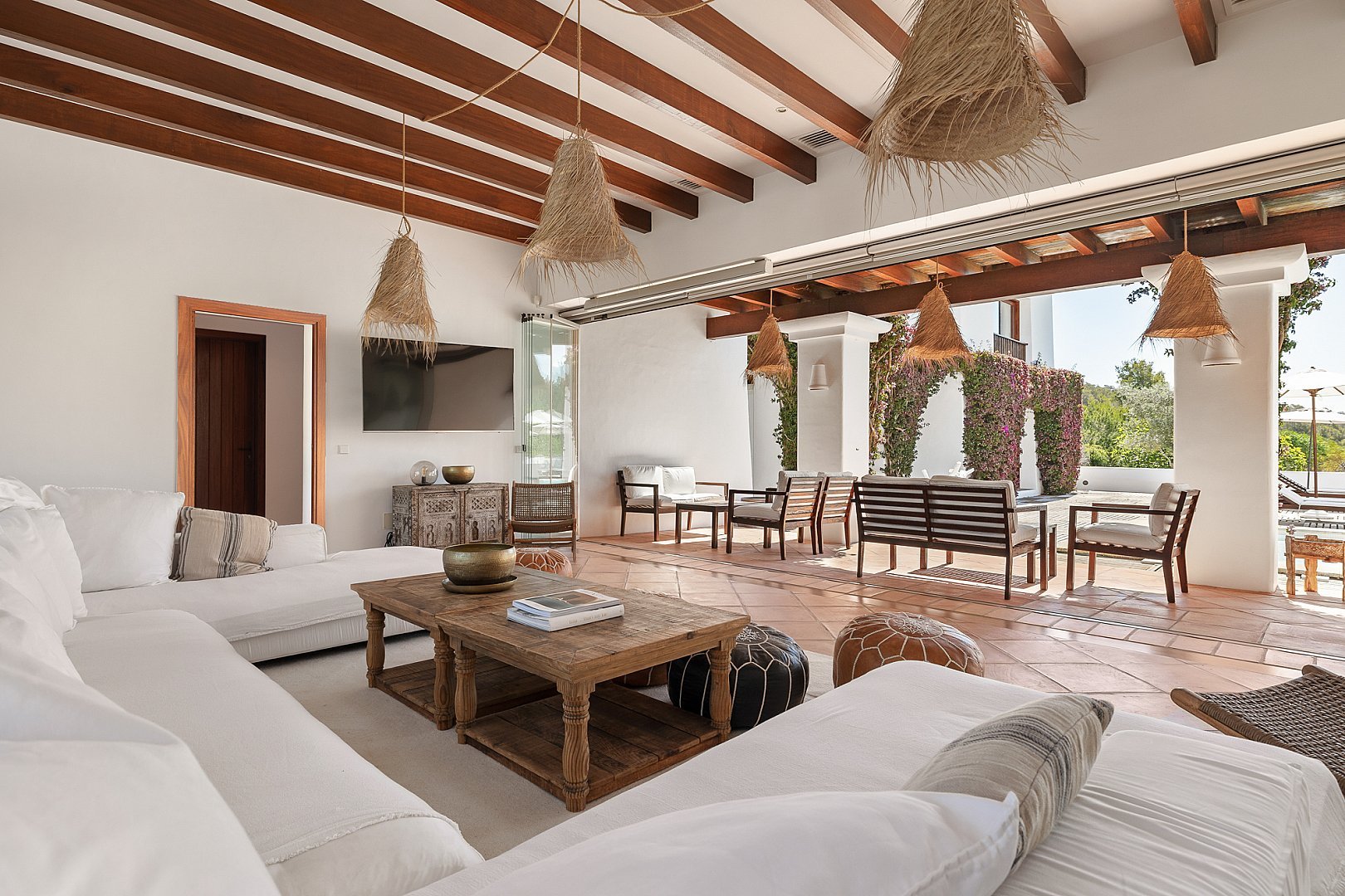 Diese atemberaubende Finca, eingebettet in die ruhige Landschaft Ibizas, bietet einen luxuriösen und friedlichen Rückzugsort. Das Anwesen liegt etwas außerhalb des begehrten Dorfes Jesús und verfügt über fünf geräumige Schlafzimmer, jedes mit eigenem Eingang und begehbarem Kleiderschrank, sowie ein separates Personalhaus. Beim Betreten des Anwesens werden Sie von einer wunderschönen, von Zypressen gesäumten Einfahrt begrüßt, die zu einem Innenhof mit Springbrunnen und Jasminblüten führt. Das Innere der Finca verfügt über eine großzügige offene Küche, einen Essbereich und ein Wohnzimmer mit großem Kamin. Die großen Fenster verbinden nahtlos den Innen- und Außenbereich und schaffen eine perfekte Harmonie zwischen beiden. Im Erdgeschoss befinden sich drei geräumige Gästezimmer, jedes mit begehbarem Kleiderschrank, Badezimmer mit Badewanne und Dusche sowie Zugang zu einer privaten Terrasse, die zum Garten oder Pool führt. Die Turmsuite verfügt über ein Wohnzimmer, eine Gästetoilette und ein Schlafzimmer mit atemberaubendem Blick auf die umliegende Grünanlage. Die Master-Suite, die sich im anderen Flügel befindet, verfügt über ein Wohnzimmer, ein Schlafzimmer und ein Badezimmer sowie eine private Terrasse mit atemberaubendem Blick auf die Landschaft. Der üppige Garten bietet viele Möglichkeiten, darunter einen Grillplatz unter einem schönen Baum und Platz zum Anpflanzen von eigenem Gemüse und Obstbäumen. Das Anwesen verfügt außerdem über einen großen Pool mit viel Platz für Sonnenliegen und Chill-out-Bereiche, ideal für Familienfeiern und Treffen mit Freunden. Die Finca verfügt außerdem über eine Dachterrasse mit Blick auf die Berge, einen Fitnessraum, der sowohl als Innen- als auch als Außenbereich genutzt werden kann, und Parkplätze für über 10 Autos. Wenn Sie auf der Suche nach einem luxuriösen und ruhigen Rückzugsort auf dem Land von Ibiza sind, ist diese Finca eine großartige Gelegenheit. Mit ihrem traditionellen ibizenkischen Stil, den dicken Mauern und den großen Fenstern bietet diese Immobilie die perfekte Mischung aus rustikalem Charme und modernem Luxus.