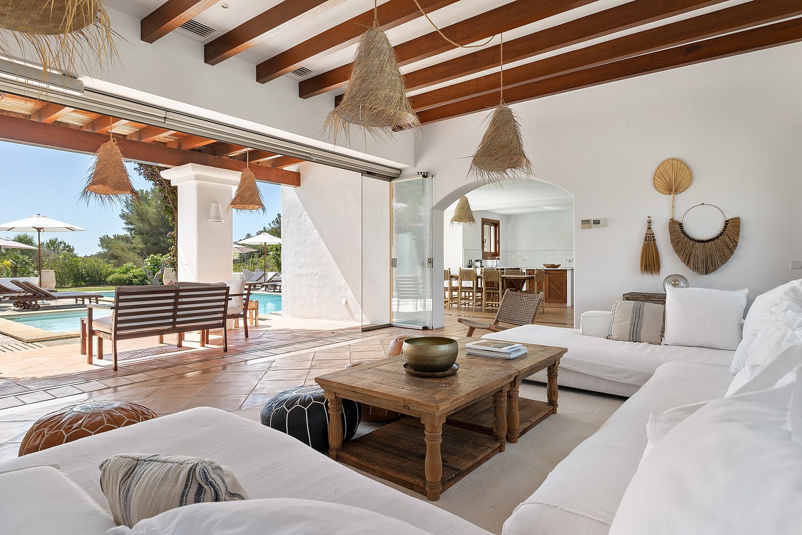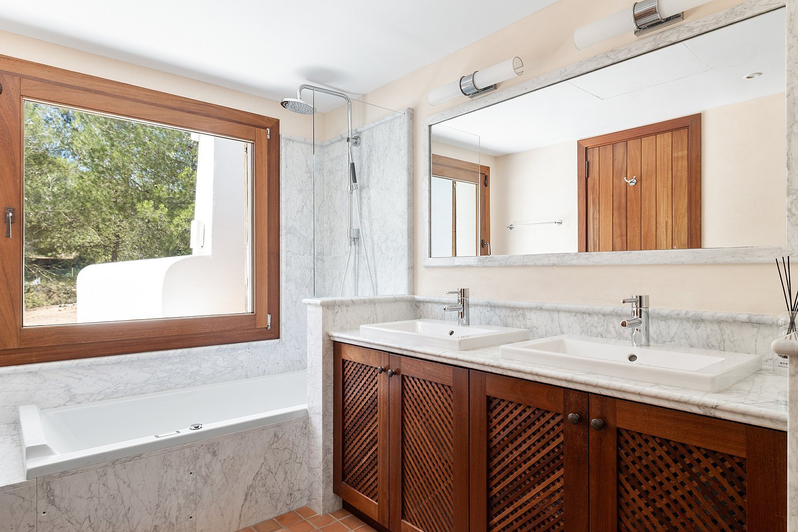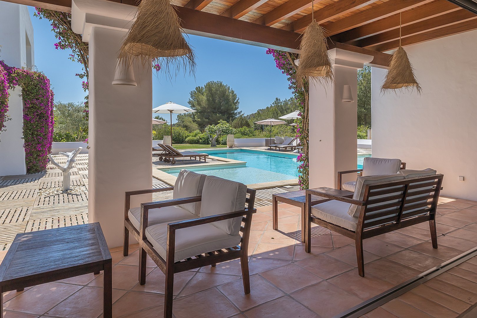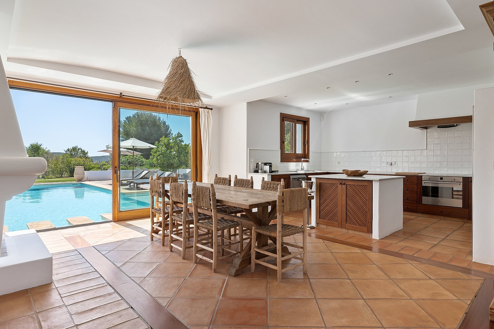 Diese atemberaubende Finca, eingebettet in die ruhige Landschaft Ibizas, bietet einen luxuriösen und friedlichen Rückzugsort. Das Anwesen liegt etwas außerhalb des begehrten Dorfes Jesús und verfügt über fünf geräumige Schlafzimmer, jedes mit eigenem Eingang und begehbarem Kleiderschrank, sowie ein separates Personalhaus. Beim Betreten des Anwesens werden Sie von einer wunderschönen, von Zypressen gesäumten Einfahrt begrüßt, die zu einem Innenhof mit Springbrunnen und Jasminblüten führt. Das Innere der Finca verfügt über eine großzügige offene Küche, einen Essbereich und ein Wohnzimmer mit großem Kamin. Die großen Fenster verbinden nahtlos den Innen- und Außenbereich und schaffen eine perfekte Harmonie zwischen beiden. Im Erdgeschoss befinden sich drei geräumige Gästezimmer, jedes mit begehbarem Kleiderschrank, Badezimmer mit Badewanne und Dusche sowie Zugang zu einer privaten Terrasse, die zum Garten oder Pool führt. Die Turmsuite verfügt über ein Wohnzimmer, eine Gästetoilette und ein Schlafzimmer mit atemberaubendem Blick auf die umliegende Grünanlage. Die Master-Suite, die sich im anderen Flügel befindet, verfügt über ein Wohnzimmer, ein Schlafzimmer und ein Badezimmer sowie eine private Terrasse mit atemberaubendem Blick auf die Landschaft. Der üppige Garten bietet viele Möglichkeiten, darunter einen Grillplatz unter einem schönen Baum und Platz zum Anpflanzen von eigenem Gemüse und Obstbäumen. Das Anwesen verfügt außerdem über einen großen Pool mit viel Platz für Sonnenliegen und Chill-out-Bereiche, ideal für Familienfeiern und Treffen mit Freunden. Die Finca verfügt außerdem über eine Dachterrasse mit Blick auf die Berge, einen Fitnessraum, der sowohl als Innen- als auch als Außenbereich genutzt werden kann, und Parkplätze für über 10 Autos. Wenn Sie auf der Suche nach einem luxuriösen und ruhigen Rückzugsort auf dem Land von Ibiza sind, ist diese Finca eine großartige Gelegenheit. Mit ihrem traditionellen ibizenkischen Stil, den dicken Mauern und den großen Fenstern bietet diese Immobilie die perfekte Mischung aus rustikalem Charme und modernem Luxus.
