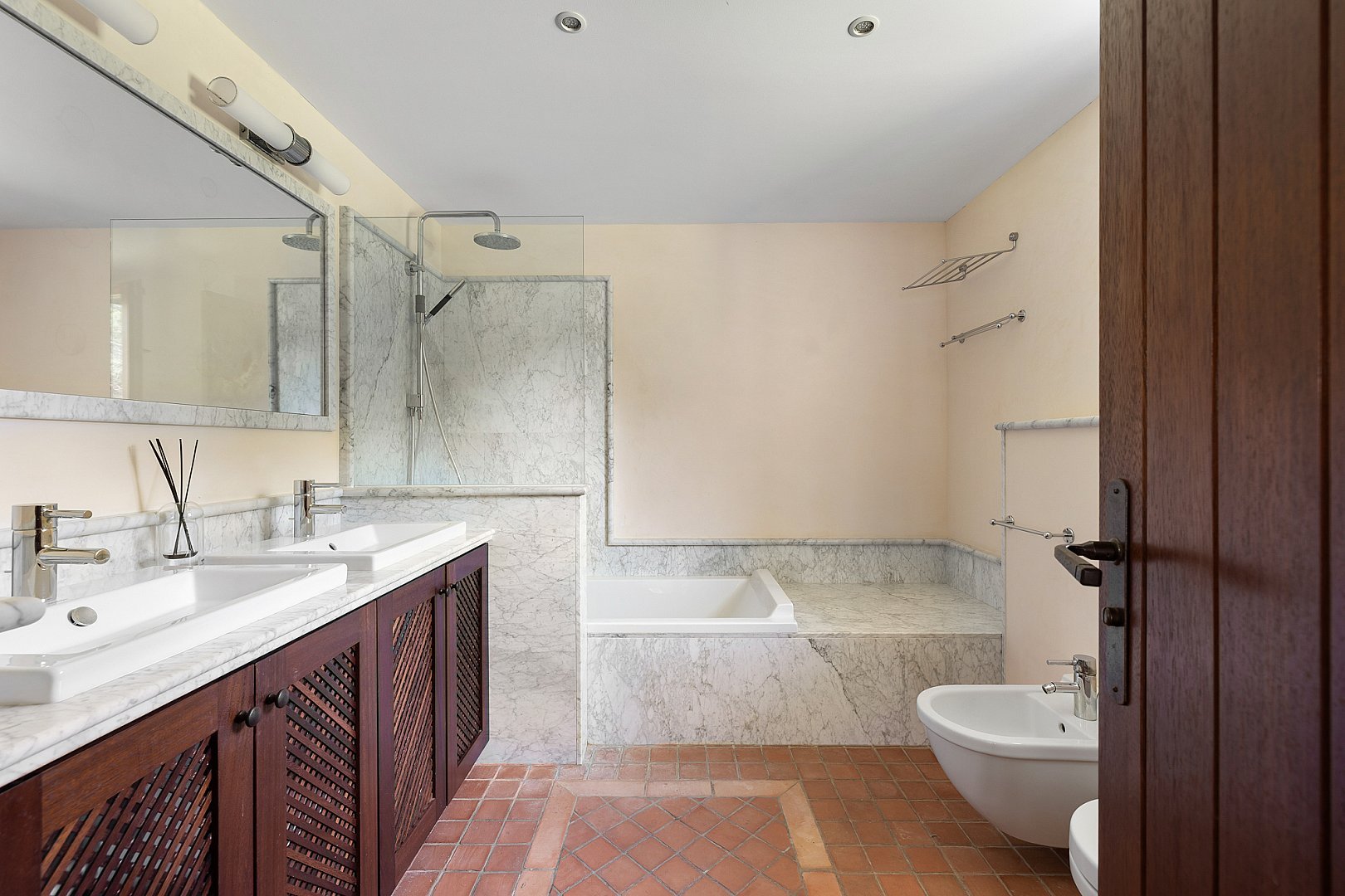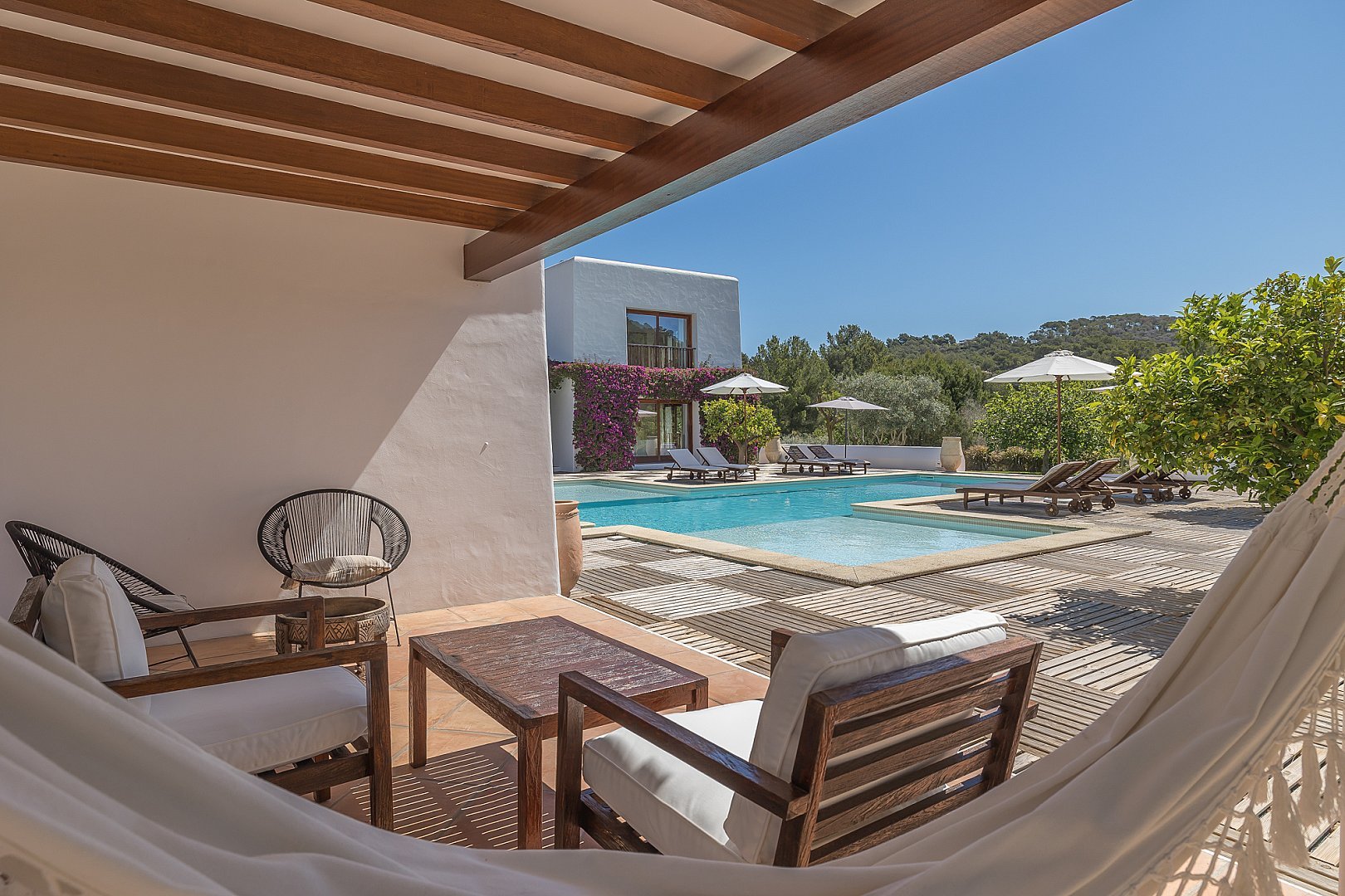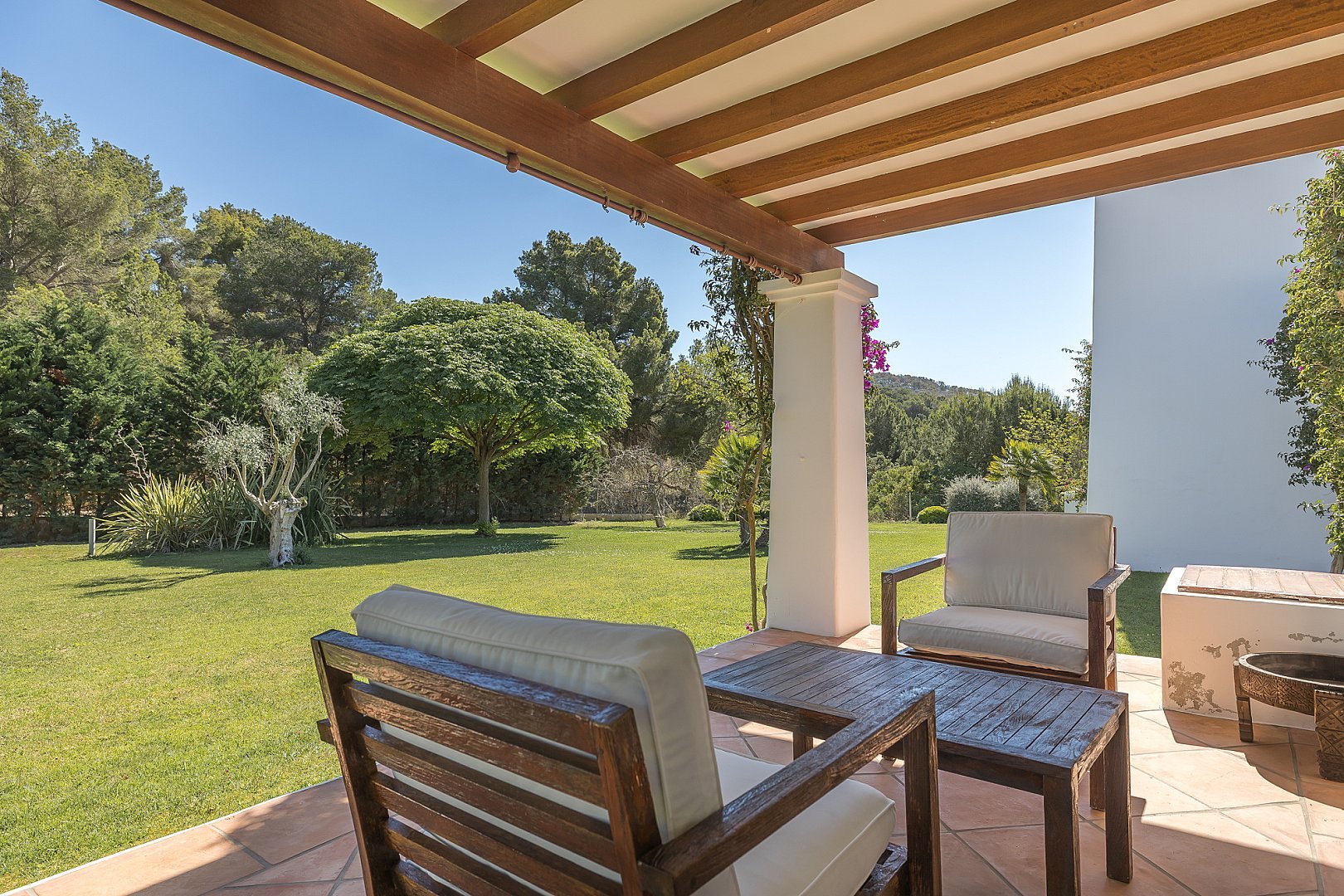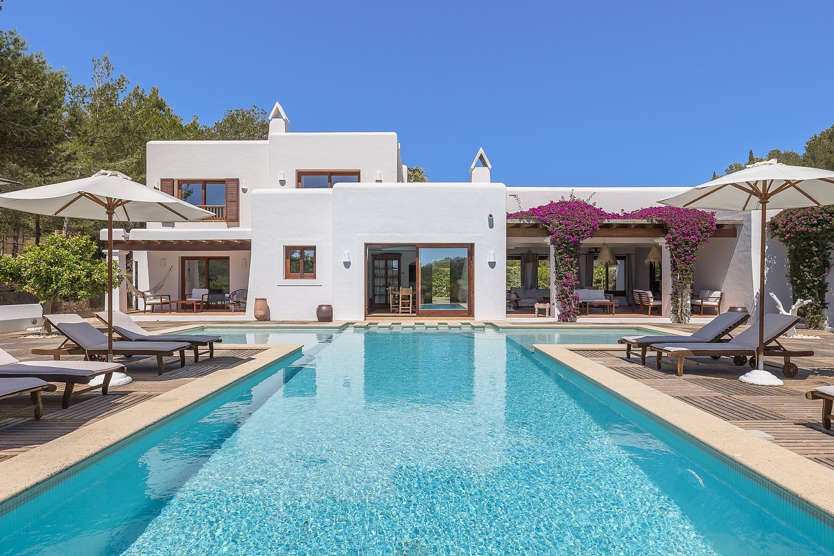 Diese atemberaubende Finca, eingebettet in die ruhige Landschaft Ibizas, bietet einen luxuriösen und friedlichen Rückzugsort. Das Anwesen liegt etwas außerhalb des begehrten Dorfes Jesús und verfügt über fünf geräumige Schlafzimmer, jedes mit eigenem Eingang und begehbarem Kleiderschrank, sowie ein separates Personalhaus. Beim Betreten des Anwesens werden Sie von einer wunderschönen, von Zypressen gesäumten Einfahrt begrüßt, die zu einem Innenhof mit Springbrunnen und Jasminblüten führt. Das Innere der Finca verfügt über eine großzügige offene Küche, einen Essbereich und ein Wohnzimmer mit großem Kamin. Die großen Fenster verbinden nahtlos den Innen- und Außenbereich und schaffen eine perfekte Harmonie zwischen beiden. Im Erdgeschoss befinden sich drei geräumige Gästezimmer, jedes mit begehbarem Kleiderschrank, Badezimmer mit Badewanne und Dusche sowie Zugang zu einer privaten Terrasse, die zum Garten oder Pool führt. Die Turmsuite verfügt über ein Wohnzimmer, eine Gästetoilette und ein Schlafzimmer mit atemberaubendem Blick auf die umliegende Grünanlage. Die Master-Suite, die sich im anderen Flügel befindet, verfügt über ein Wohnzimmer, ein Schlafzimmer und ein Badezimmer sowie eine private Terrasse mit atemberaubendem Blick auf die Landschaft. Der üppige Garten bietet viele Möglichkeiten, darunter einen Grillplatz unter einem schönen Baum und Platz zum Anpflanzen von eigenem Gemüse und Obstbäumen. Das Anwesen verfügt außerdem über einen großen Pool mit viel Platz für Sonnenliegen und Chill-out-Bereiche, ideal für Familienfeiern und Treffen mit Freunden. Die Finca verfügt außerdem über eine Dachterrasse mit Blick auf die Berge, einen Fitnessraum, der sowohl als Innen- als auch als Außenbereich genutzt werden kann, und Parkplätze für über 10 Autos. Wenn Sie auf der Suche nach einem luxuriösen und ruhigen Rückzugsort auf dem Land von Ibiza sind, ist diese Finca eine großartige Gelegenheit. Mit ihrem traditionellen ibizenkischen Stil, den dicken Mauern und den großen Fenstern bietet diese Immobilie die perfekte Mischung aus rustikalem Charme und modernem Luxus.