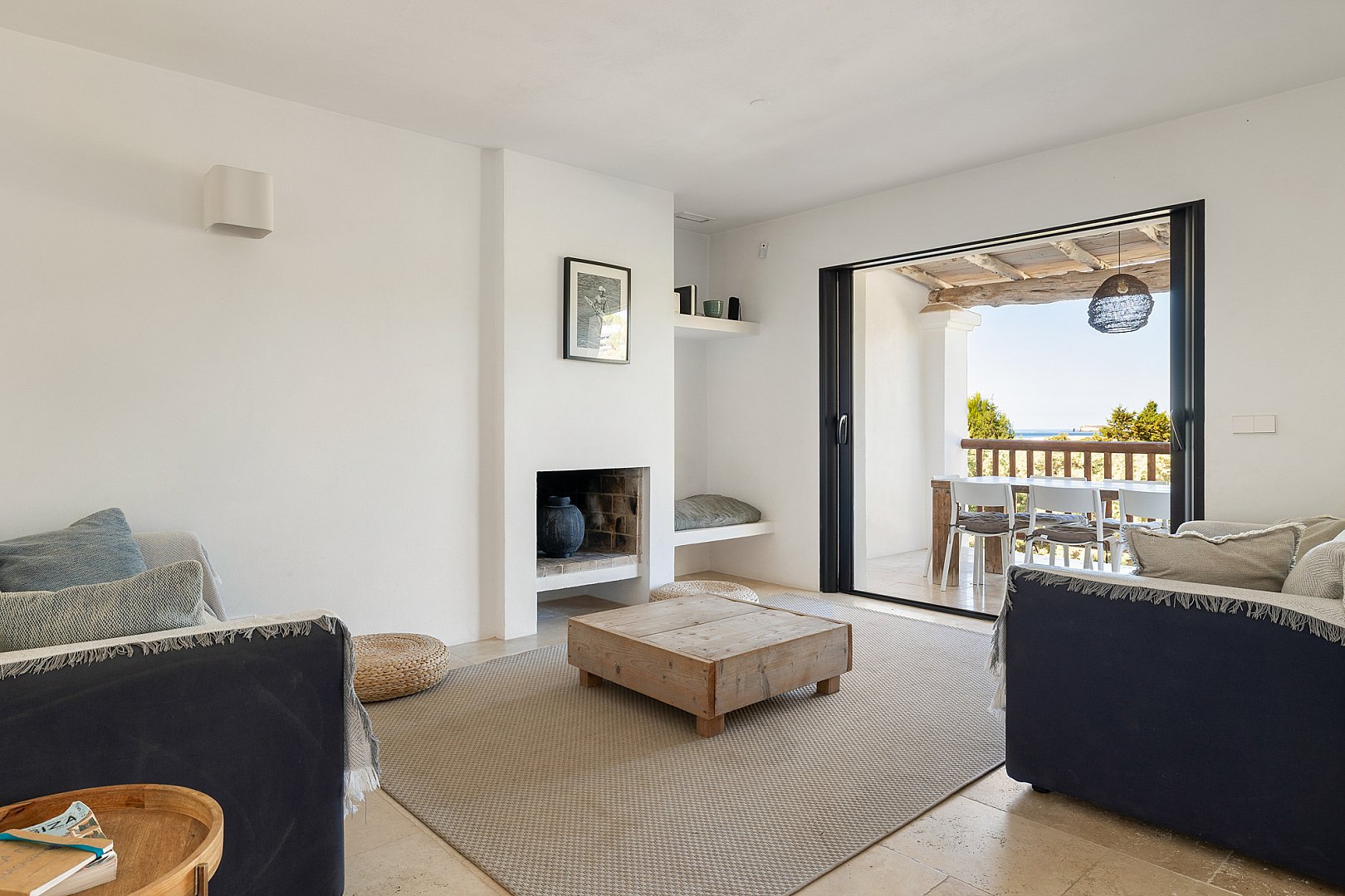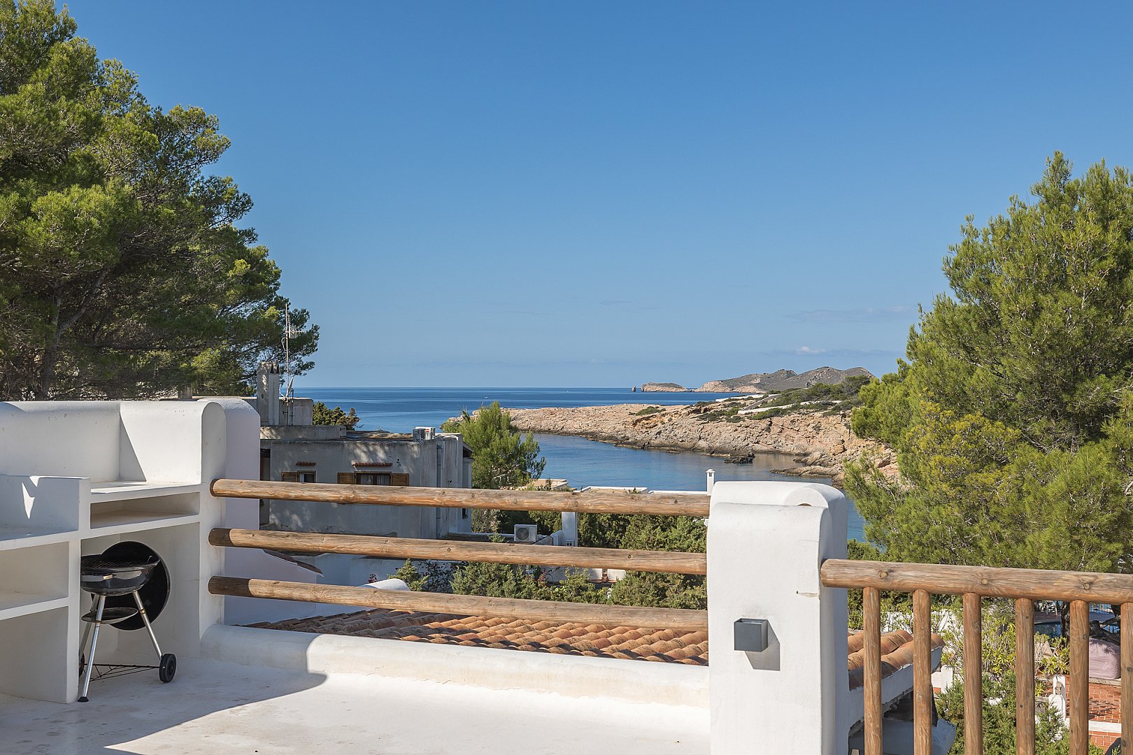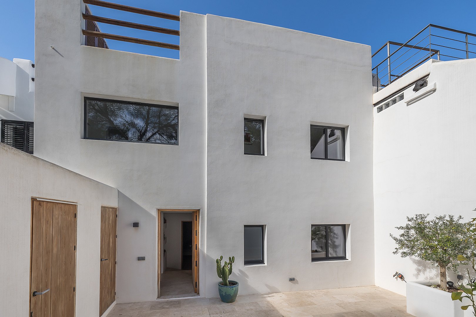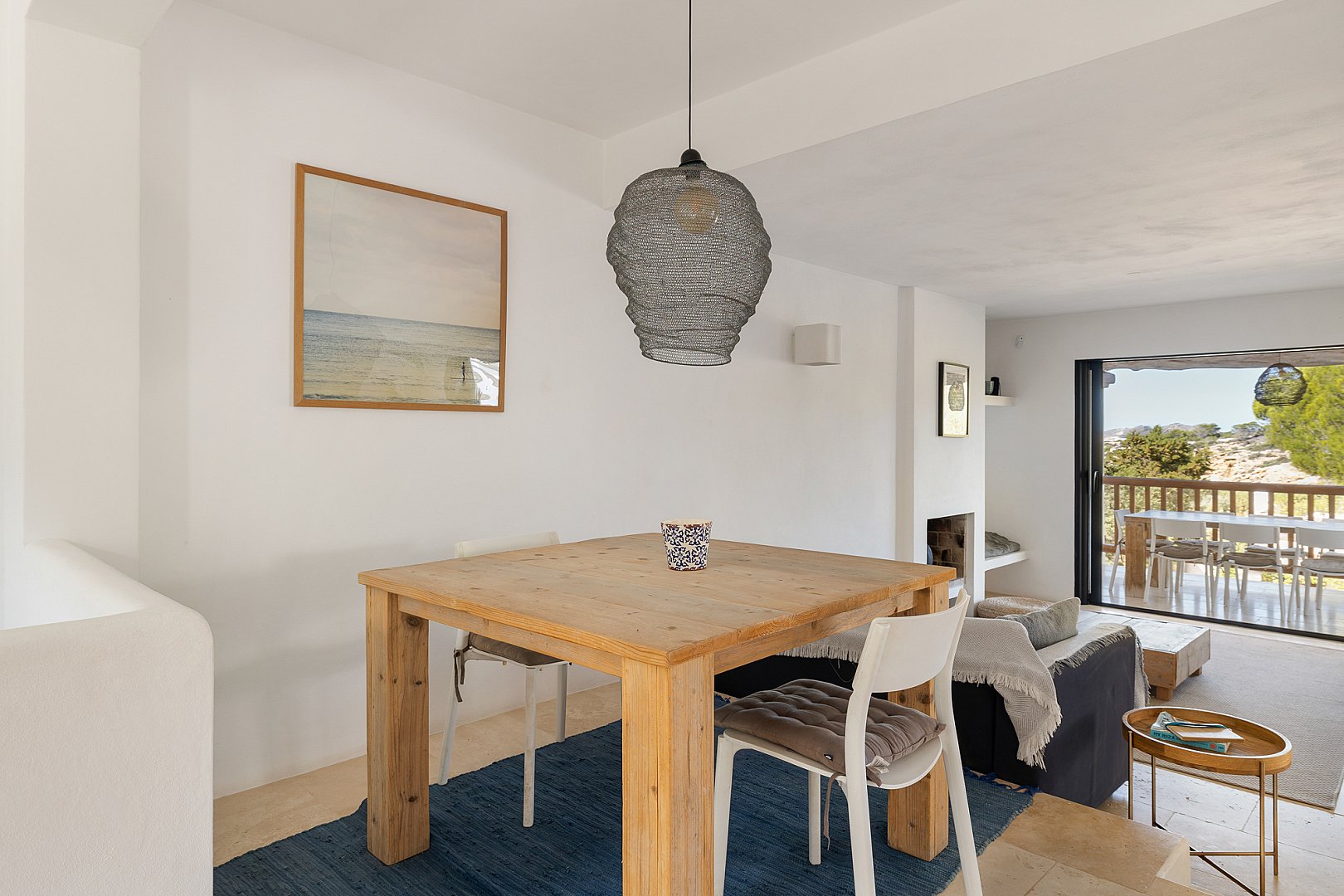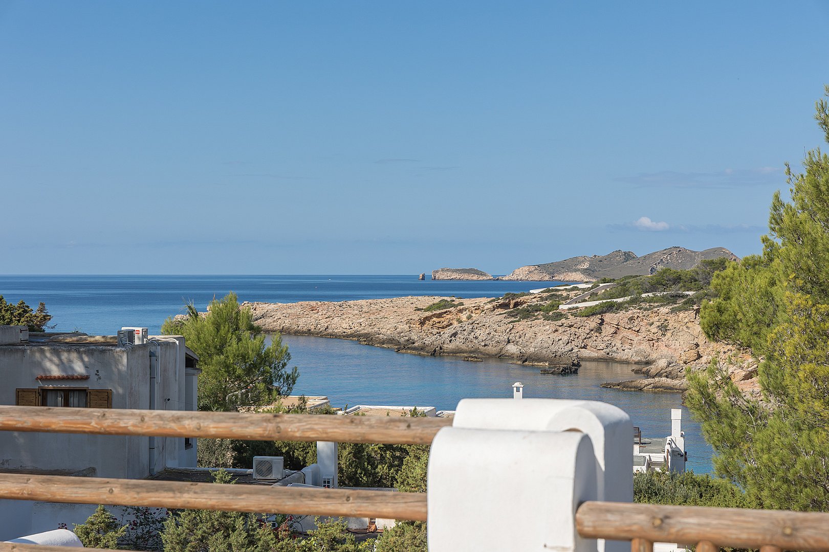 Dieses prachtvolle Reihenhaus befindet sich nur wenige Meter vom Meer entfernt, an einem traumhaften Standort, umgeben von türkisfarbenem Wasser und spektakulären Sonnenuntergängen. In einer kleinen, gepflegten Nachbarschaftsgemeinschaft gelegen, wurde die Immobilie mit exquisitem Geschmack vollständig renoviert, wobei die Essenz Ibizas erhalten blieb: Wärme, Natürlichkeit und das Mediterrane. Beim Betreten der Immobilie empfängt uns ein geräumiger Eingangshof, ideal für eine große Tisch- und Stuhlgruppe, um angenehme Mahlzeiten im Freien zu genießen. Im Erdgeschoss befinden sich drei Doppelschlafzimmer, alle mit Einbauschränken. Eines davon verfügt über ein eigenes Bad, während die anderen beiden sich ein komplettes Bad teilen. Von zwei der Zimmer gelangt man auf eine geräumige, teilweise überdachte Terrasse, von der aus man durch die Gärten zu einem fabelhaften Gemeinschaftspool gelangt, der direkt am Meer liegt. Im zweiten Stock bietet die Wohnung ein weiteres Doppelschlafzimmer mit Bad, ein helles Wohn-Esszimmer mit offener Küche und Kamin sowie Zugang zu einem Balkon mit angenehmer Aussicht. Von hier aus gelangt man zur Dachterrasse, die perfekt mit einem Essbereich und einer Außensitzgruppe ausgestattet ist, von wo aus man wunderbare Meerblicke genießen kann. Ein außergewöhnliches Haus in einer paradiesischen Umgebung, perfekt für diejenigen, die Komfort, Stil und die authentische mediterrane Essenz suchen.