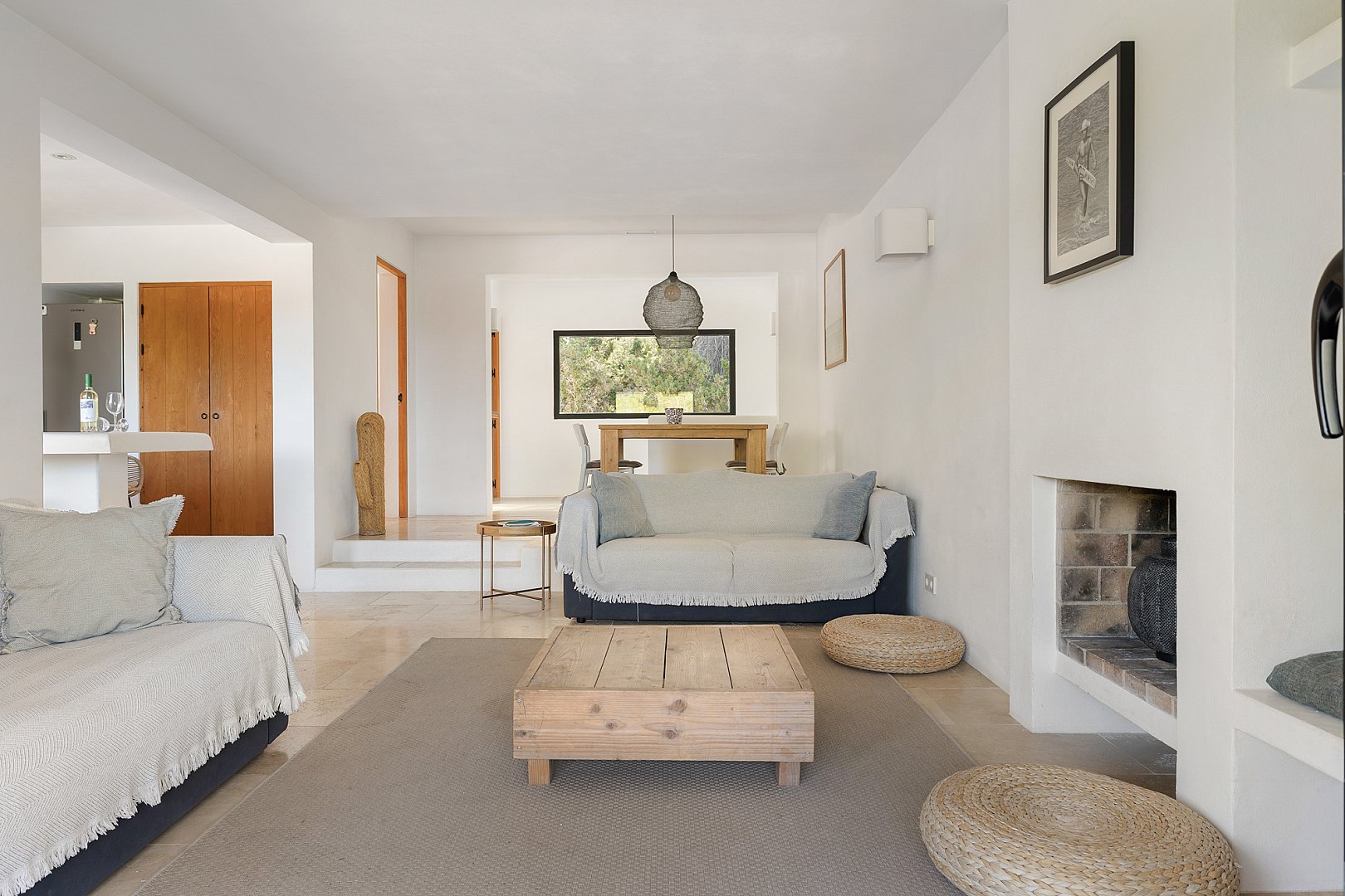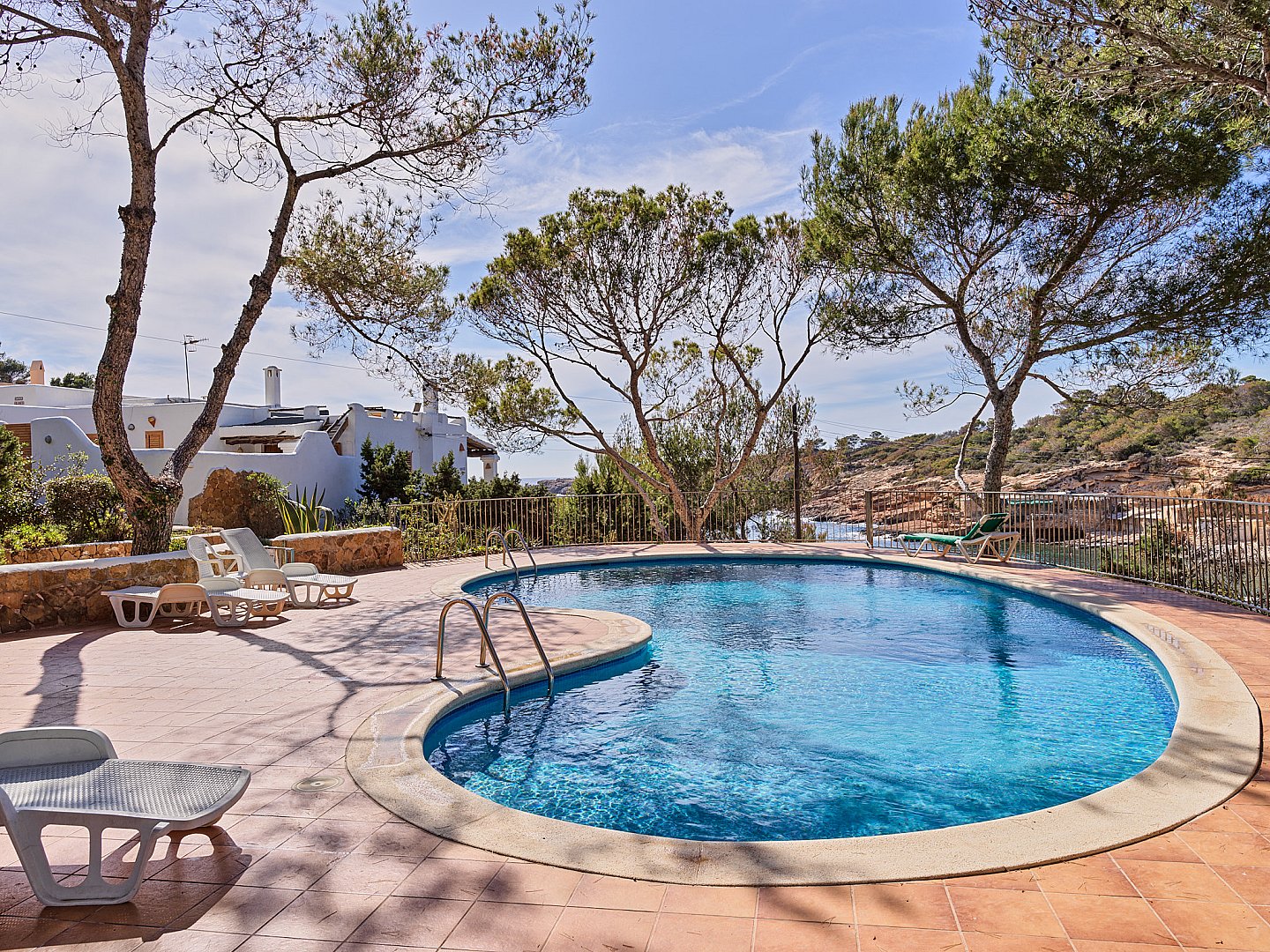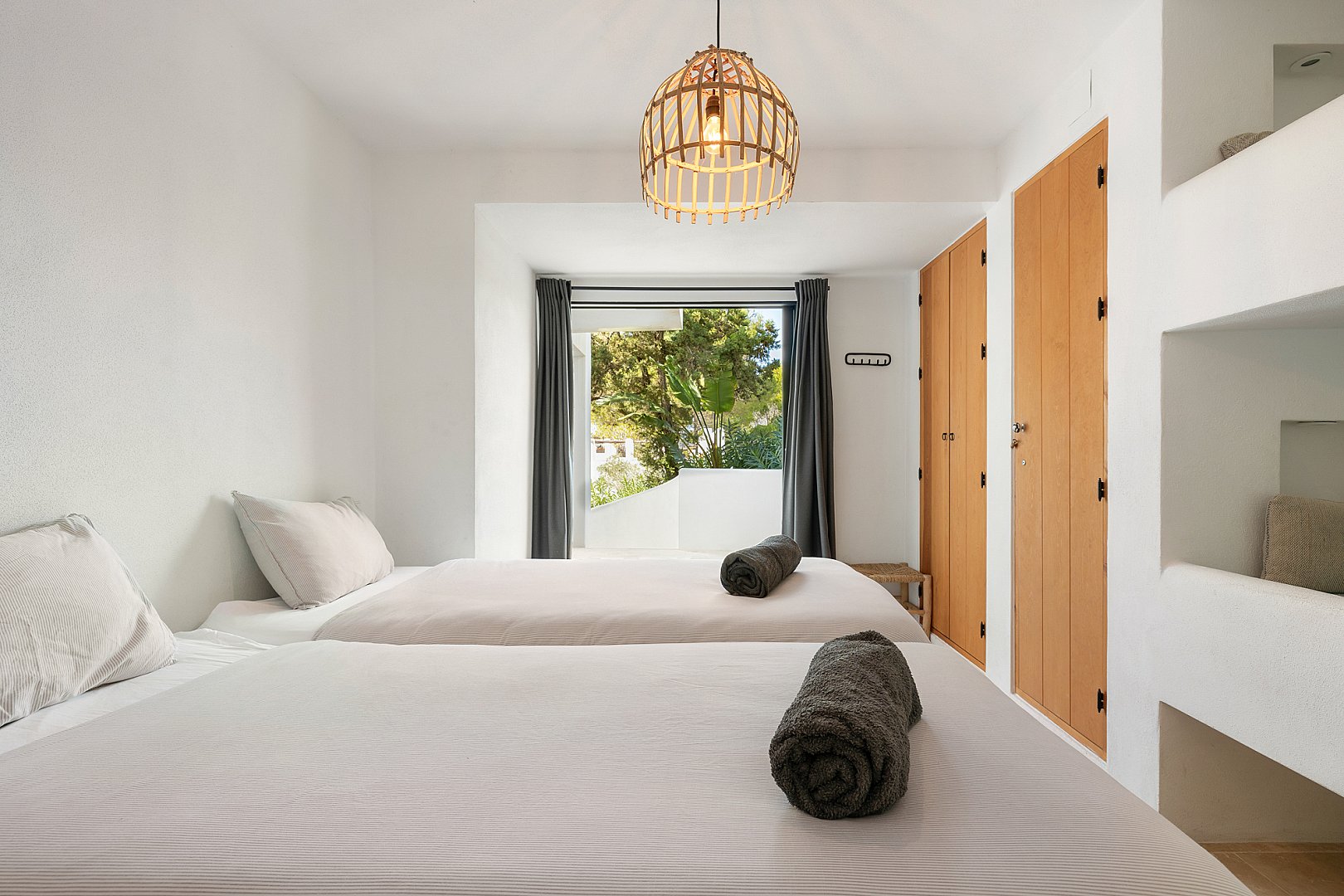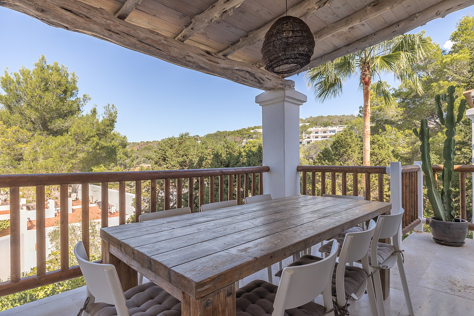 Dieses prachtvolle Reihenhaus befindet sich nur wenige Meter vom Meer entfernt, an einem traumhaften Standort, umgeben von türkisfarbenem Wasser und spektakulären Sonnenuntergängen. In einer kleinen, gepflegten Nachbarschaftsgemeinschaft gelegen, wurde die Immobilie mit exquisitem Geschmack vollständig renoviert, wobei die Essenz Ibizas erhalten blieb: Wärme, Natürlichkeit und das Mediterrane. Beim Betreten der Immobilie empfängt uns ein geräumiger Eingangshof, ideal für eine große Tisch- und Stuhlgruppe, um angenehme Mahlzeiten im Freien zu genießen. Im Erdgeschoss befinden sich drei Doppelschlafzimmer, alle mit Einbauschränken. Eines davon verfügt über ein eigenes Bad, während die anderen beiden sich ein komplettes Bad teilen. Von zwei der Zimmer gelangt man auf eine geräumige, teilweise überdachte Terrasse, von der aus man durch die Gärten zu einem fabelhaften Gemeinschaftspool gelangt, der direkt am Meer liegt. Im zweiten Stock bietet die Wohnung ein weiteres Doppelschlafzimmer mit Bad, ein helles Wohn-Esszimmer mit offener Küche und Kamin sowie Zugang zu einem Balkon mit angenehmer Aussicht. Von hier aus gelangt man zur Dachterrasse, die perfekt mit einem Essbereich und einer Außensitzgruppe ausgestattet ist, von wo aus man wunderbare Meerblicke genießen kann. Ein außergewöhnliches Haus in einer paradiesischen Umgebung, perfekt für diejenigen, die Komfort, Stil und die authentische mediterrane Essenz suchen.