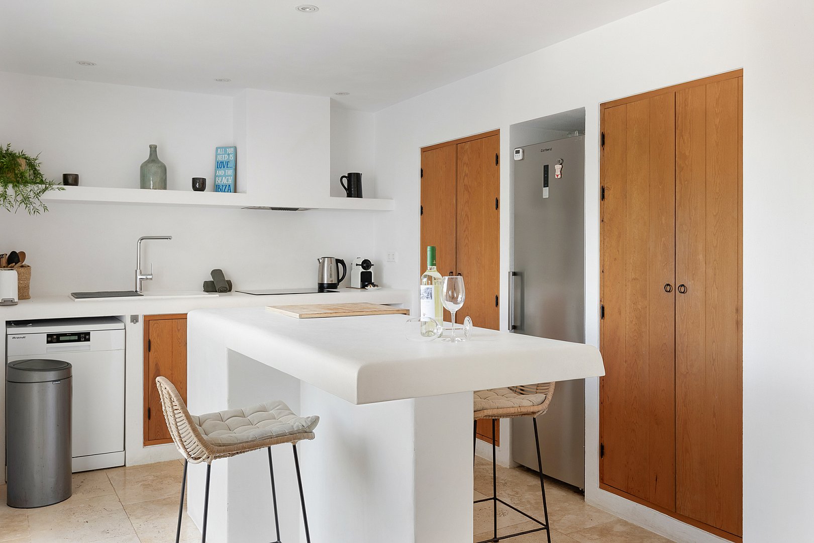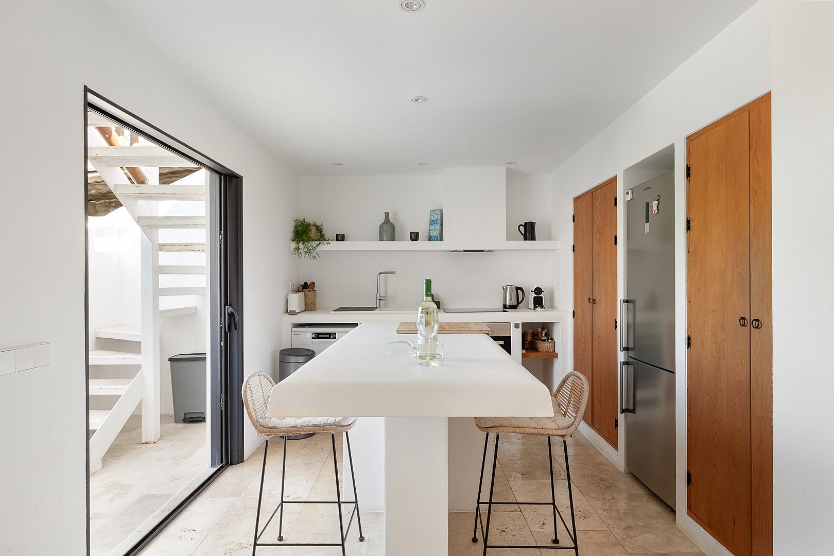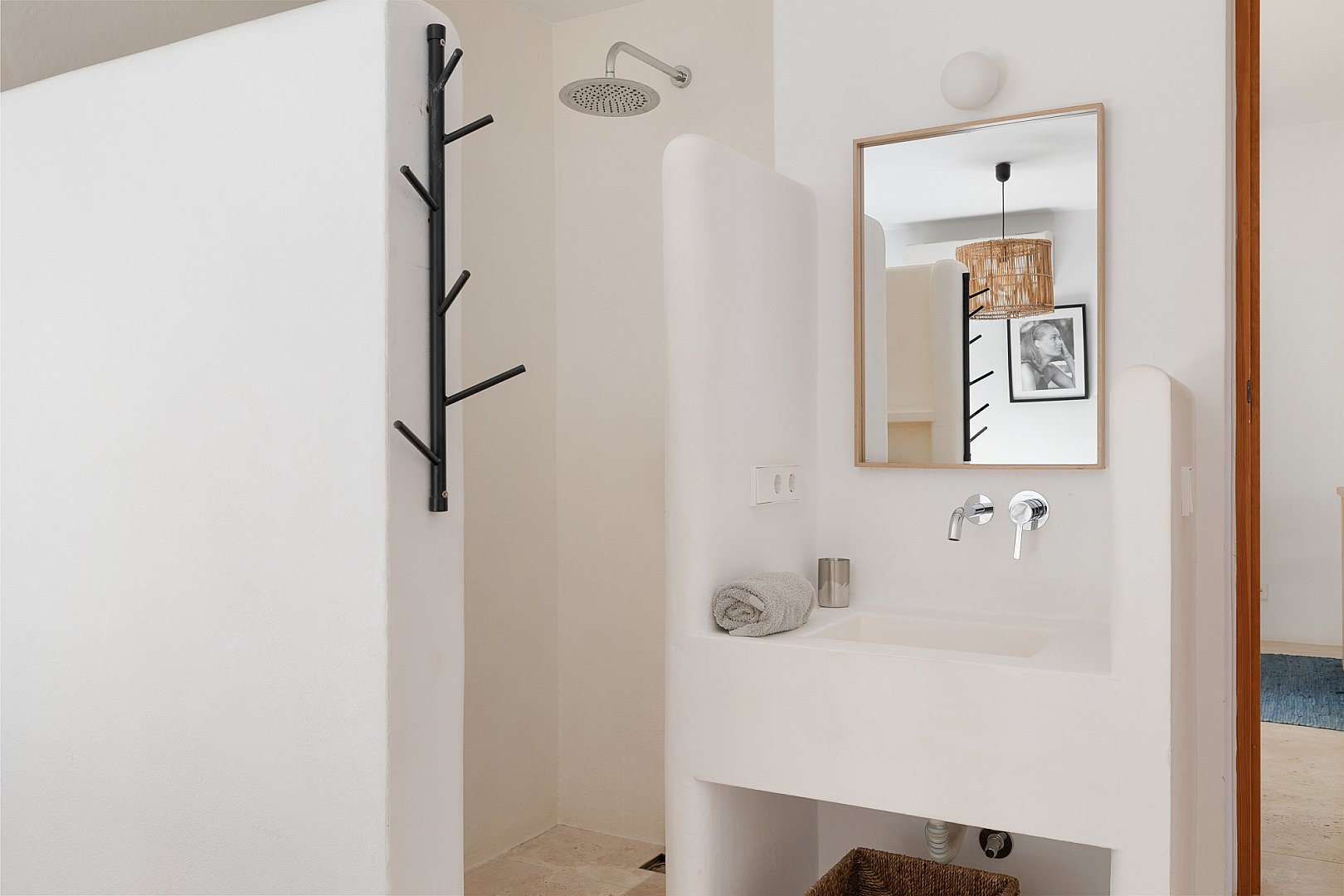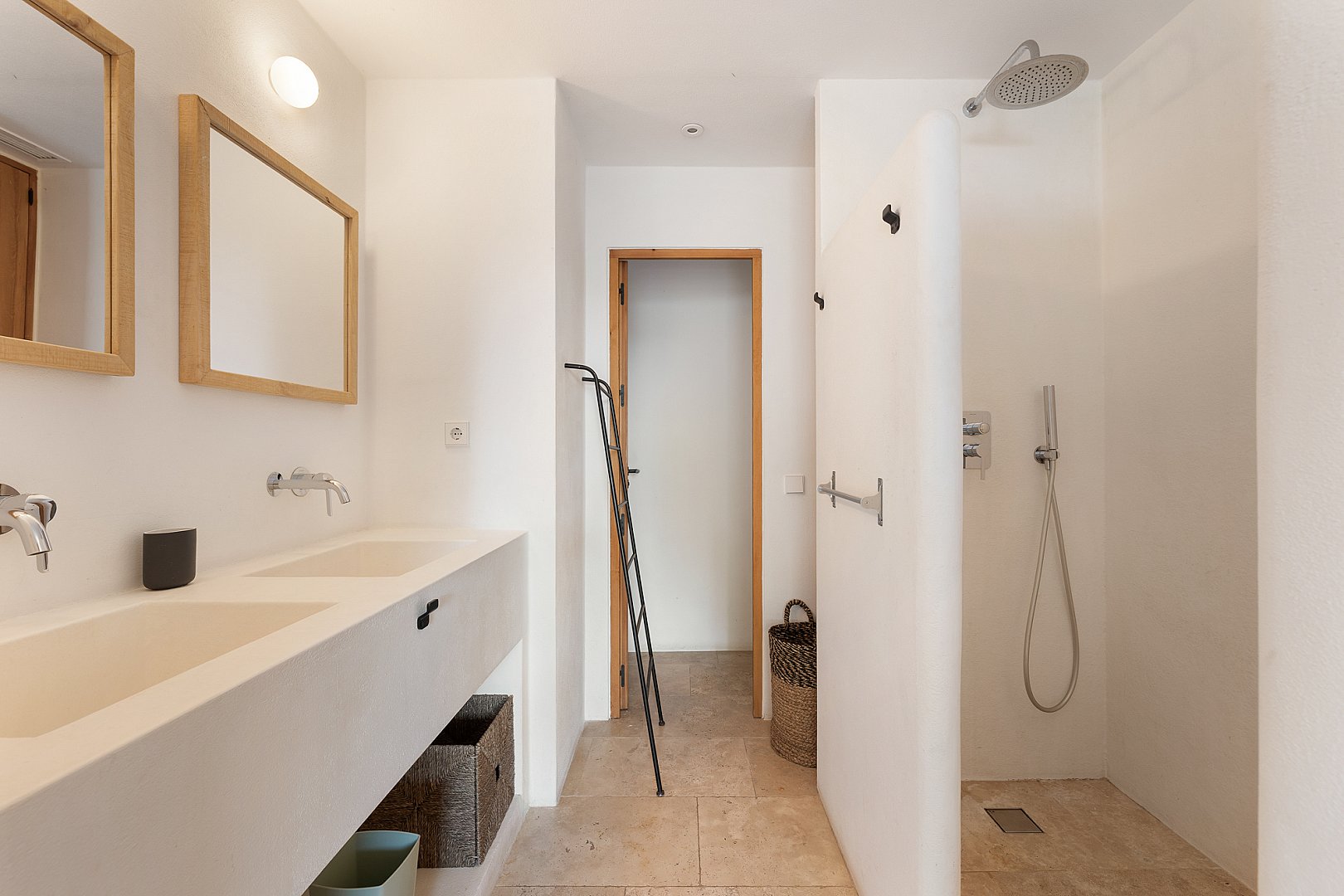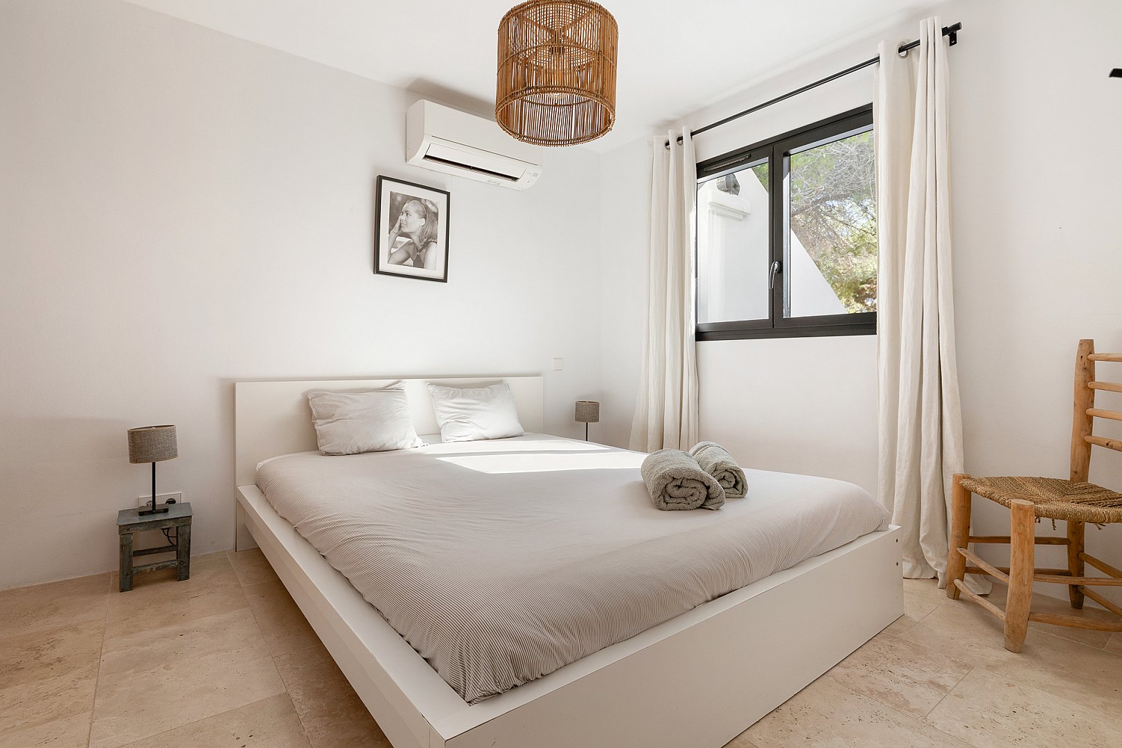 Dieses prachtvolle Reihenhaus befindet sich nur wenige Meter vom Meer entfernt, an einem traumhaften Standort, umgeben von türkisfarbenem Wasser und spektakulären Sonnenuntergängen. In einer kleinen, gepflegten Nachbarschaftsgemeinschaft gelegen, wurde die Immobilie mit exquisitem Geschmack vollständig renoviert, wobei die Essenz Ibizas erhalten blieb: Wärme, Natürlichkeit und das Mediterrane. Beim Betreten der Immobilie empfängt uns ein geräumiger Eingangshof, ideal für eine große Tisch- und Stuhlgruppe, um angenehme Mahlzeiten im Freien zu genießen. Im Erdgeschoss befinden sich drei Doppelschlafzimmer, alle mit Einbauschränken. Eines davon verfügt über ein eigenes Bad, während die anderen beiden sich ein komplettes Bad teilen. Von zwei der Zimmer gelangt man auf eine geräumige, teilweise überdachte Terrasse, von der aus man durch die Gärten zu einem fabelhaften Gemeinschaftspool gelangt, der direkt am Meer liegt. Im zweiten Stock bietet die Wohnung ein weiteres Doppelschlafzimmer mit Bad, ein helles Wohn-Esszimmer mit offener Küche und Kamin sowie Zugang zu einem Balkon mit angenehmer Aussicht. Von hier aus gelangt man zur Dachterrasse, die perfekt mit einem Essbereich und einer Außensitzgruppe ausgestattet ist, von wo aus man wunderbare Meerblicke genießen kann. Ein außergewöhnliches Haus in einer paradiesischen Umgebung, perfekt für diejenigen, die Komfort, Stil und die authentische mediterrane Essenz suchen.