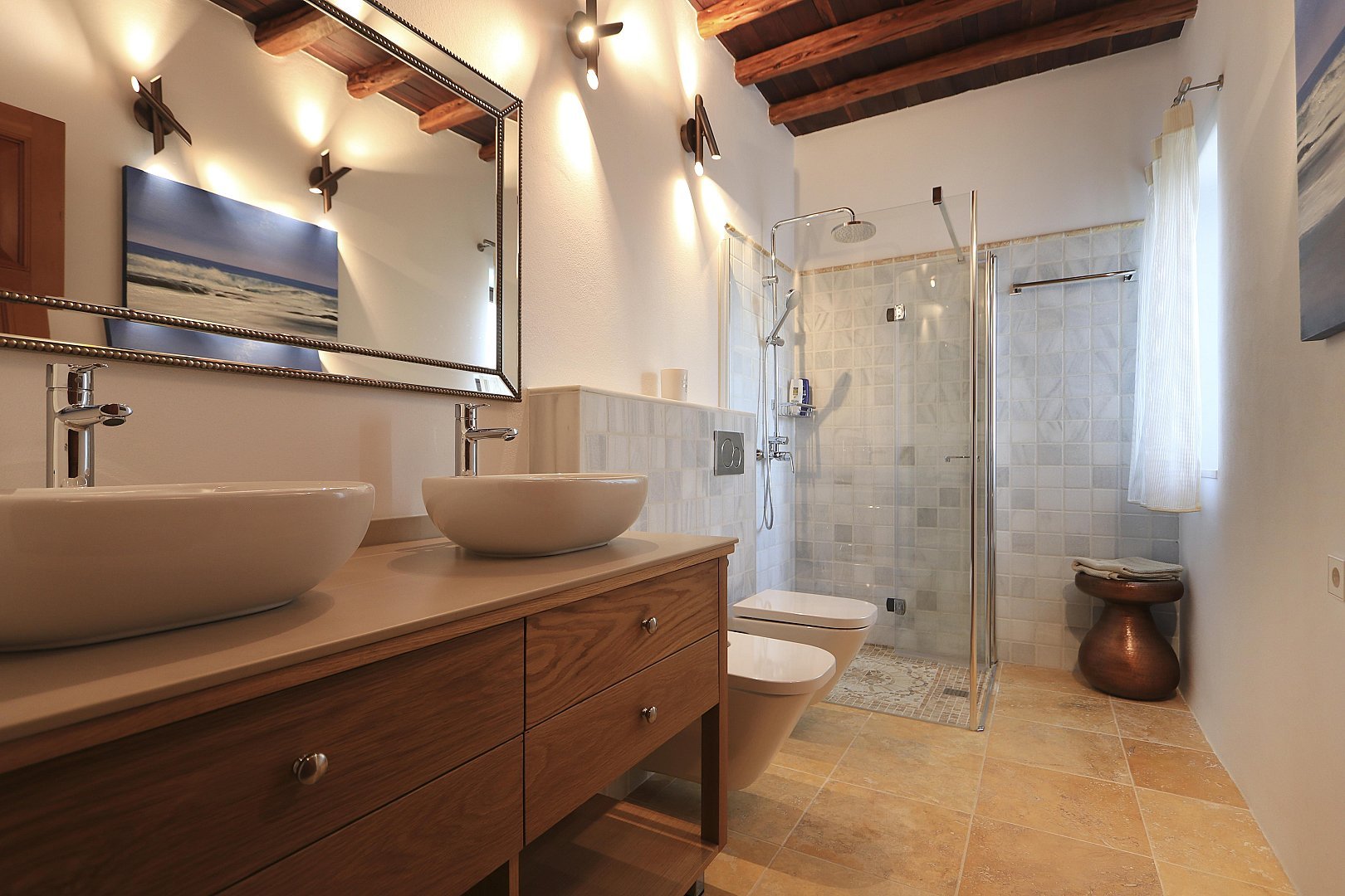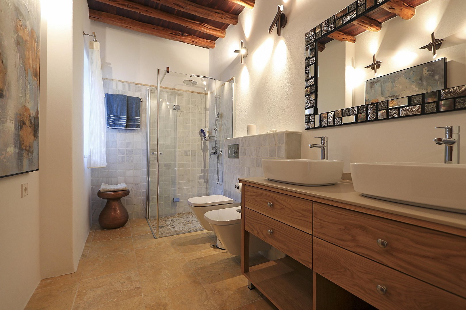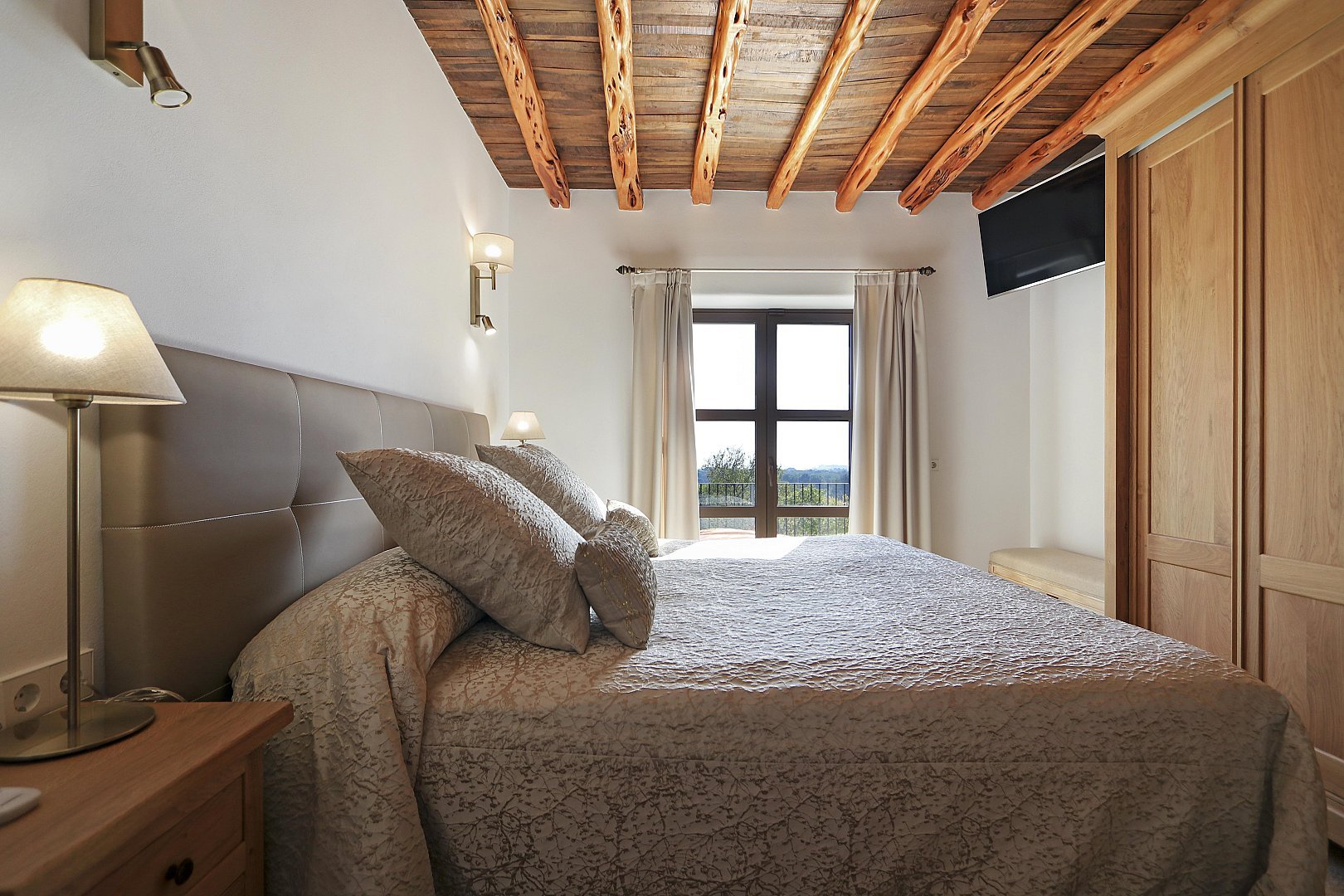 - Bedroom 1 – King-size bed (2m), en-suite bathroom, TV, and terrace access