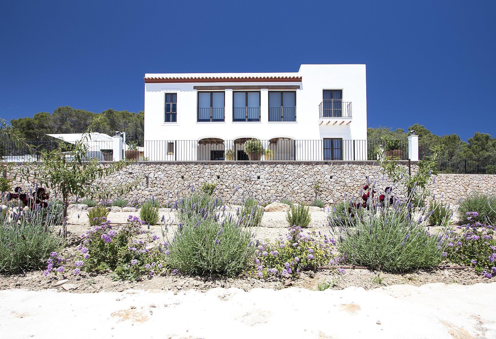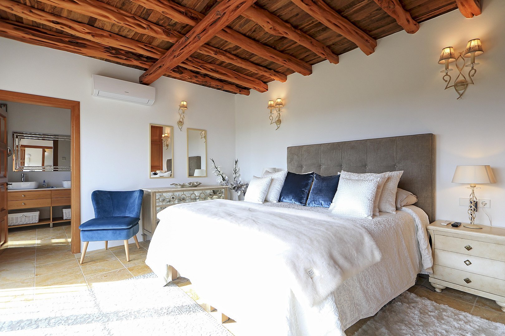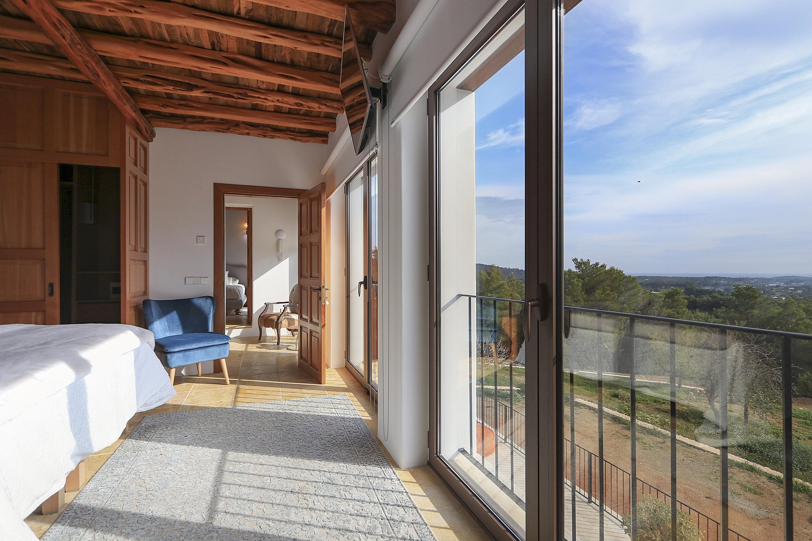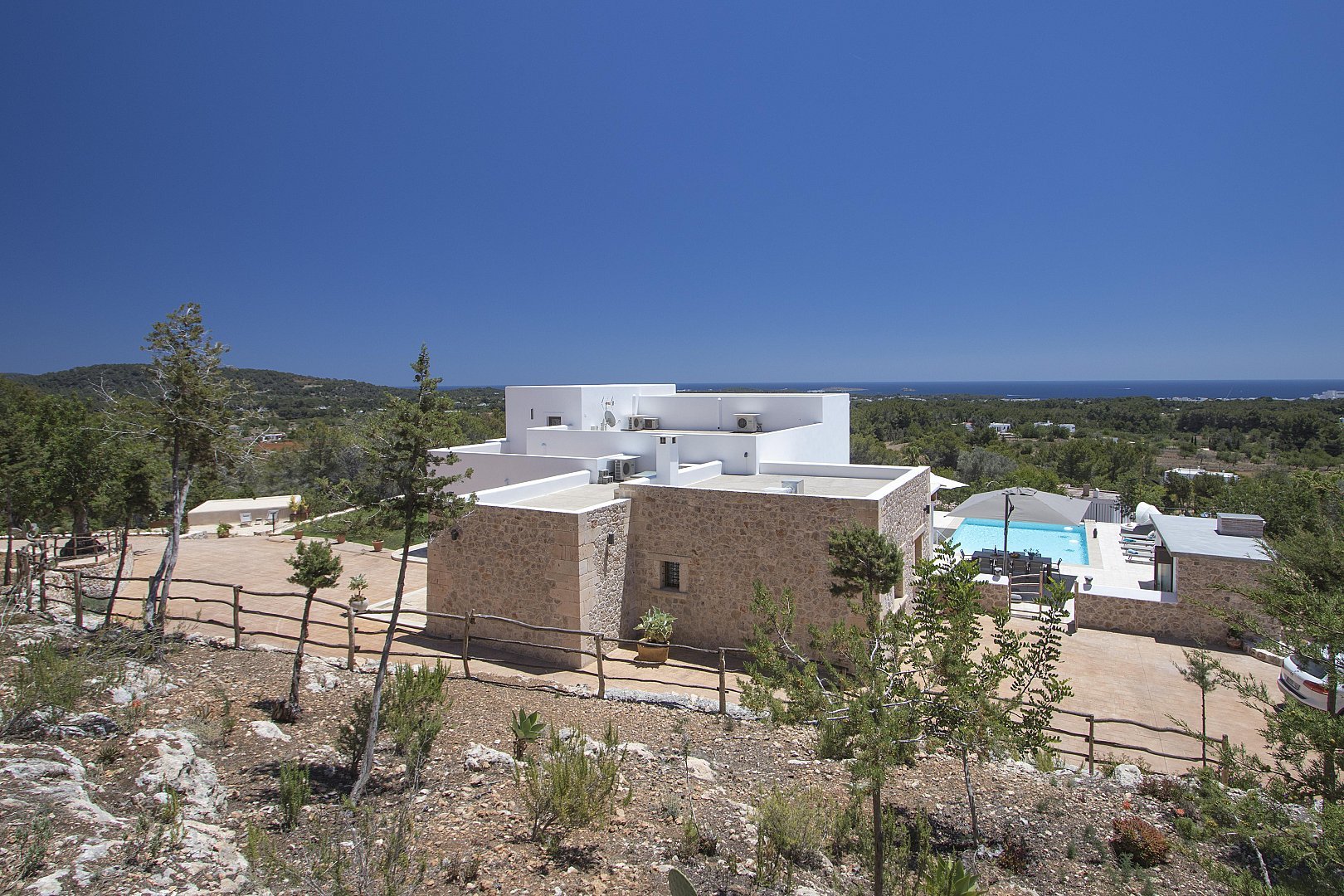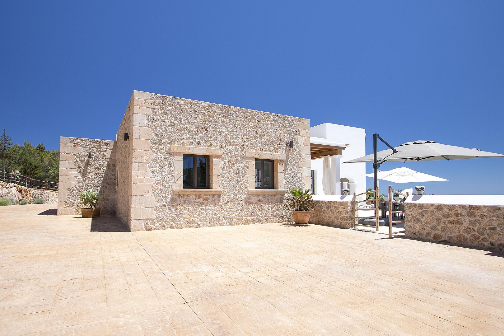 The main house features five beautifully designed double bedrooms, each offering a harmonious fusion of classic Ibizan architecture and contemporary luxury. With high juniper wood ceilings, multiple spacious living areas, and both indoor and outdoor dining options, this residence provides absolute privacy and comfort all year round.