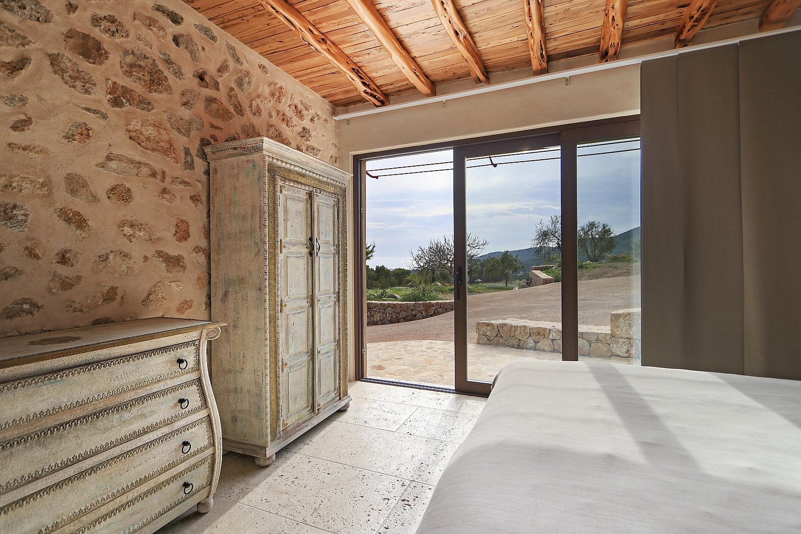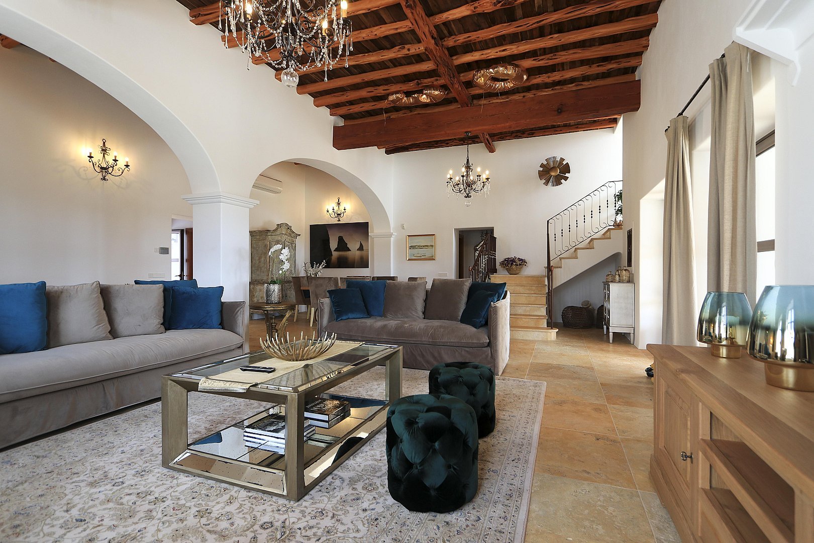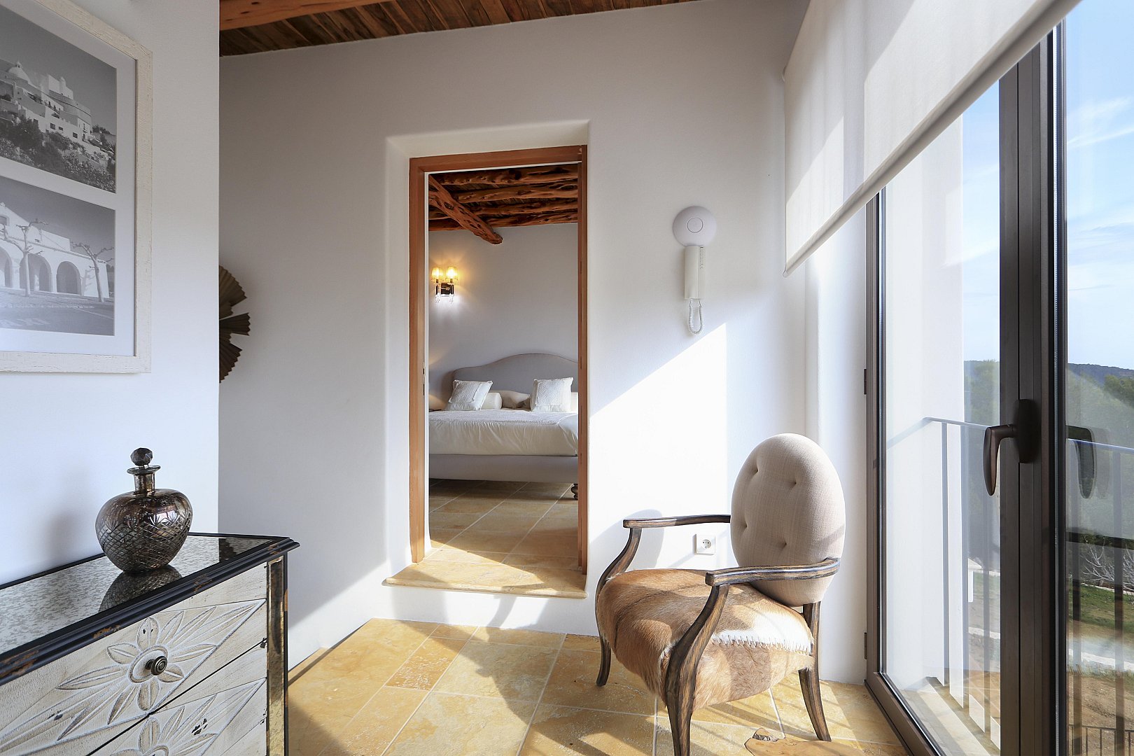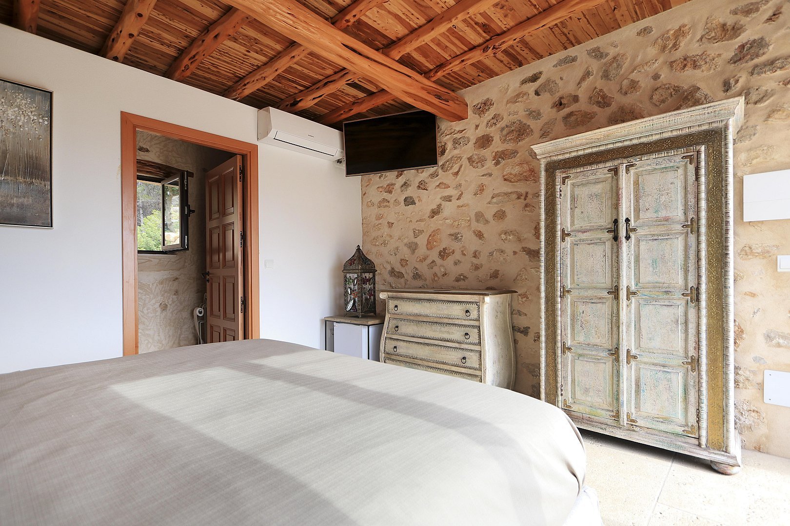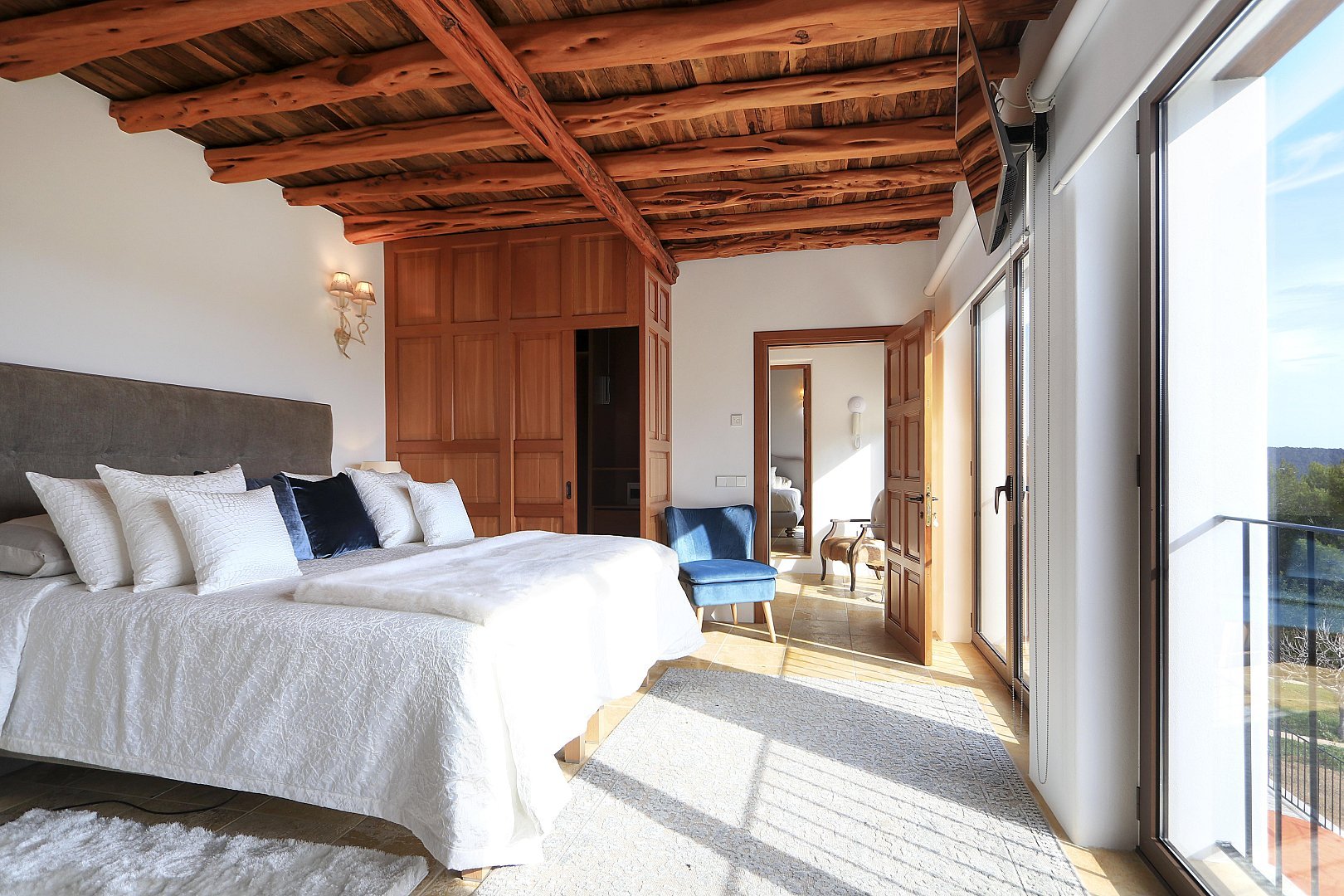 The main house features five beautifully designed double bedrooms, each offering a harmonious fusion of classic Ibizan architecture and contemporary luxury. With high juniper wood ceilings, multiple spacious living areas, and both indoor and outdoor dining options, this residence provides absolute privacy and comfort all year round.