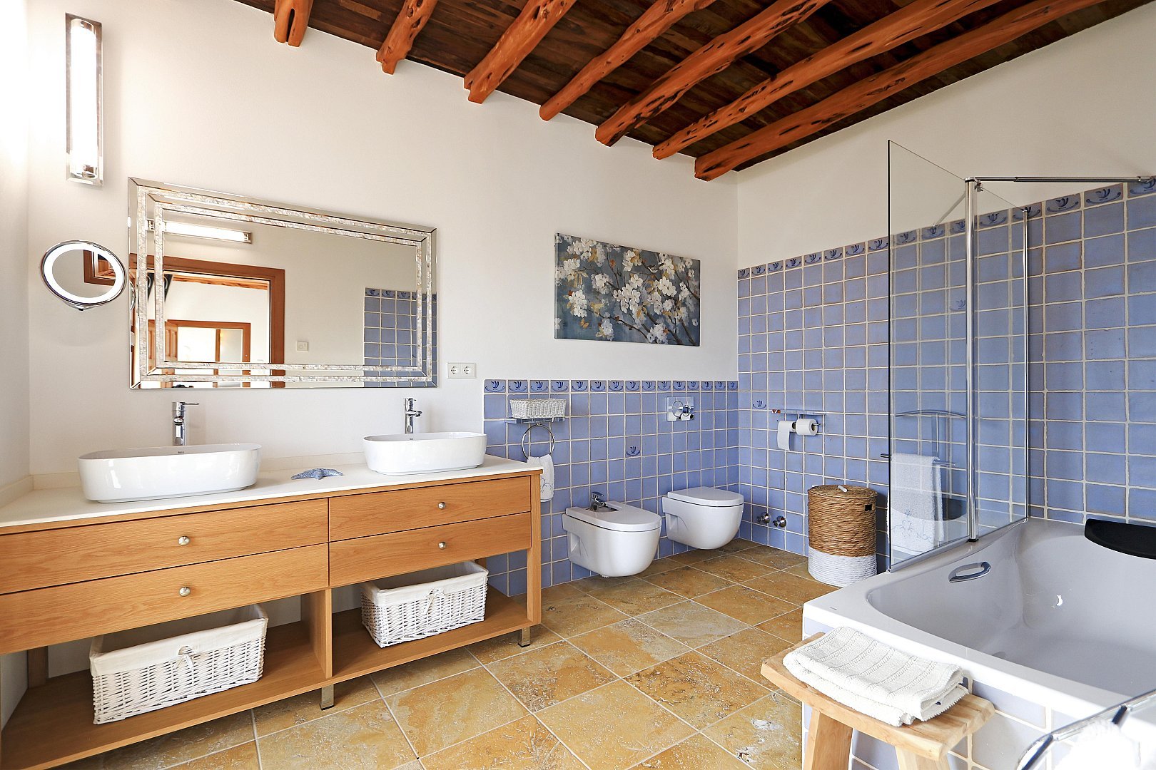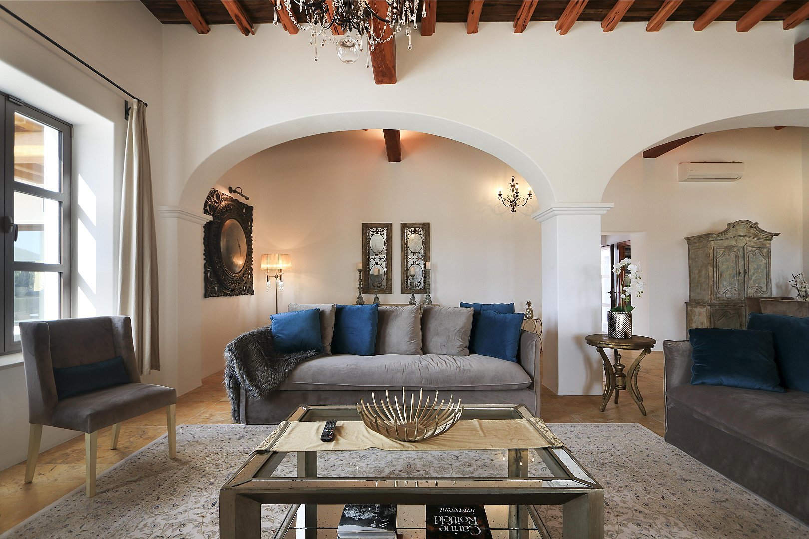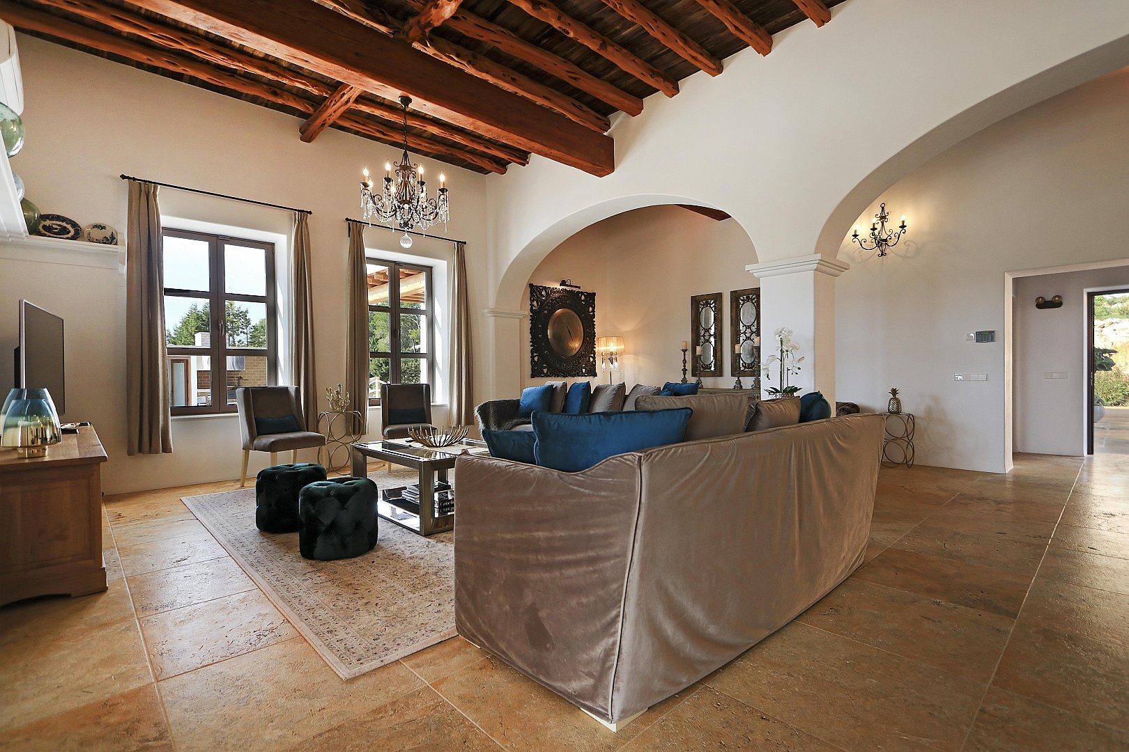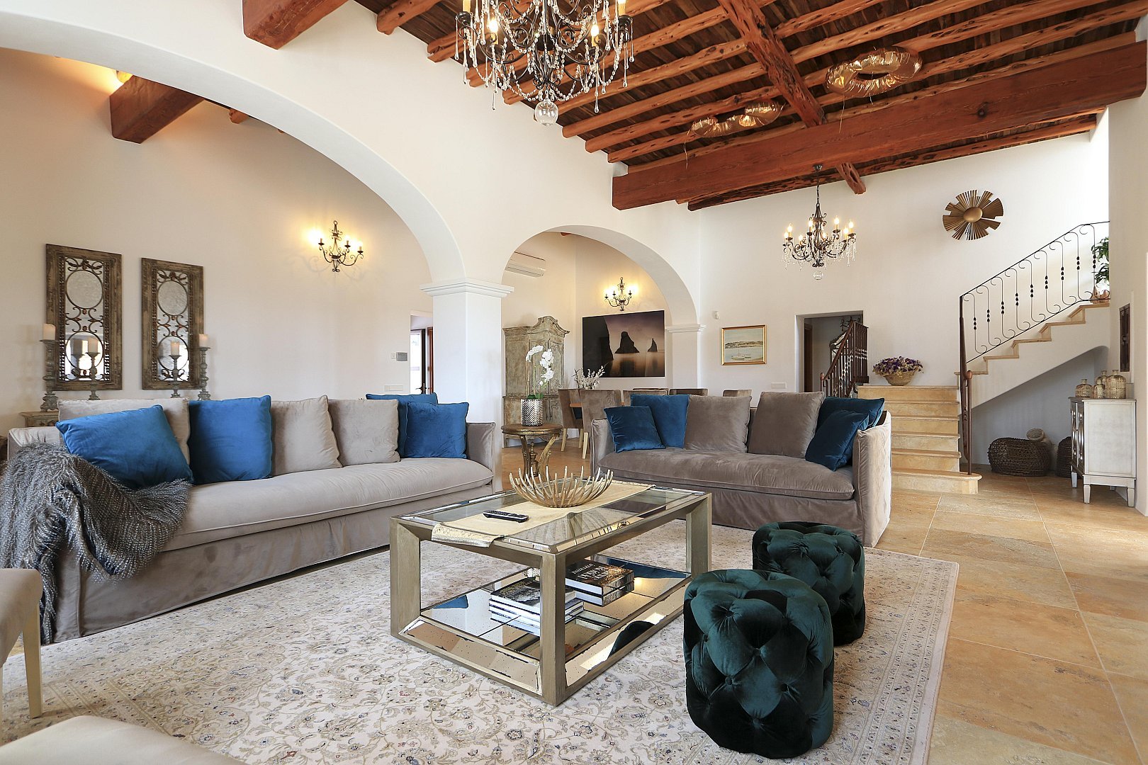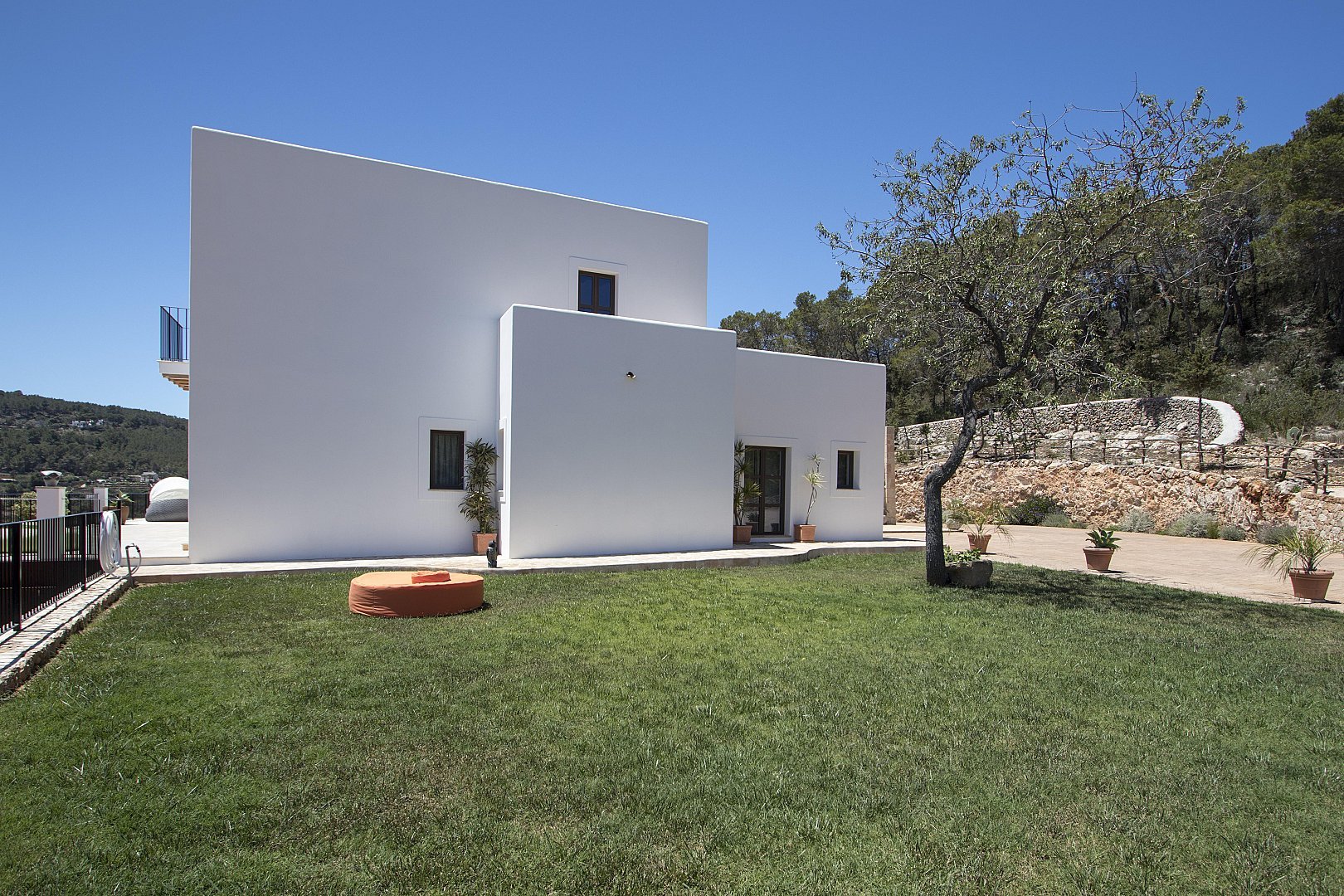 The main house features five beautifully designed double bedrooms, each offering a harmonious fusion of classic Ibizan architecture and contemporary luxury. With high juniper wood ceilings, multiple spacious living areas, and both indoor and outdoor dining options, this residence provides absolute privacy and comfort all year round.
