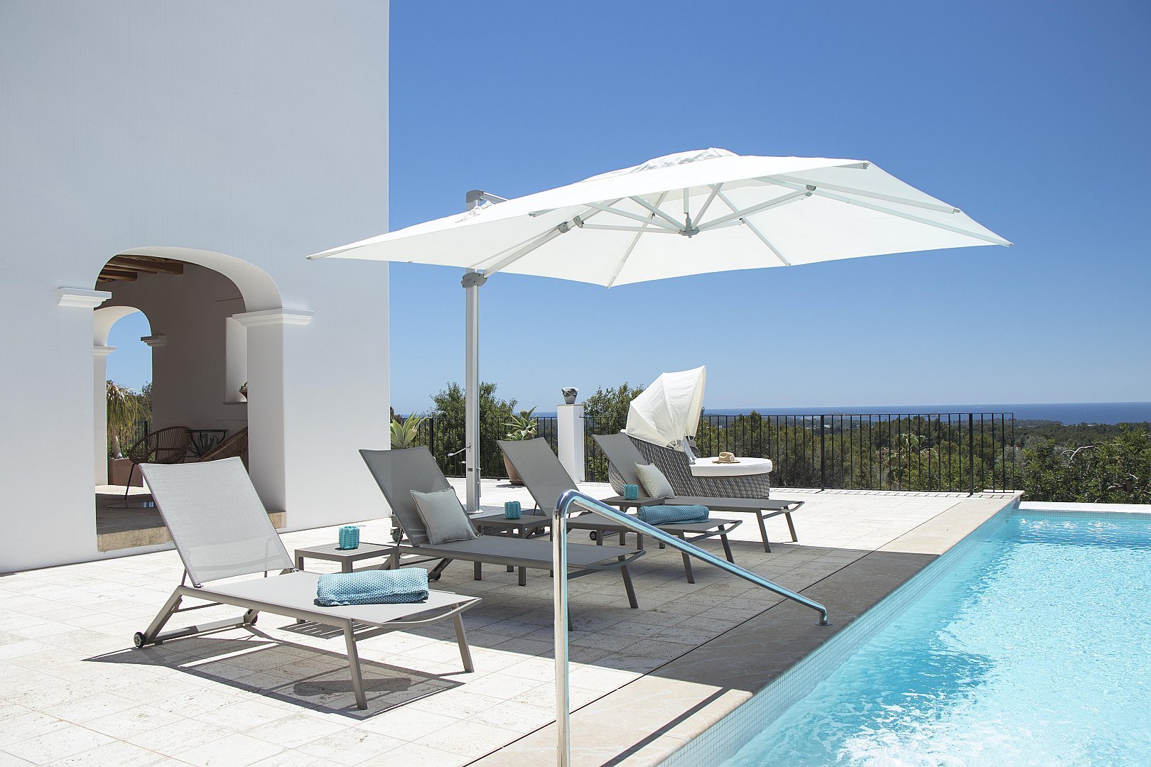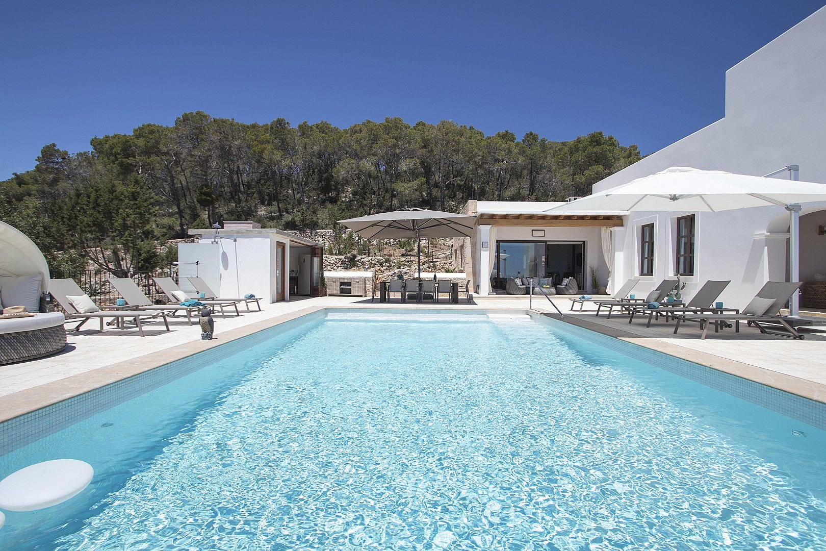 - 10m x 6m heated infinity pool surrounded by luxurious sunbeds and umbrellas
