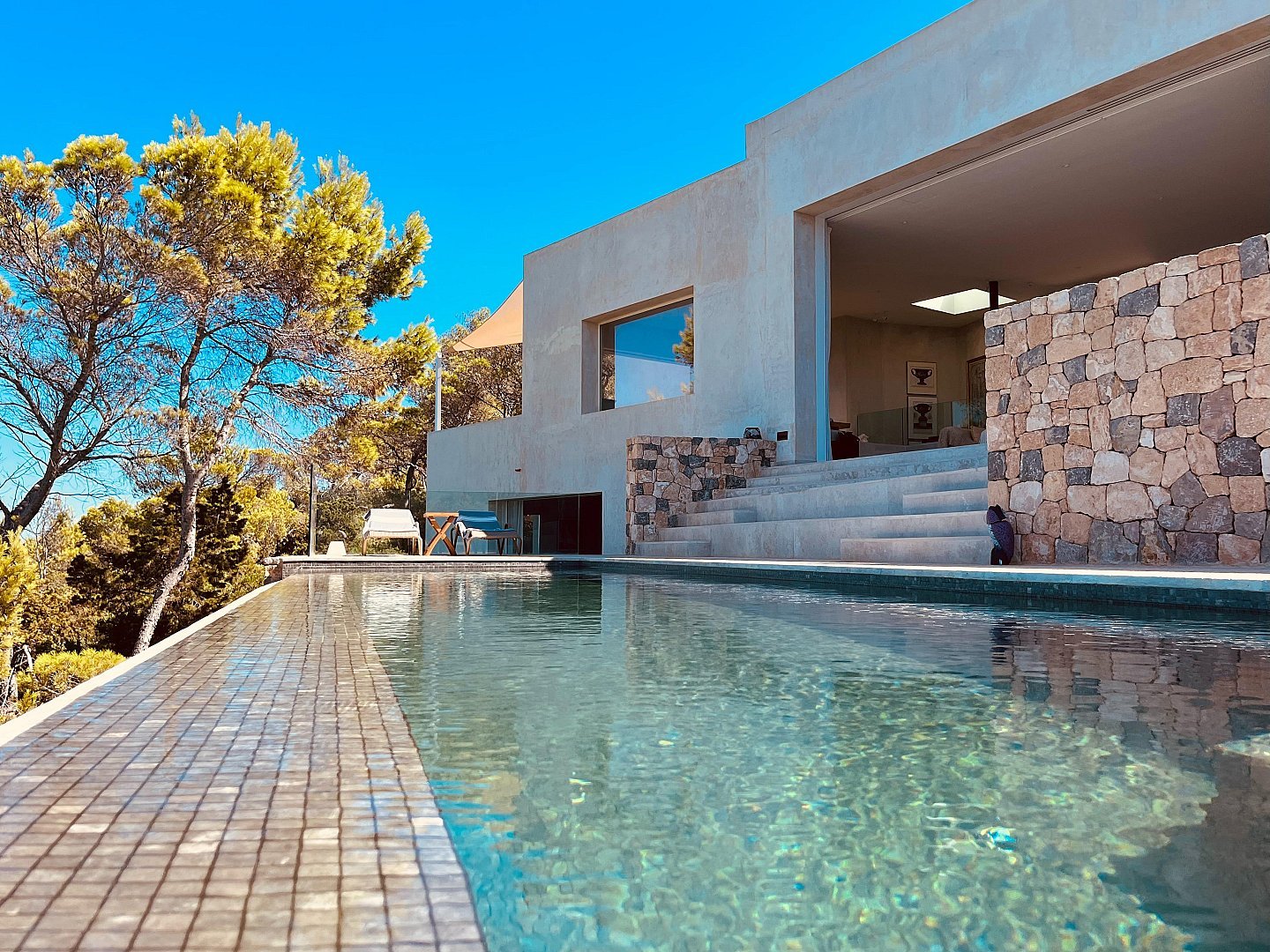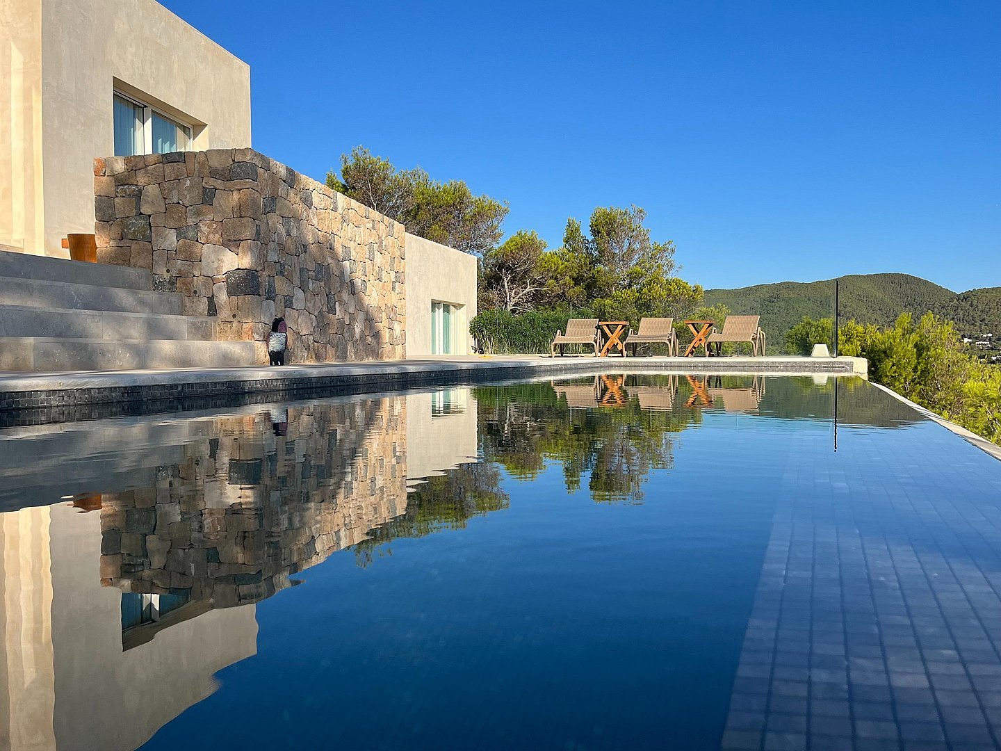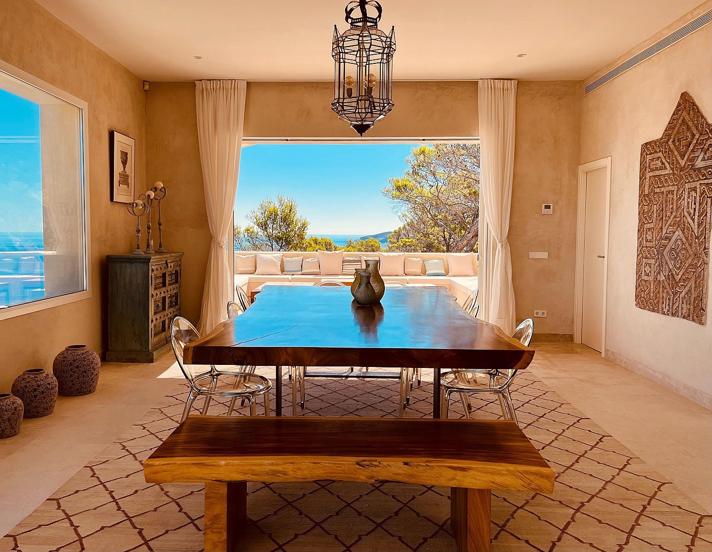 Nestled on a one-hectare forested plot near San Carlos in North-eastern Ibiza, this modern and spacious house boasts breathtaking sea views. With approximately 1,000 square meters of interior and outdoor space, including terraces, the property offers four double bedrooms with ensuite bathrooms, a lounge, a dining room, and a fully equipped kitchen. The decor is modern and eclectic, with comfortable, well-lit living spaces. A highlight is the sliding window providing unobstructed sea views, complemented by an infinity pool mirroring the turquoise tones of the Mediterranean.