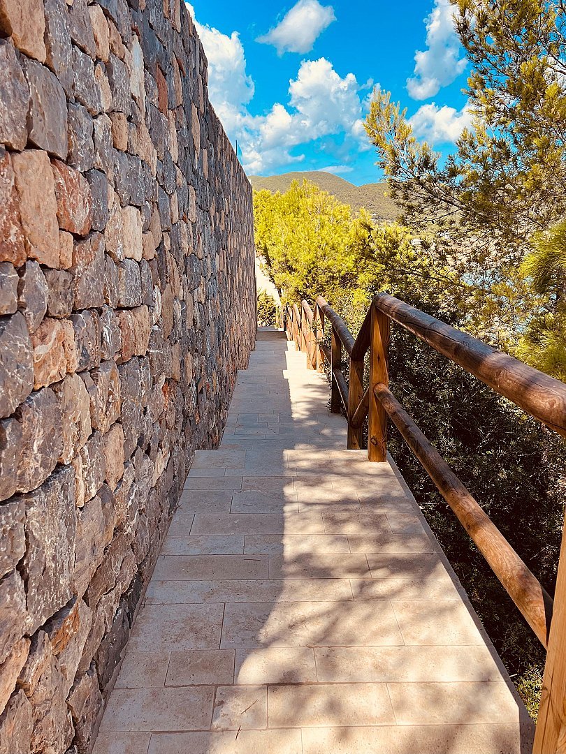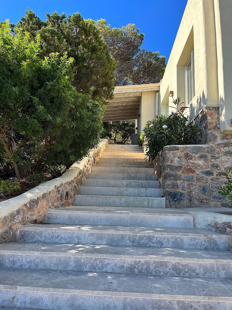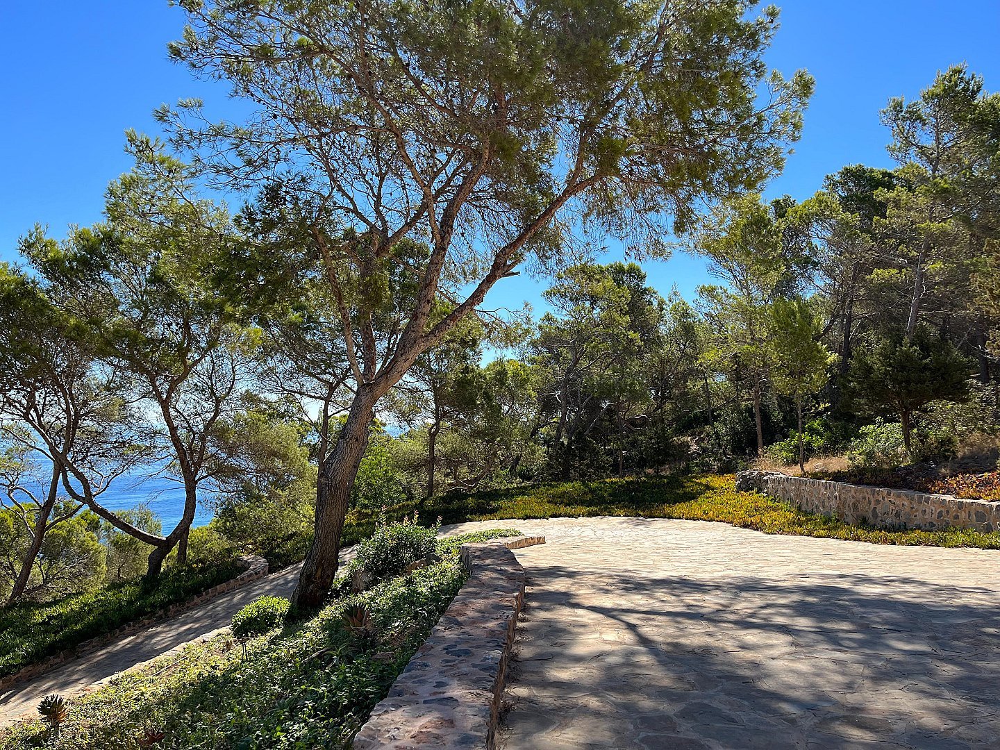 Direct access to the sea is a rare feature, facilitated by a rustic stone staircase leading to a secluded cove with calm turquoise waters and intriguing rock formations. The property enjoys relative privacy, with the surrounding forest and limited access to the coastline ensuring tranquility. While not completely isolated, a nearby family-oriented hotel remains unobtrusive and provides a sense of security. Ideal for those seeking a balance of seclusion and convenience, the property offers an idyllic setting for enjoying Ibiza's natural beauty and excellent gastronomy.