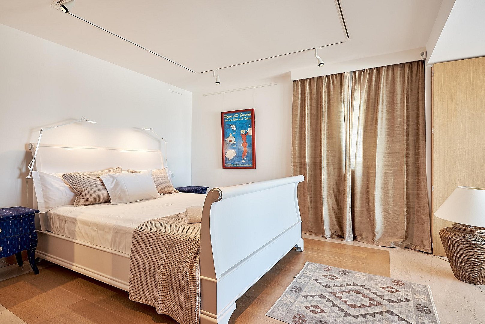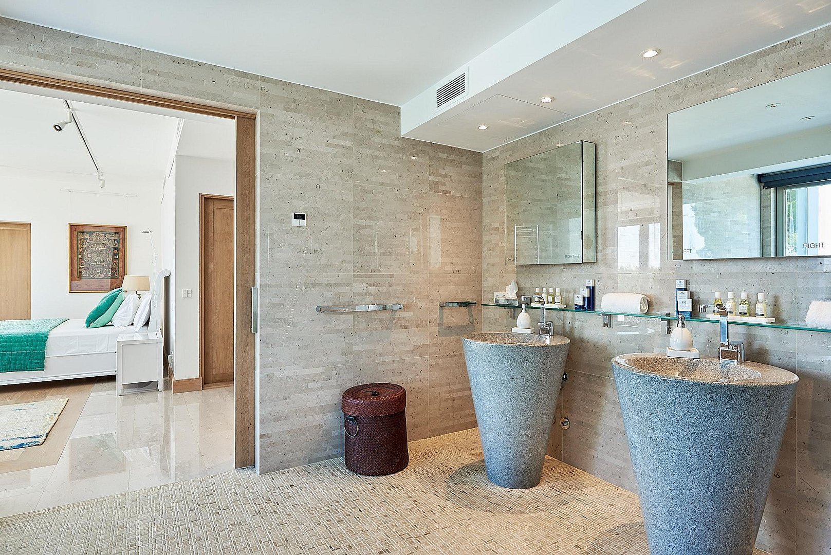 • Room 1/master bedroom: located on first floor with office hall, two dressing rooms, en-suite bathroom with shower and whirlpool bathtub, terrace with sunloungers and stunning views