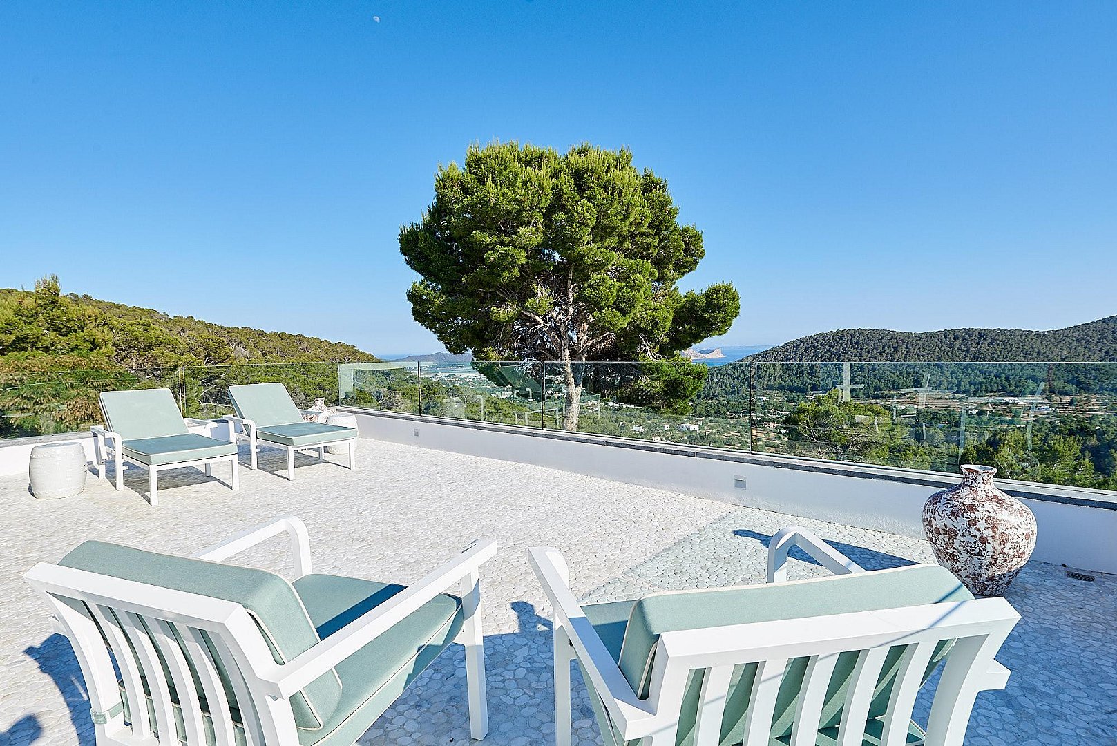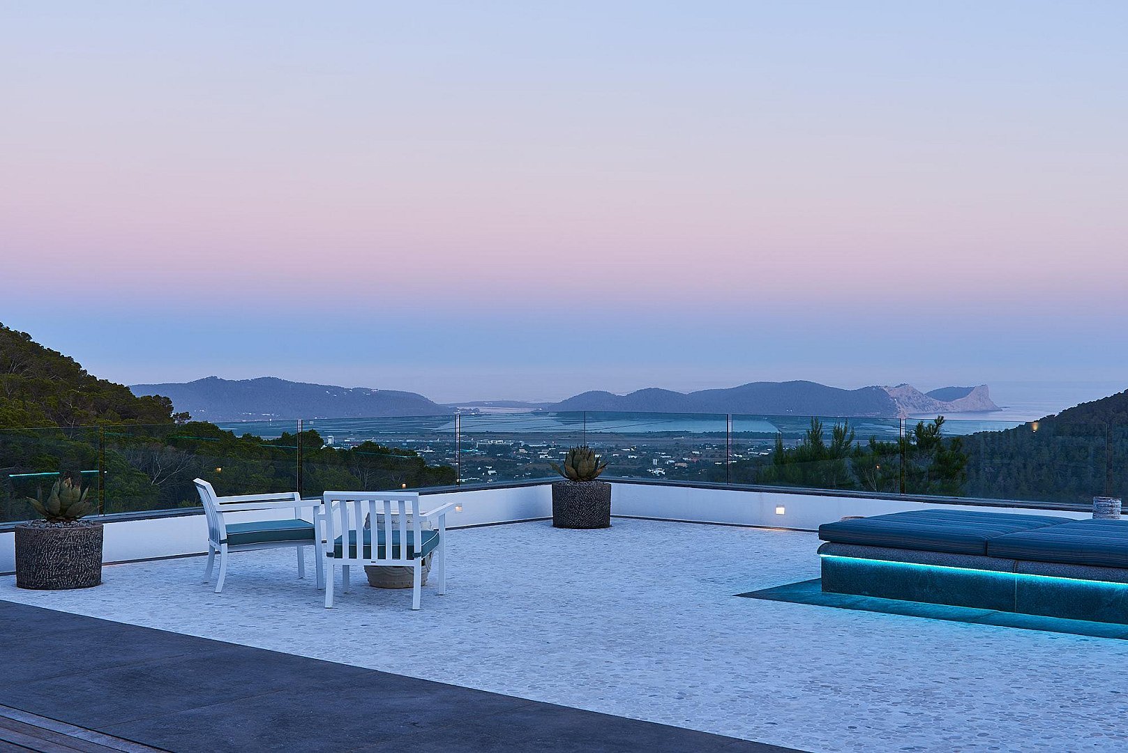 This property represents Ibizan top luxury at its best. Located high above the road from Ibiza town to San José we find this stunning villa. Set on an unspoiled green valley, it offers views over the southern hills of the island, the Salinas multicolored salt ponds, the Mediterranean sea and Formentera in the distance.