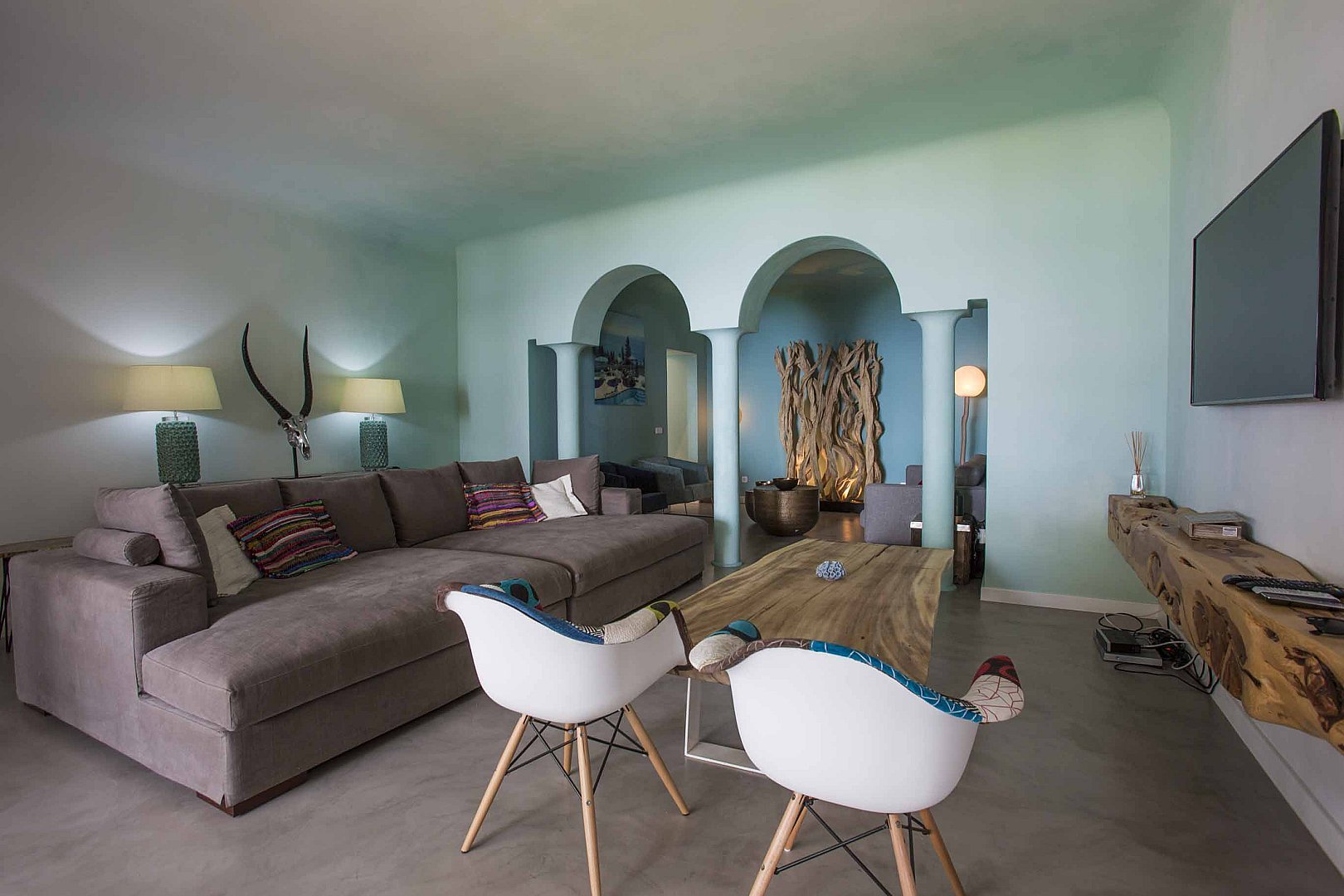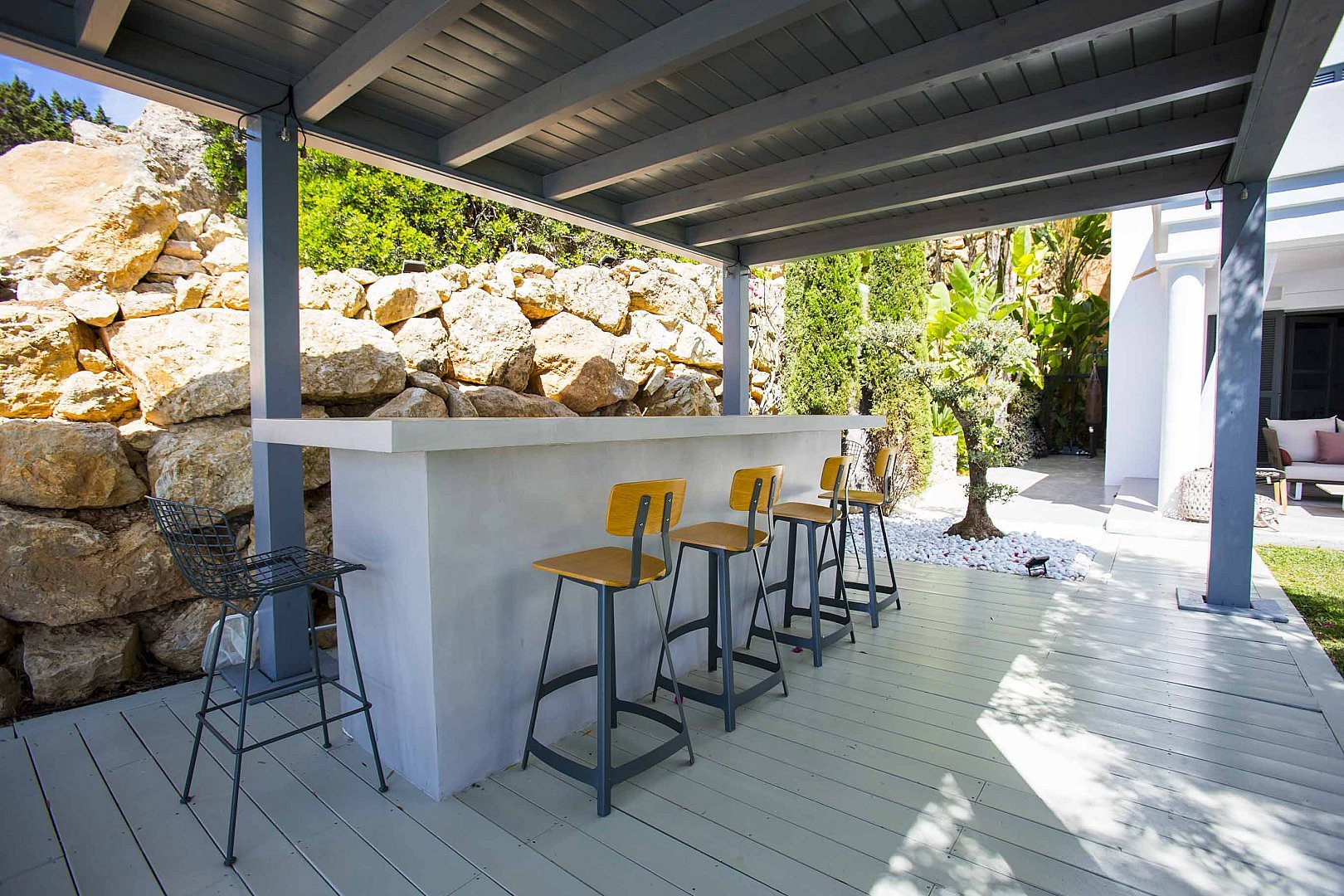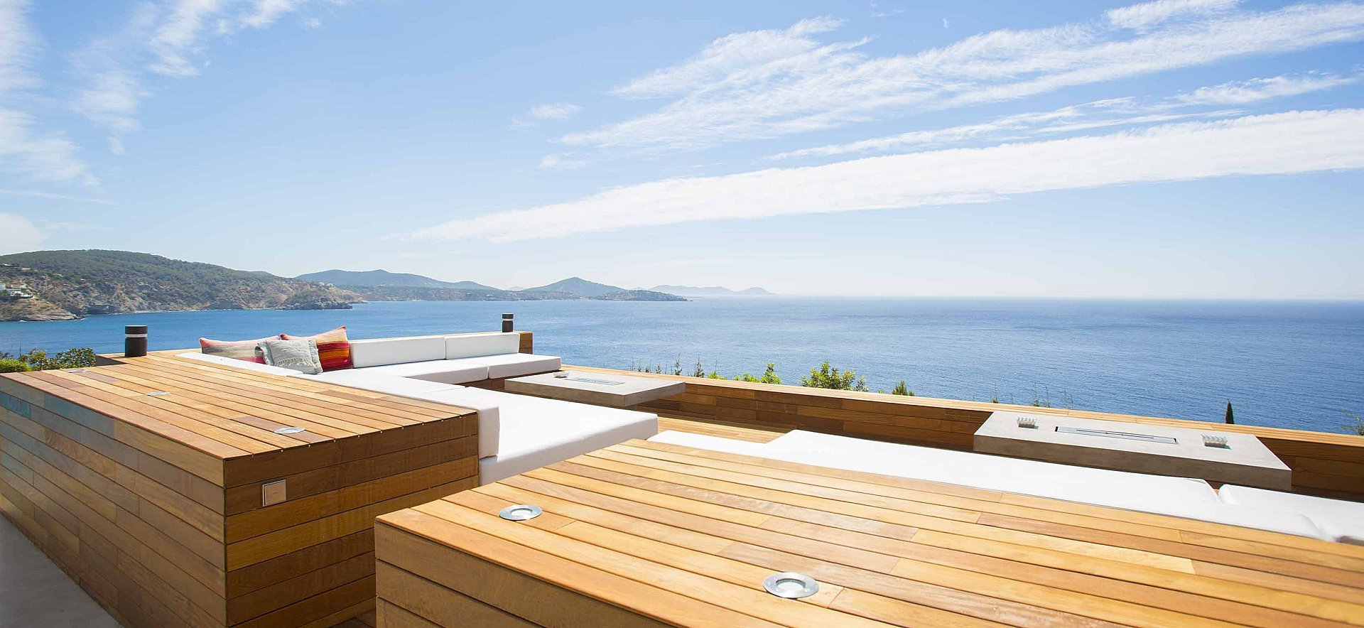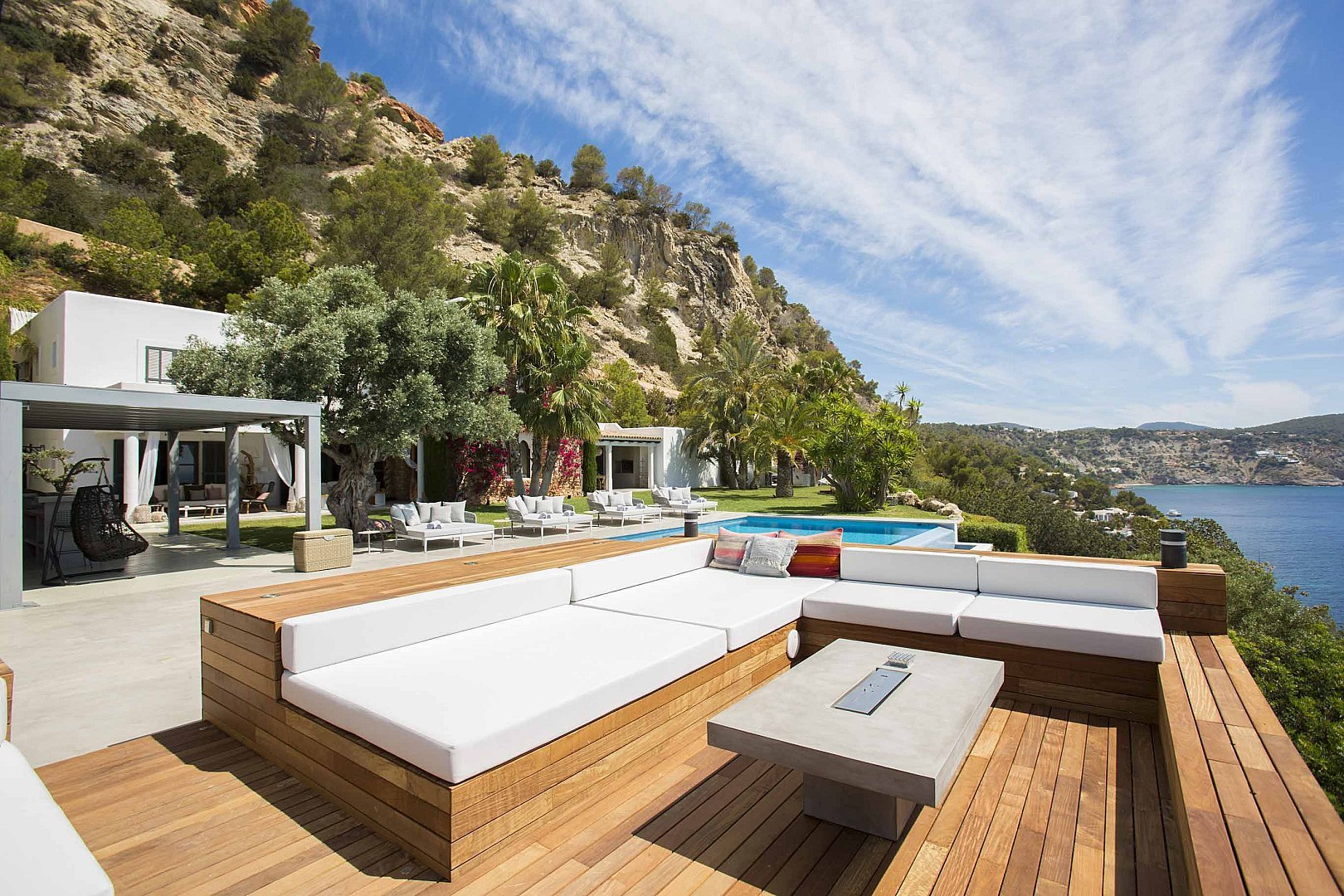 The open plan living area is a delightful choice of spaces in which to enjoy blissful rest and relaxation, including infinity pool of 18x5m, confortable sunbeds and a relax corner with sofas. Porch with al fresco dining table and barbeque for 14 pax all enjoying the view from the infinity pool that dangles above the deep blue Mediterranean Sea. This unique waterfront getaway is blessed with the most exhilarating views. It is ideal as a family residence for a fine luxury holiday experience, as well as more than suitable for a group of friends looking for the perfect villa for a perfect Ibiza holiday far from the crowds and accompanied only by outstanding scenery and view.