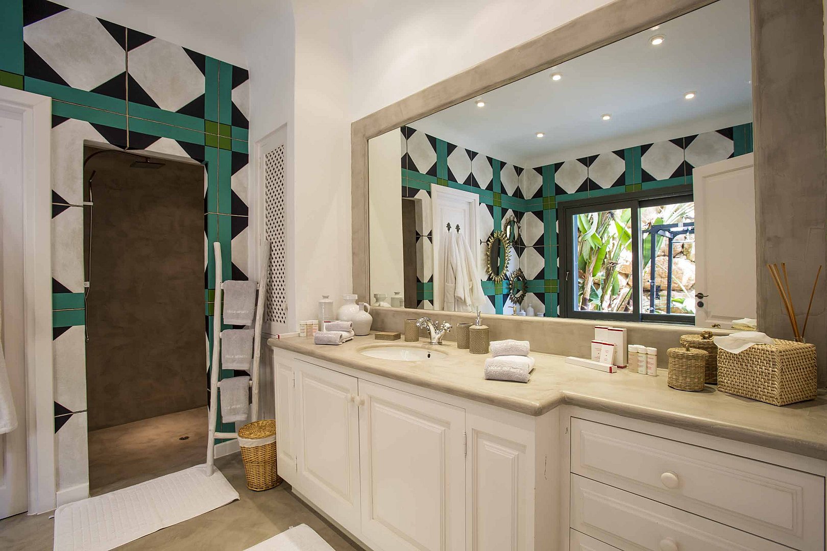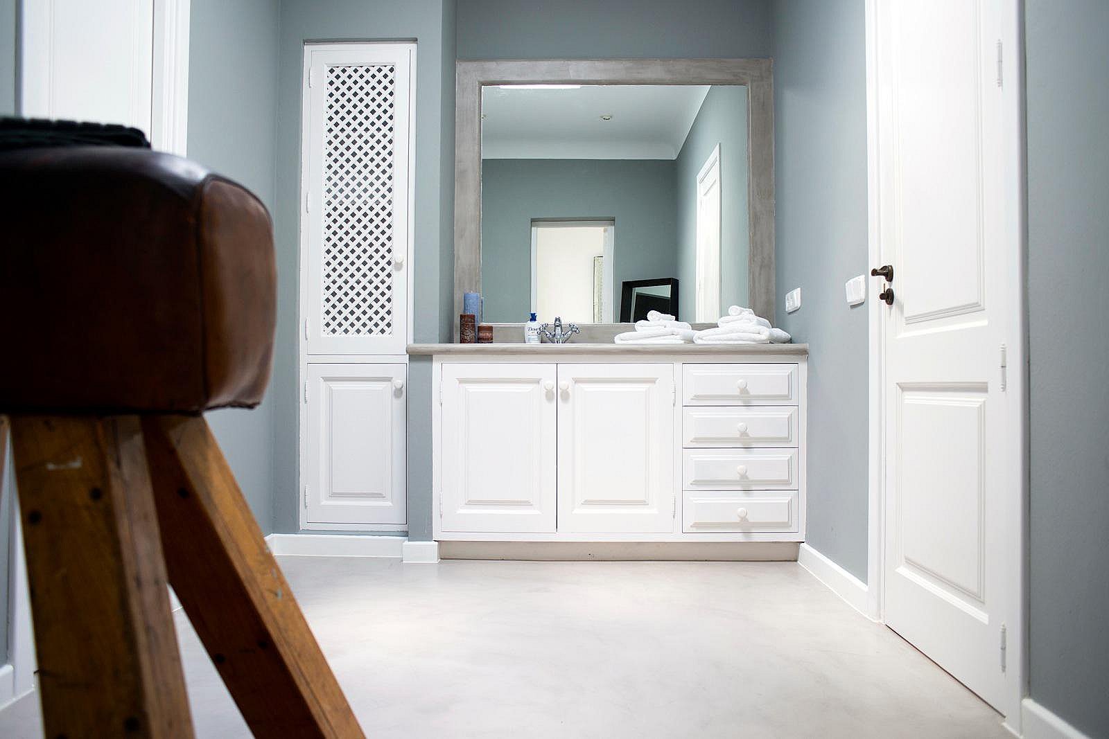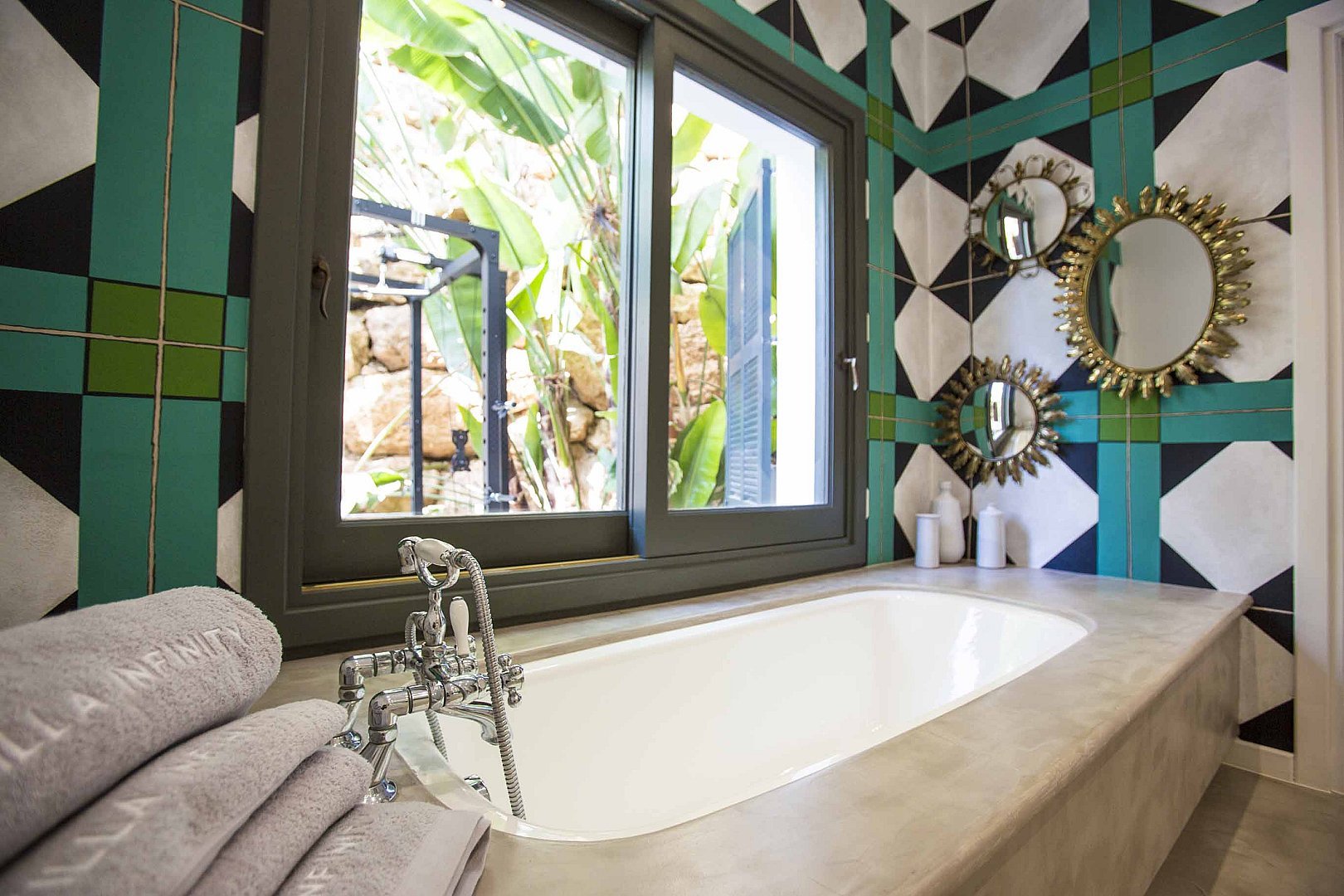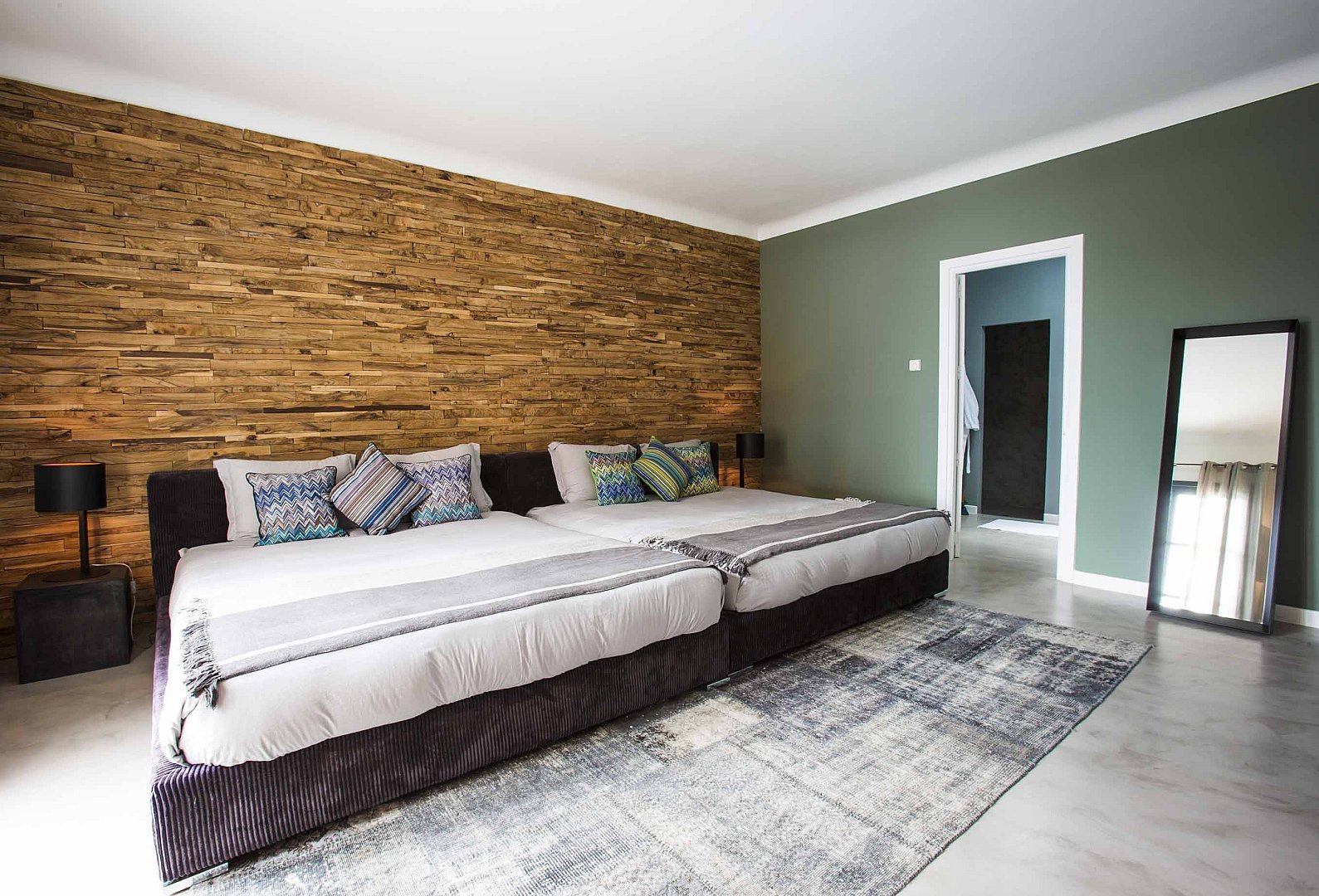 - 2 separate elegant double bedrooms en-suite measuring each 30 square meters designed to offer a unique experience. Located on the lower floor of the villa with direct access to a private outdoor terrace with sun beds that allow guests to relax