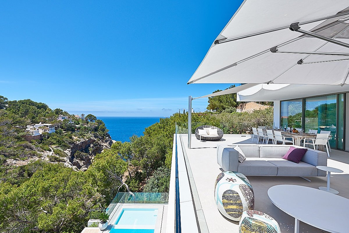 The villa is located on top of the hill leading to the beach of Cala Molí, in the southwest of Ibiza. Around the properties, we find some of the finest beaches on the island. Cala Vedella, Cala Tarida, Cala Conte, and Cala Bassa are just 5 to 10 minutes away by car. It takes just 10-15 minutes from the house to get to the village of San José, with all its services and attractions. Getting to the airport and Ibiza town will take us just 20-25 minutes from the villa.