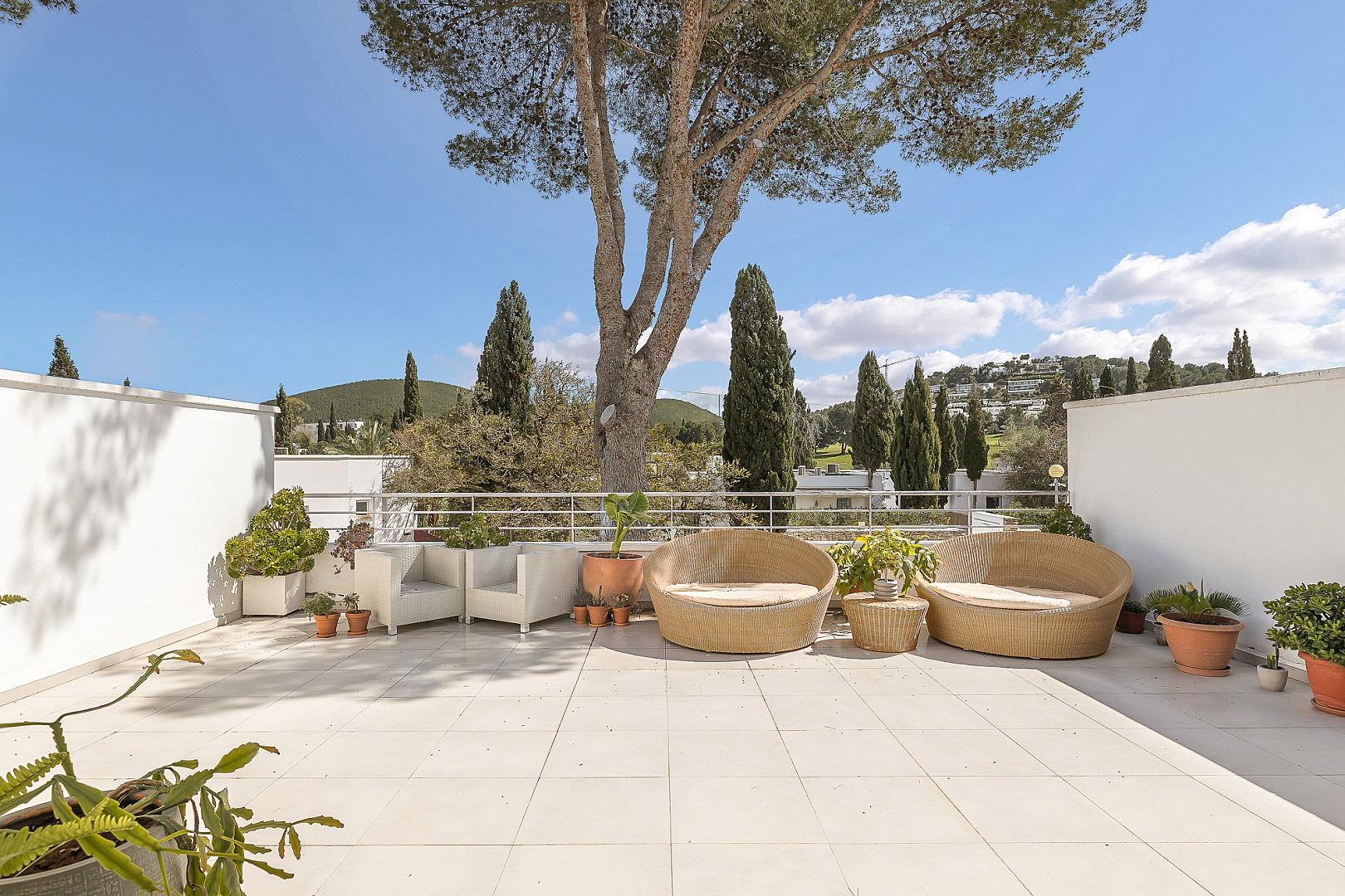 Located within the exclusive gated community of Roca Llisa, this bright and modern presented apartment offers generous indoor and outdoor living spaces with open views over the surrounding residential area and the nearby golf course. The property features approximately 112 m² of interior living space complemented by an impressive terrace of nearly 80 m², perfectly oriented to the south-east. Thanks to this orientation, the apartment enjoys abundant natural light and sunshine throughout the day, while the surrounding vegetation provides pleasant shade and privacy during the warmer months. The layout is both functional and inviting. Upon entering, you are welcomed by a spacious open-plan living and dining area with an integrated kitchen, creating a comfortable and social atmosphere ideal for everyday living as well as entertaining. The apartment offers three bedrooms in total. The master bedroom features its own en-suite bathroom, while the two additional bedrooms share a second generously sized bathroom. Ceiling fans in the master bedroom, along with air conditioning and heating throughout the property, ensure year-round comfort. The property was renovated in 2025, giving it a fresh and modern feel while maintaining a warm and welcoming ambiance. A particularly attractive feature is the private covered parking space. If desired, it would be technically possible to create a direct internal access from the parking space into the apartment, further enhancing convenience and privacy. Additional parking is also available along the nearby street, providing space for visitors or extra vehicles. In addition to the main terrace connected to the living area, the entrance of the apartment also offers another spacious outdoor area, adding to the overall sense of openness. The terrace itself provides open views across the surrounding landscape and the golf course, offering a peaceful setting to enjoy outdoor dining or relaxing afternoons. This property represents an excellent opportunity for those seeking a bright, spacious and well-located apartment within one of Ibiza’s most desirable residential communities.