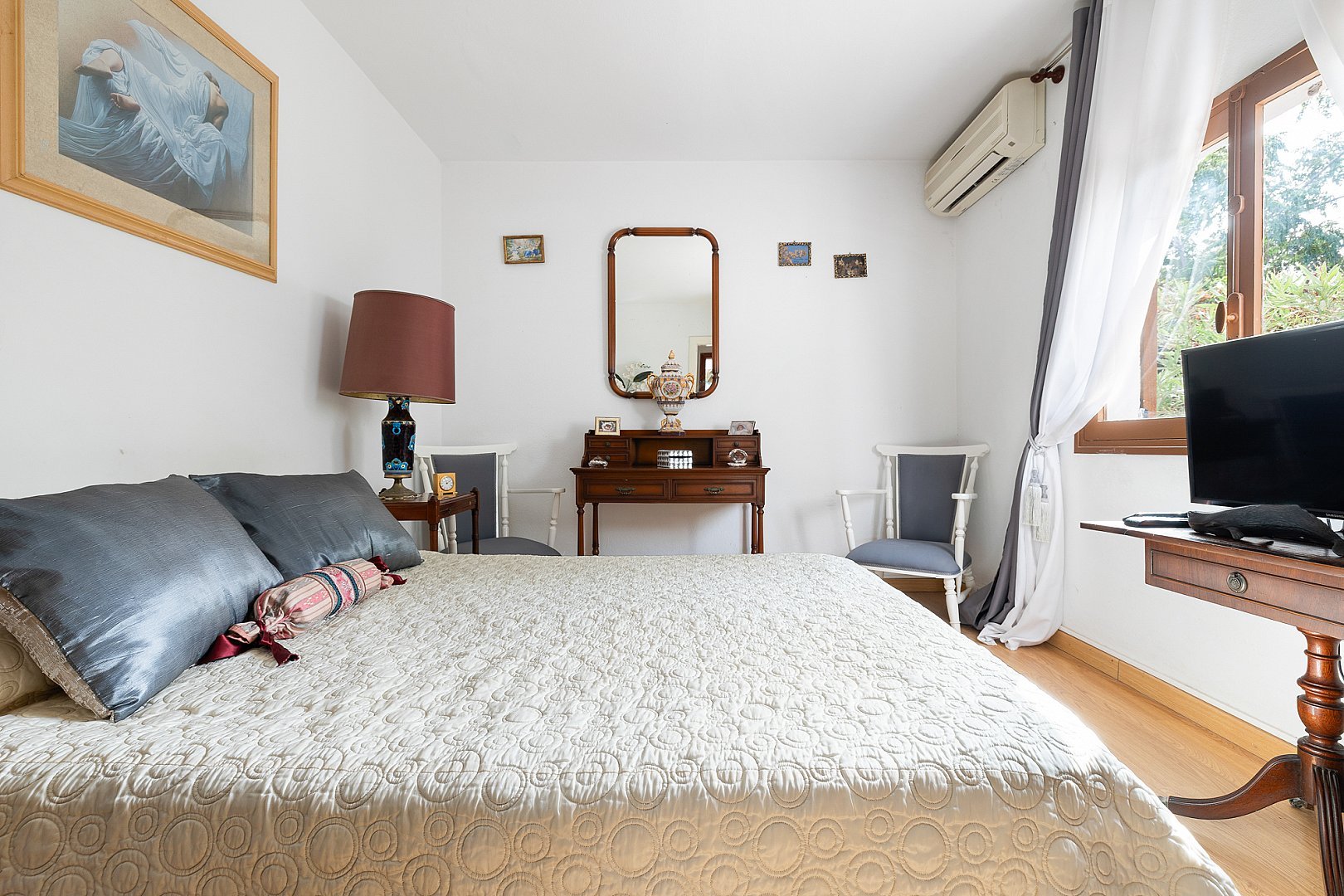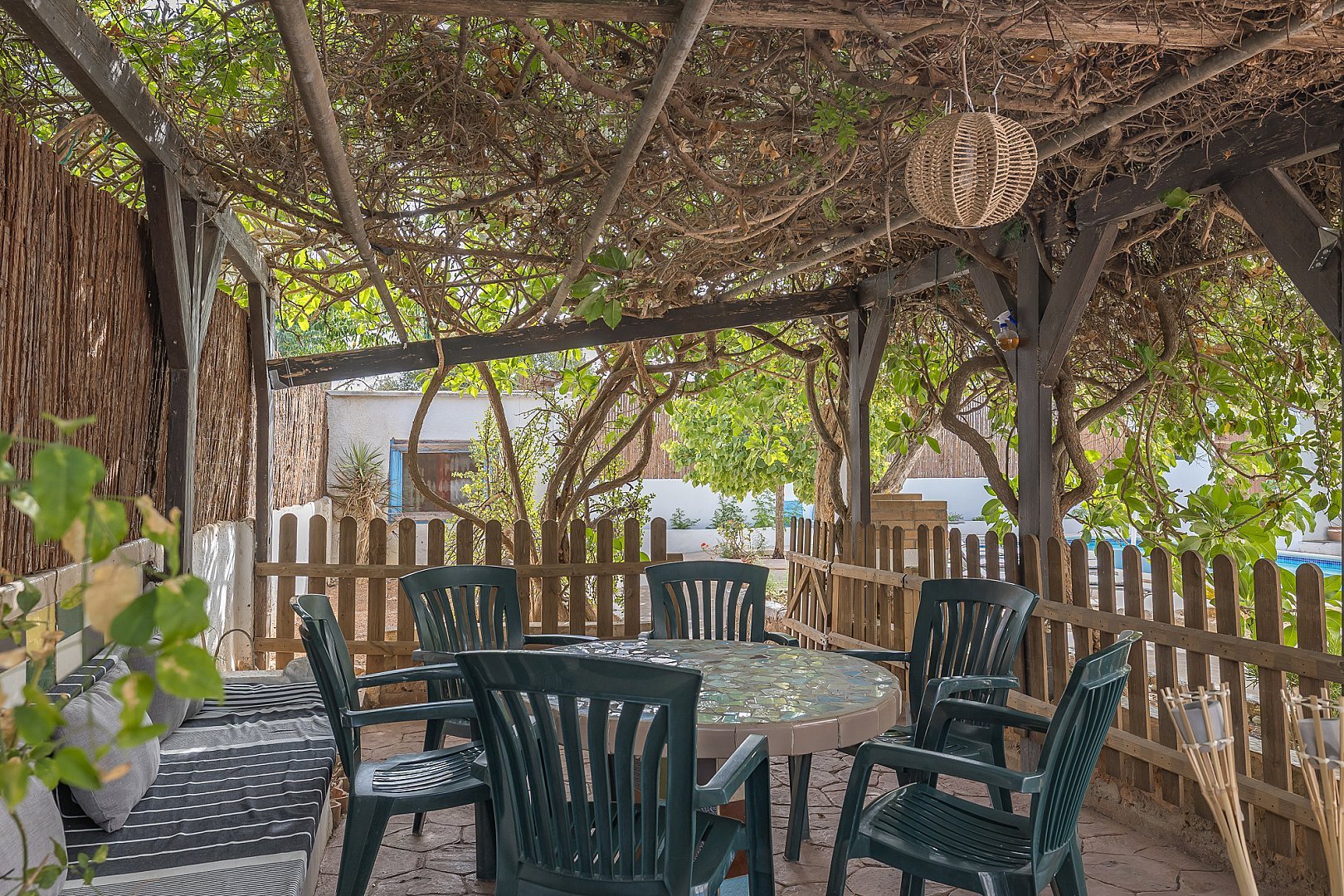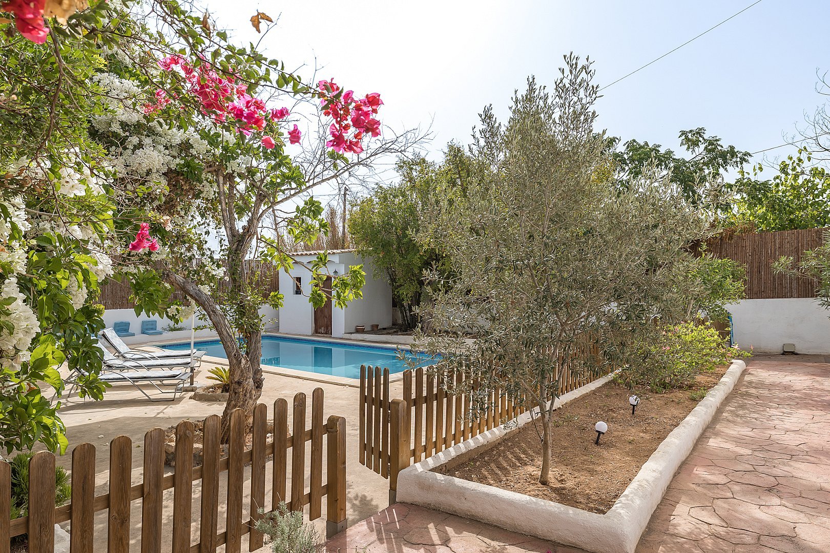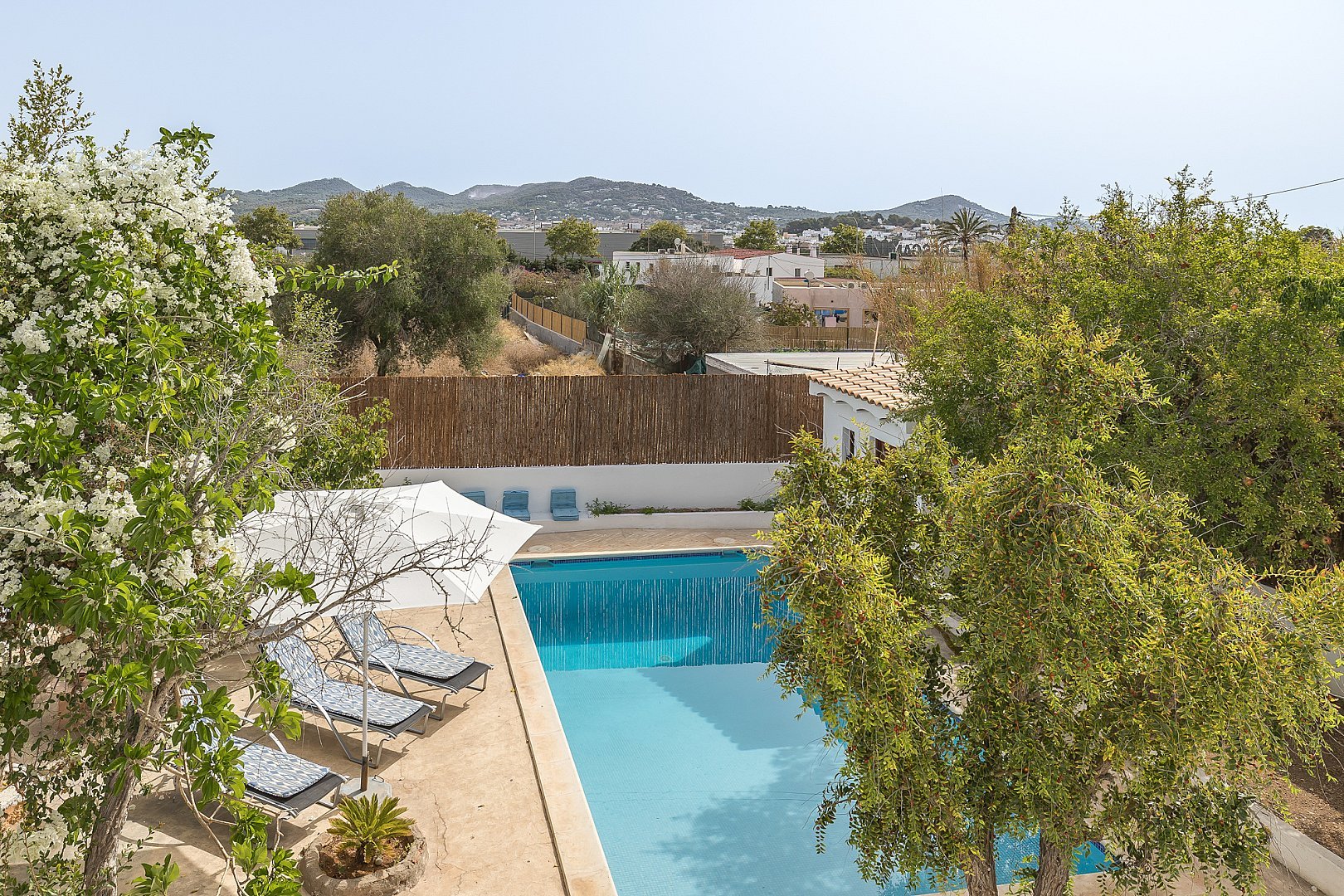 This charming oasis is nestled on a quiet side road at the end of Ibiza's industrial area, known as "Can Bufi". Upon entering the property, you'll discover a cozy courtyard with trees that leads to the main entrance of the house and the pool area. The property features three bedrooms with one bathroom on the ground floor and a guest studio with living room, kitchenette, and bathroom with individual access on the first floor. The living spaces are divided into a spacious living room with a fireplace and a kitchen with dining area and access to the outdoor spaces. The pool area offers ample space for sun loungers and a shaded dining area surrounded by vibrant bougainvillea flowers. From the rooftop, enjoy panoramic views of the lush surroundings and the mountains. One of the property's greatest assets is its secluded location, providing ultimate privacy and tranquility, yet it's just a short drive to Ibiza Town, the marina, and the airport. The property also includes a garage for added convenience