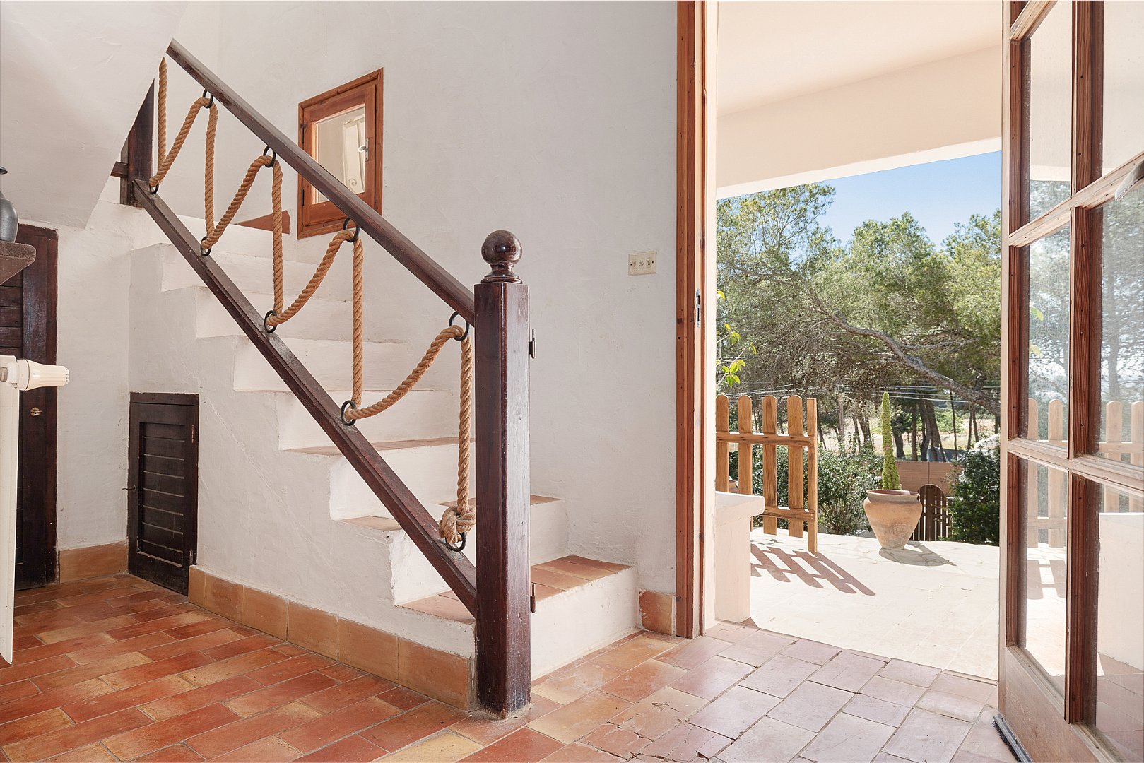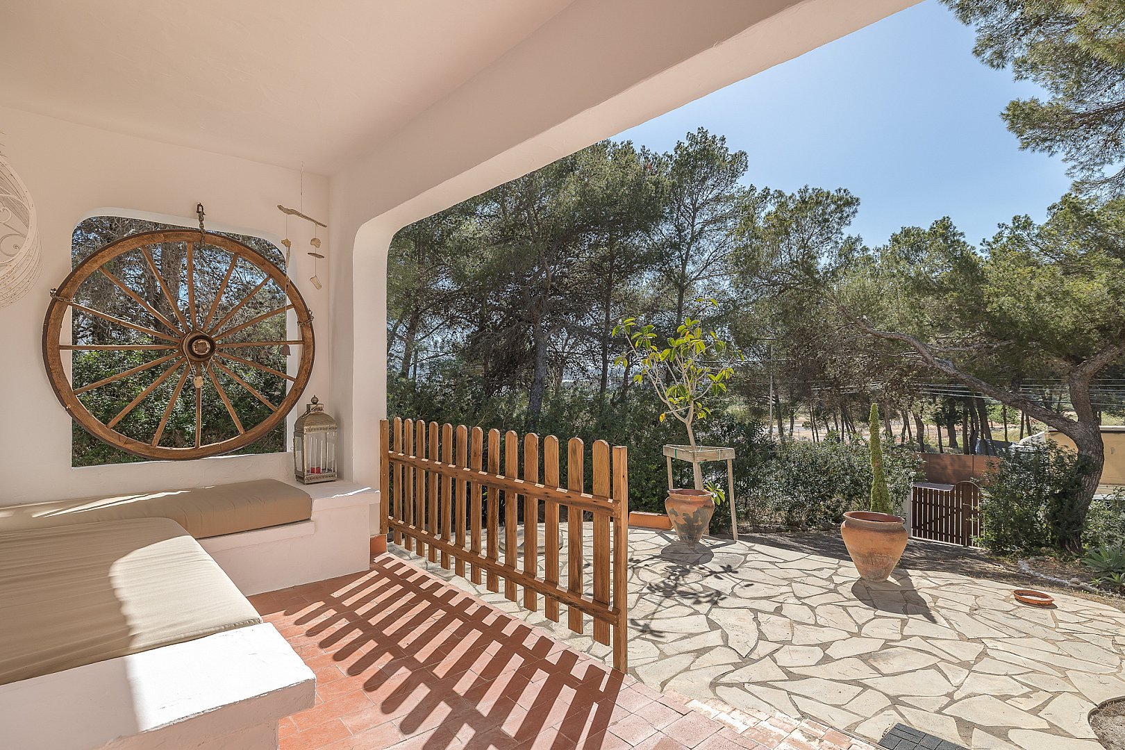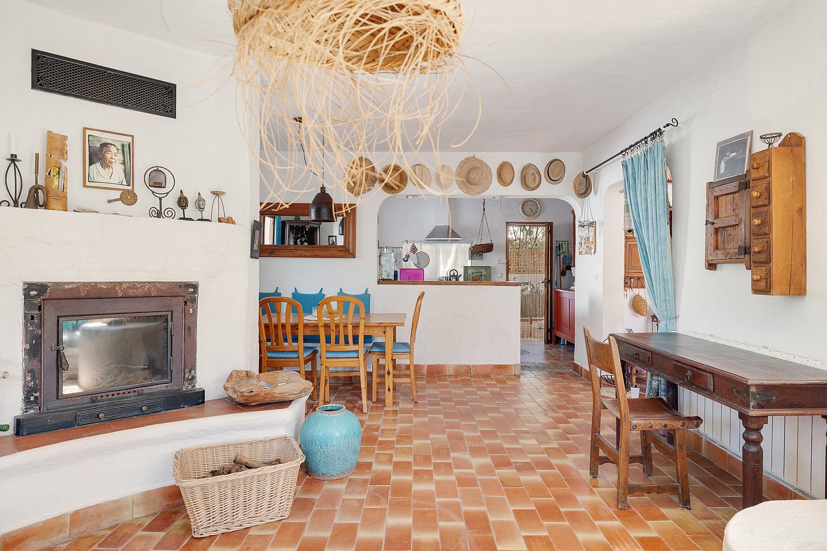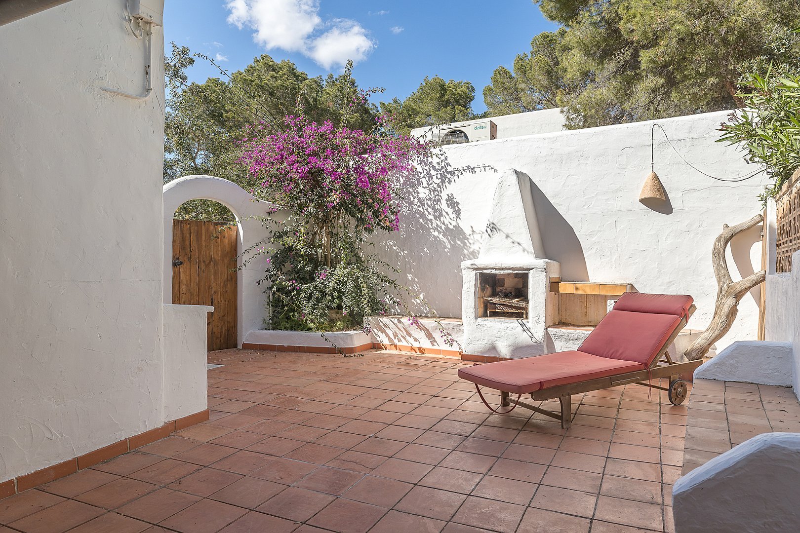 This charming, traditional Ibizan finca is located just a few minutes' walk from the beaches of Cala Martina and Platja des Canar. Shops, restaurants, and bars for daily needs are also within easy walking distance, making the property ideal for enjoying the vibrant yet relaxed coastal lifestyle. The house is distributed over two floors. On the ground floor, there is an open-plan living and kitchen area with a cosy fireplace, offering direct access to a lovely rear terrace. Here, a small workshop and an outdoor kitchen area invite you to enjoy life under the Mediterranean sun. A bedroom and a bathroom complete the ground level. Upstairs, there are two additional bedrooms and a bathroom, with each room opening to one of three terraces. The terraces face southwest, providing sunny outdoor spaces and beautiful sunset views. The lushly planted garden features mature trees that offer both shade and privacy. In front of the house, a spacious terrace creates an inviting space for relaxing or entertaining guests. Additional features include electric heating and a traditional fossa negra system. This property, with its authentic character and prime location close to the beach, is perfect as a charming holiday retreat or as a year-round residence in one of Ibiza’s most beloved areas.