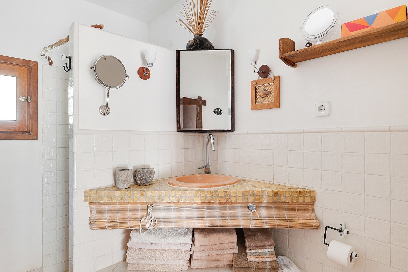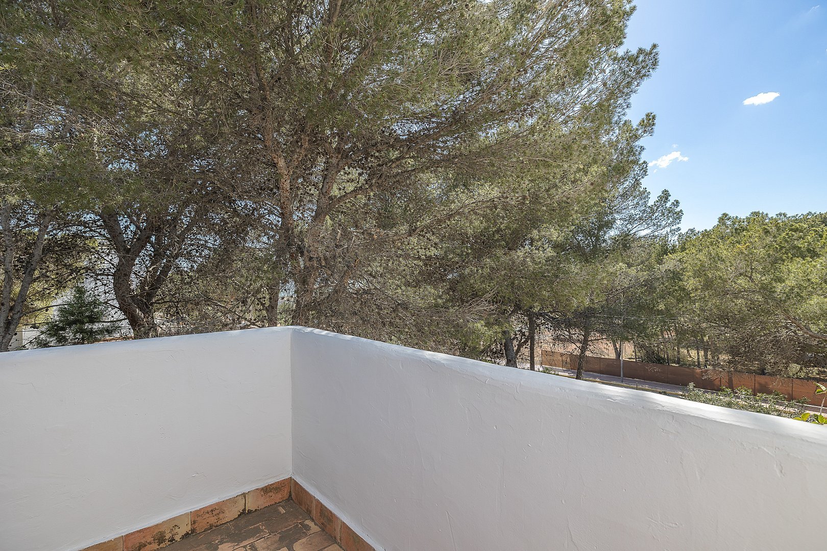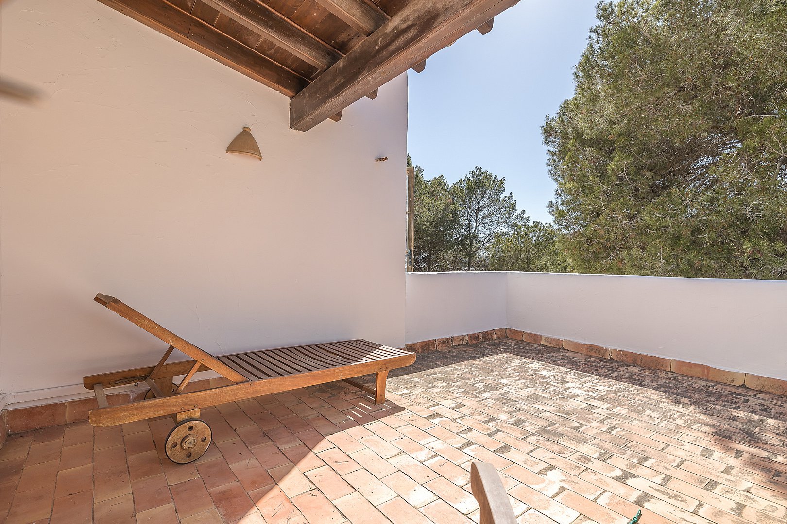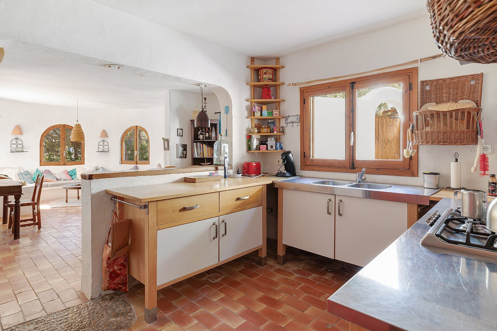This charming, traditional Ibizan finca is located just a few minutes' walk from the beaches of Cala Martina and Platja des Canar. Shops, restaurants, and bars for daily needs are also within easy walking distance, making the property ideal for enjoying the vibrant yet relaxed coastal lifestyle. The house is distributed over two floors. On the ground floor, there is an open-plan living and kitchen area with a cosy fireplace, offering direct access to a lovely rear terrace. Here, a small workshop and an outdoor kitchen area invite you to enjoy life under the Mediterranean sun. A bedroom and a bathroom complete the ground level. Upstairs, there are two additional bedrooms and a bathroom, with each room opening to one of three terraces. The terraces face southwest, providing sunny outdoor spaces and beautiful sunset views. The lushly planted garden features mature trees that offer both shade and privacy. In front of the house, a spacious terrace creates an inviting space for relaxing or entertaining guests. Additional features include electric heating and a traditional fossa negra system. This property, with its authentic character and prime location close to the beach, is perfect as a charming holiday retreat or as a year-round residence in one of Ibiza’s most beloved areas.