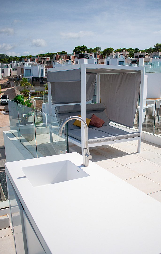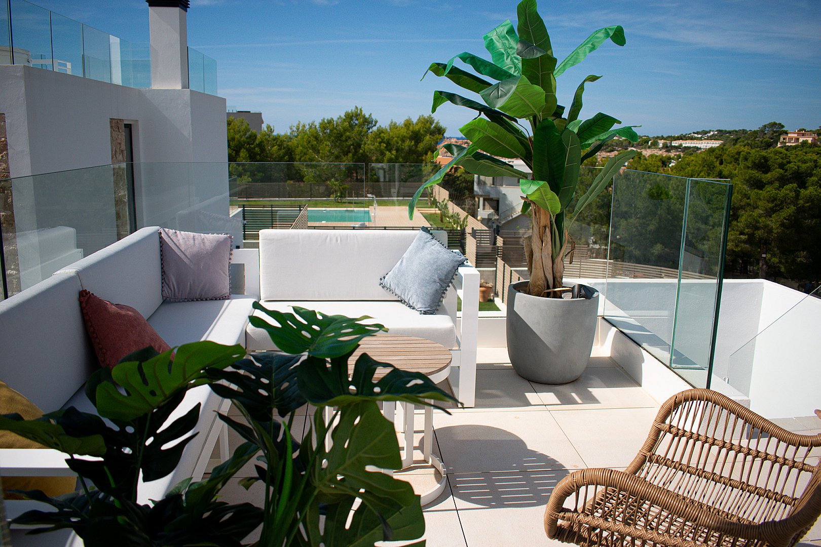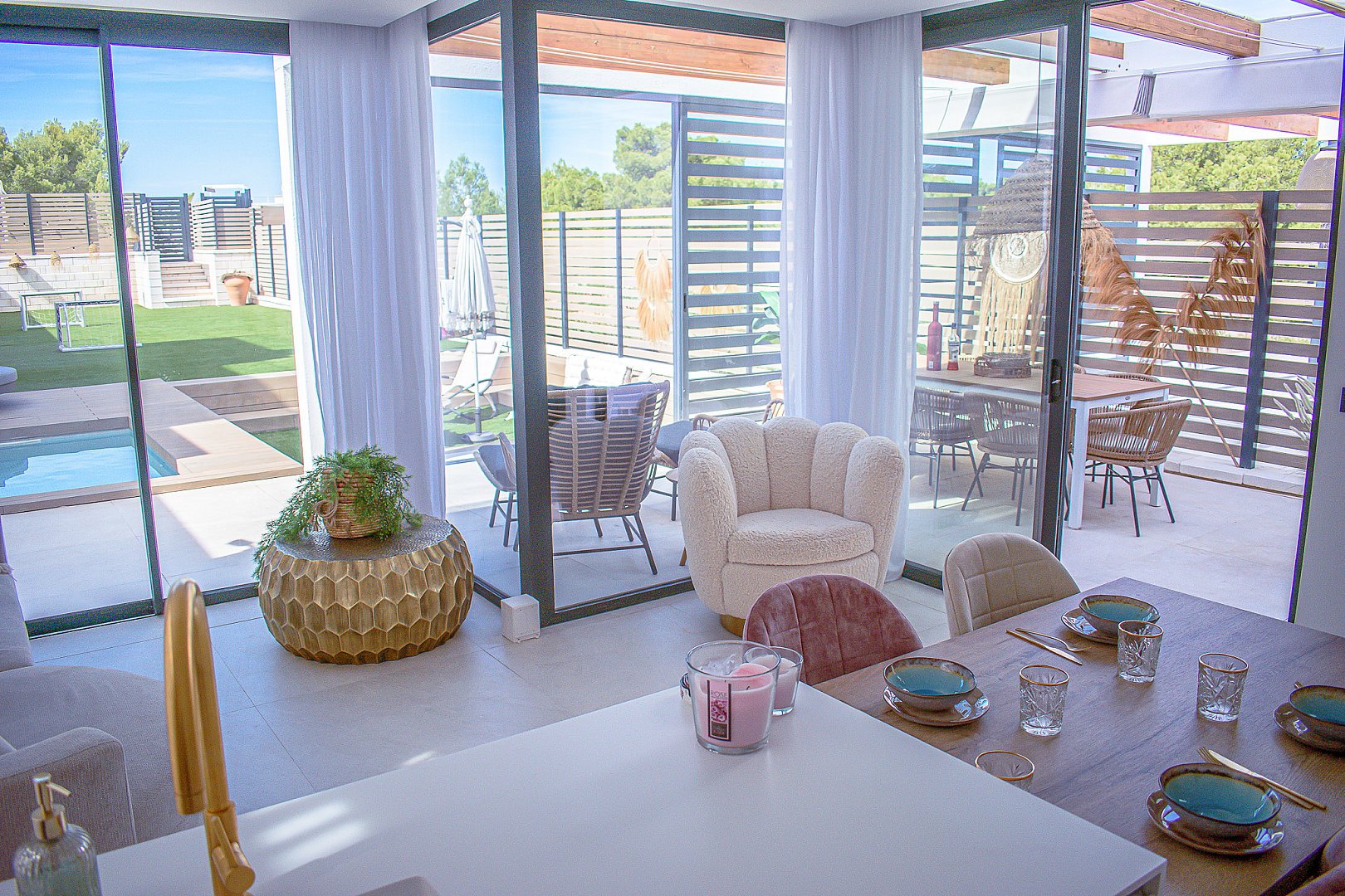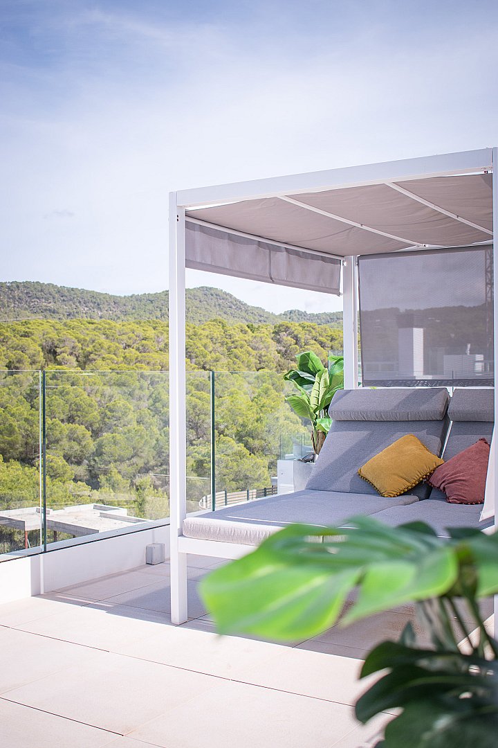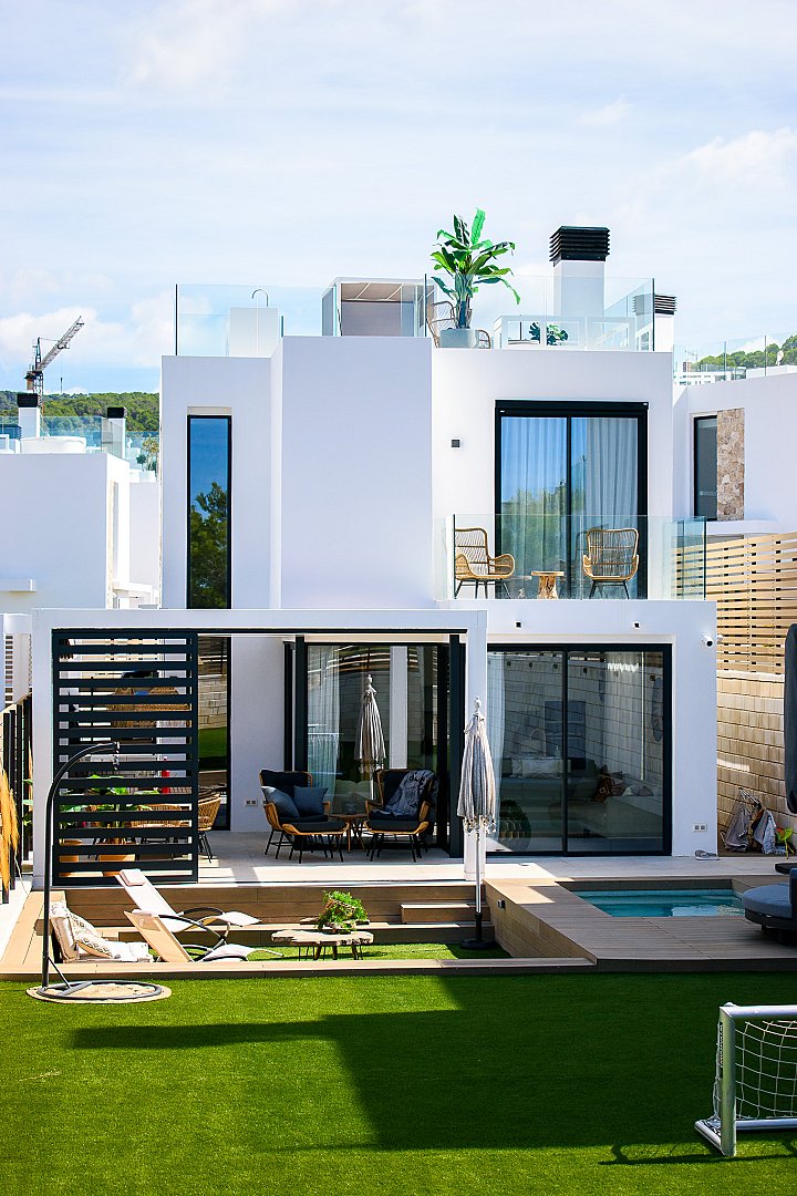 This contemporary villa is located within walking distance of the beautiful sandy beach of Cala Tarida. The bright open-plan living area connects seamlessly to the exterior through large floor-to-ceiling windows, filling the interiors with natural light. The townhouse features three bedrooms and two bathrooms, combining comfort, style, and functionality. Designed with modern Mediterranean living in mind, the property offers a private garden with a swimming pool and a spacious rooftop terrace boasting spectacular sea views. The rooftop terrace includes an outdoor kitchen, a chill-out area and the option to install a jacuzzi — perfect for relaxing and enjoying Ibiza’s famous sunsets in complete privacy. A refined combination of contemporary design, quality finishes, and a tranquil coastal setting makes this home ideal for those seeking relaxed luxury living by the sea.