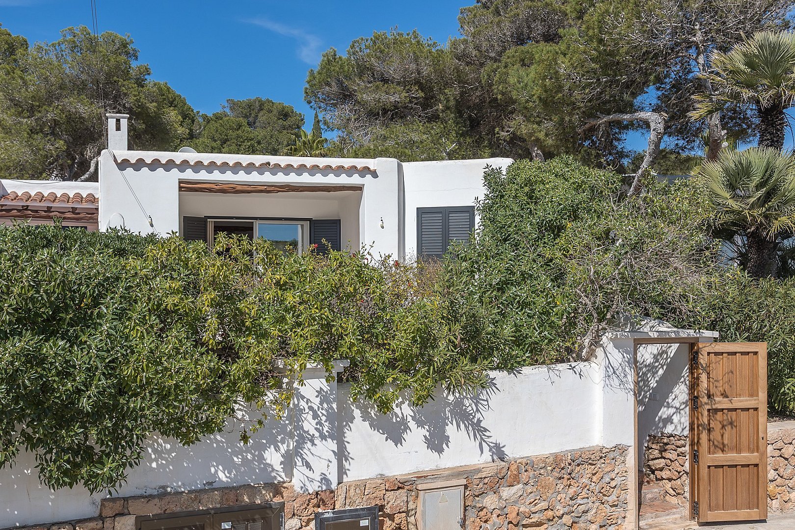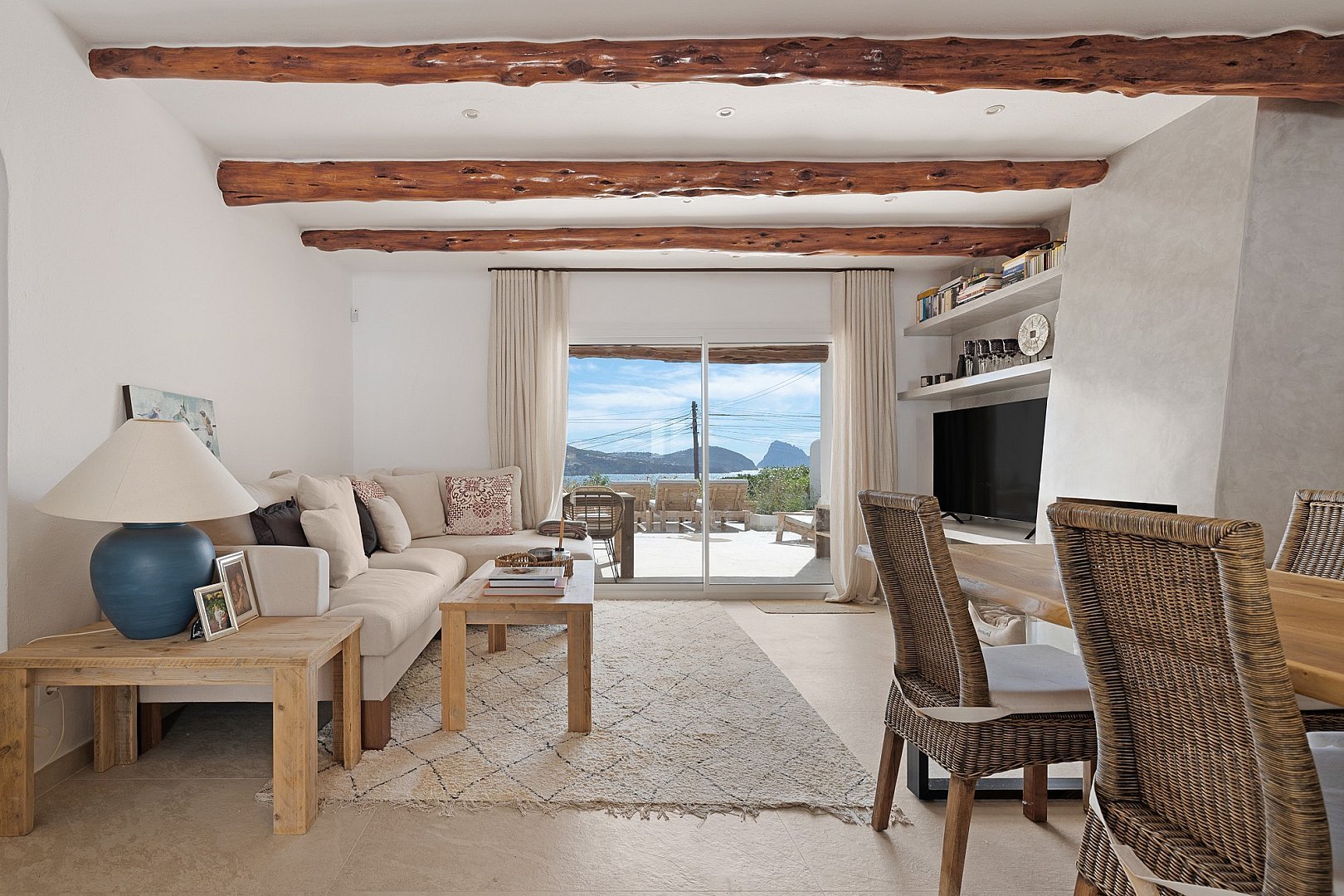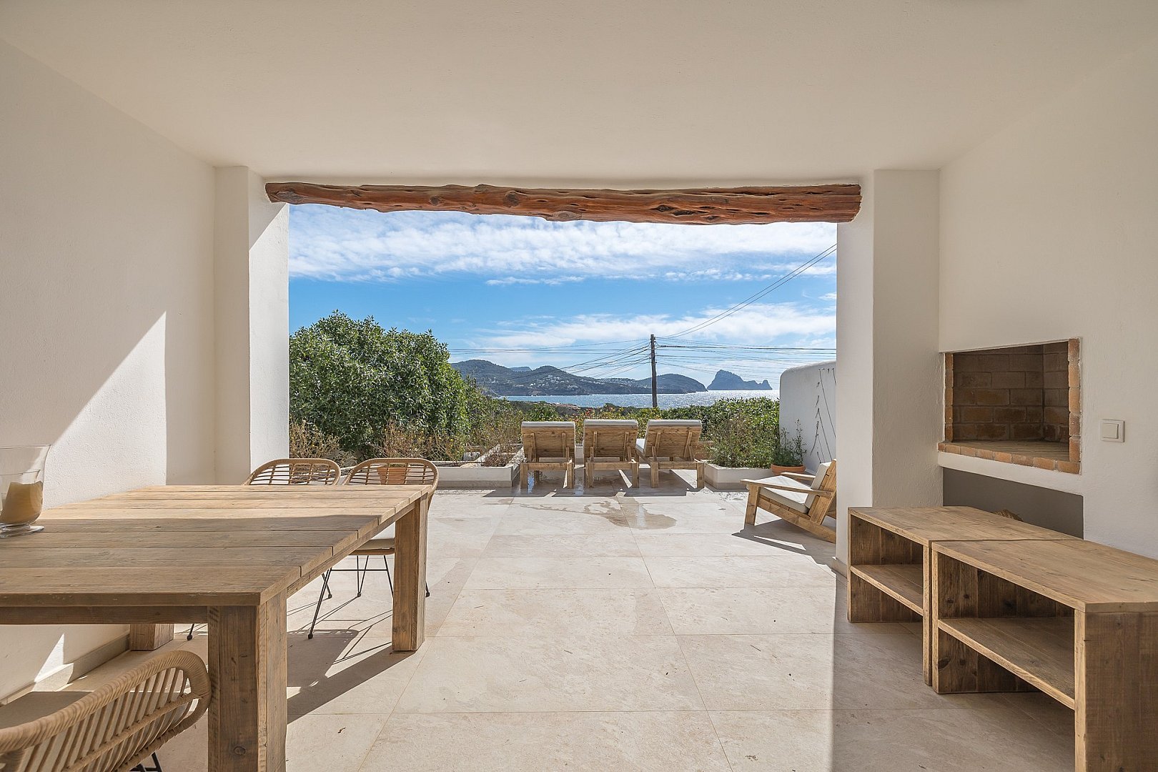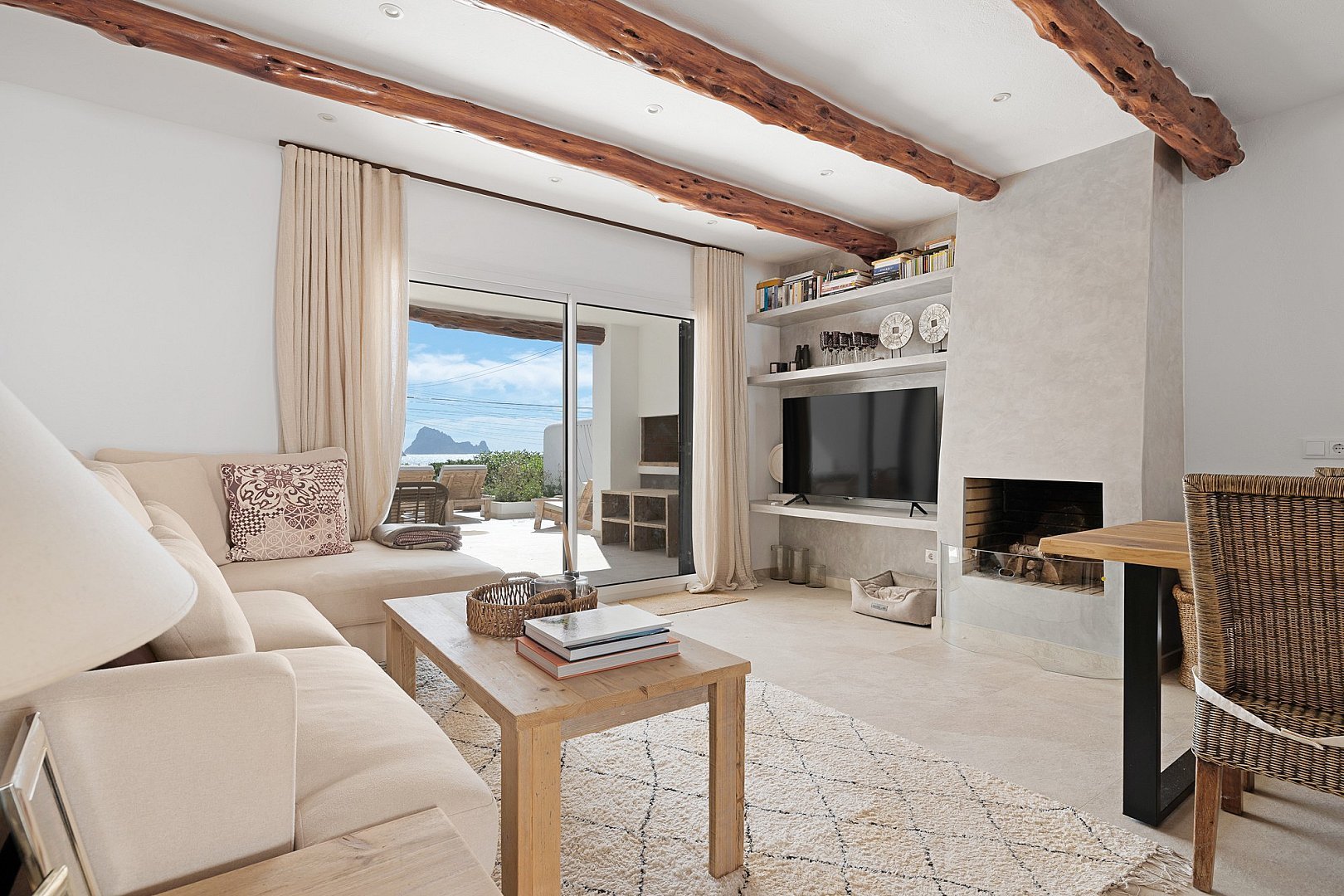 This magnificent townhouse, completely renovated with exquisite taste, is located in a quiet residential area just 100 meters from a beautiful cove. The residential complex has a fabulous communal pool and well-maintained gardens, making this place a perfect retreat for our busy modern lives. Upon entering the house, we are welcomed by a cozy patio ideal for enjoying the outdoors. The house features an elegant living-dining room with a fireplace, perfect for providing warmth during autumns and winters. Additionally, it includes a master bedroom with an en-suite bathroom, a second double bedroom, and another full bathroom. From the living room and one of the bedrooms, there is access to a spectacular outdoor terrace with unbeatable views of the Mediterranean Sea and Es Vedrà, that magical rock everyone admires. A small garden completes this fabulous townhouse; from there, a door gives direct access to the street, where, a few steps away, there is a staircase leading to the sea. This place is not just a home but a true dream.