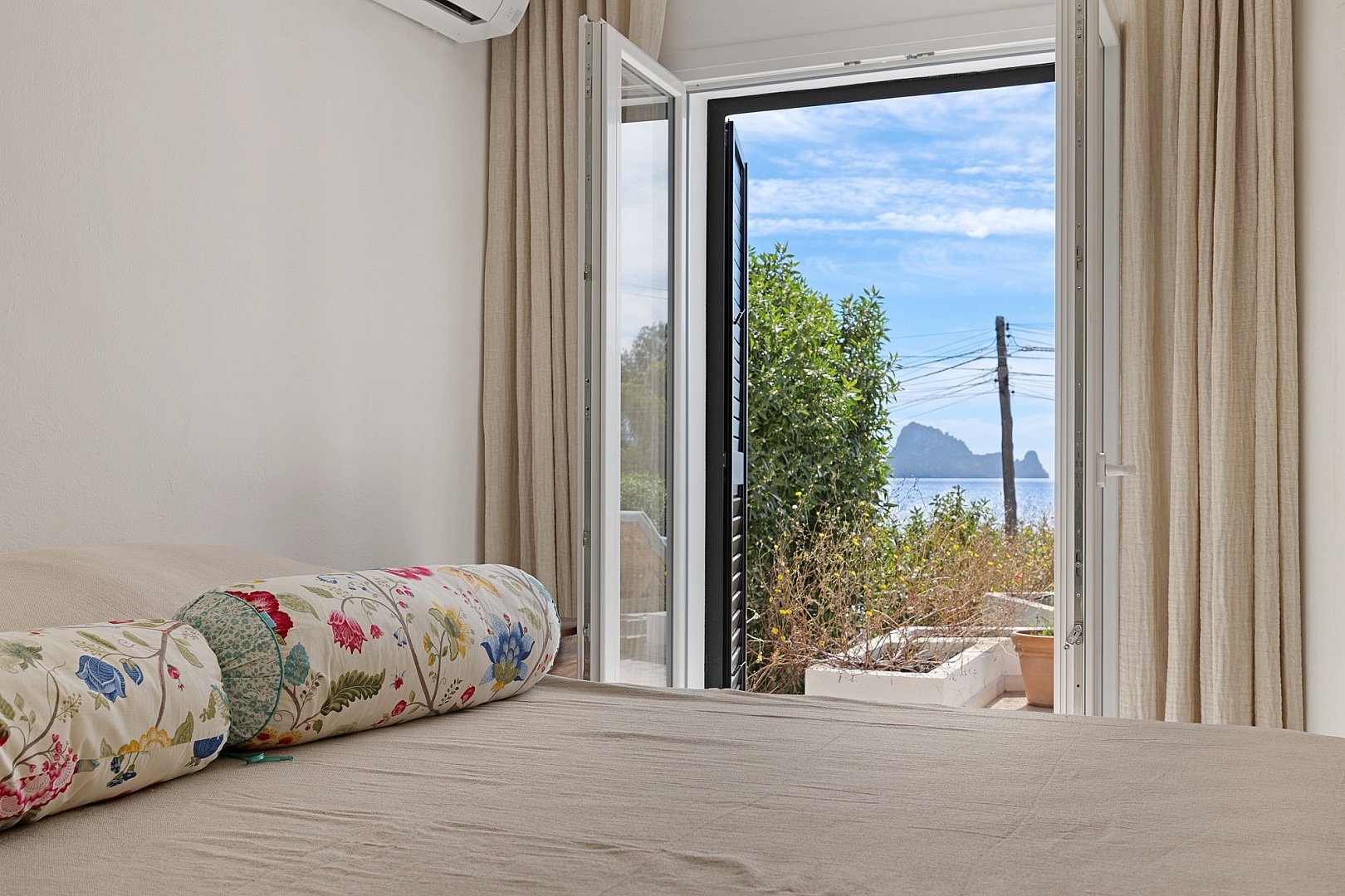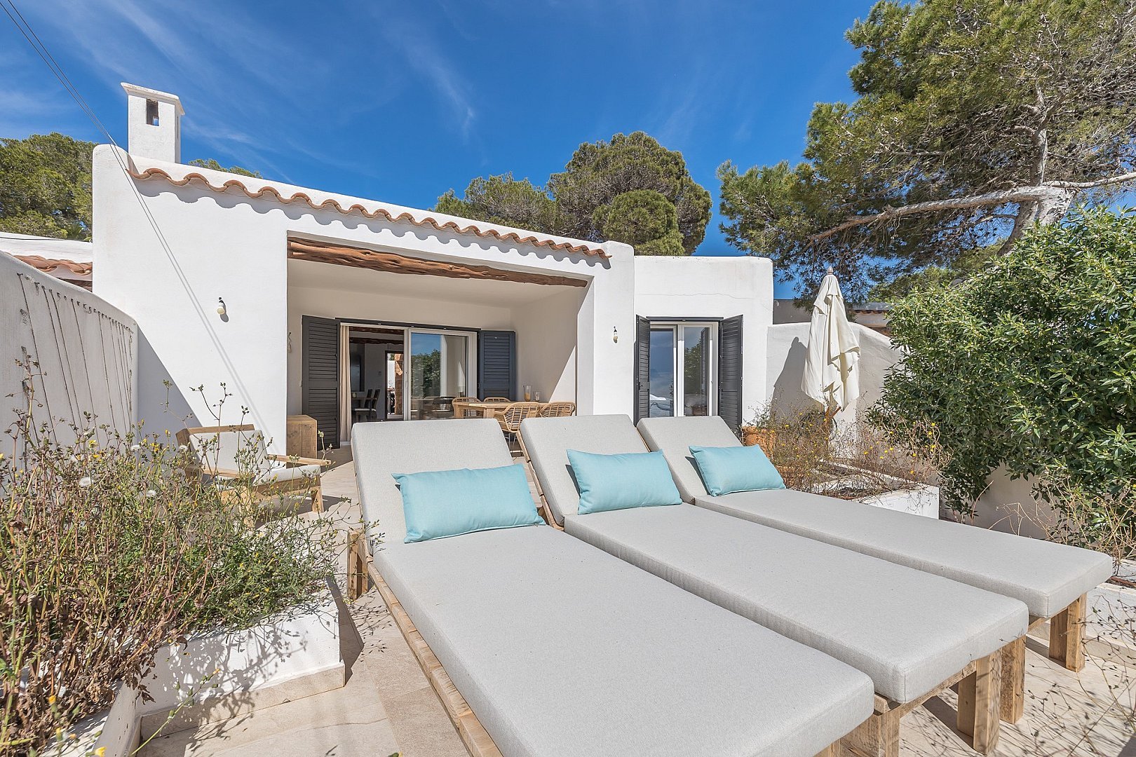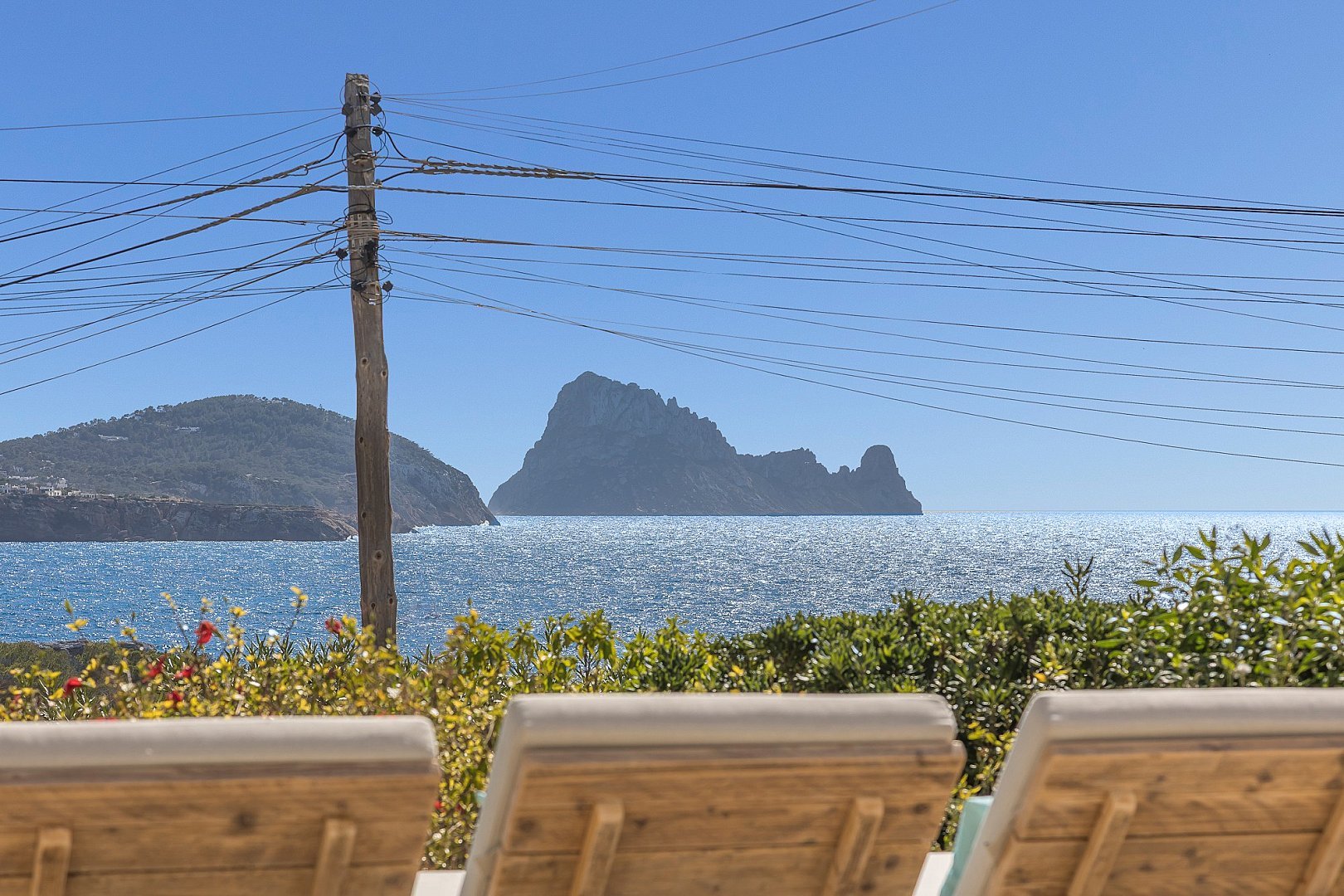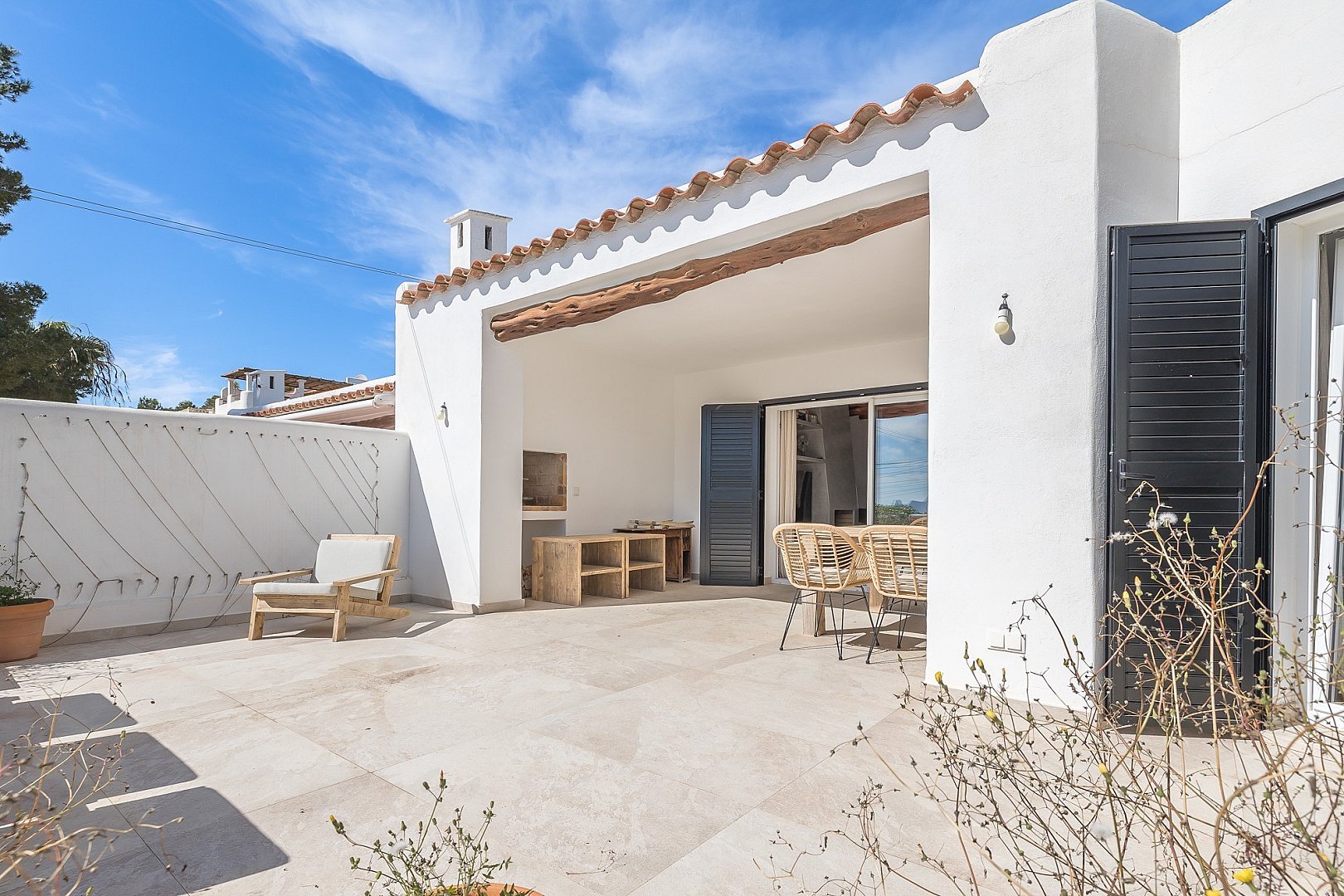 This magnificent townhouse, completely renovated with exquisite taste, is located in a quiet residential area just 100 meters from a beautiful cove. The residential complex has a fabulous communal pool and well-maintained gardens, making this place a perfect retreat for our busy modern lives. Upon entering the house, we are welcomed by a cozy patio ideal for enjoying the outdoors. The house features an elegant living-dining room with a fireplace, perfect for providing warmth during autumns and winters. Additionally, it includes a master bedroom with an en-suite bathroom, a second double bedroom, and another full bathroom. From the living room and one of the bedrooms, there is access to a spectacular outdoor terrace with unbeatable views of the Mediterranean Sea and Es Vedrà, that magical rock everyone admires. A small garden completes this fabulous townhouse; from there, a door gives direct access to the street, where, a few steps away, there is a staircase leading to the sea. This place is not just a home but a true dream.