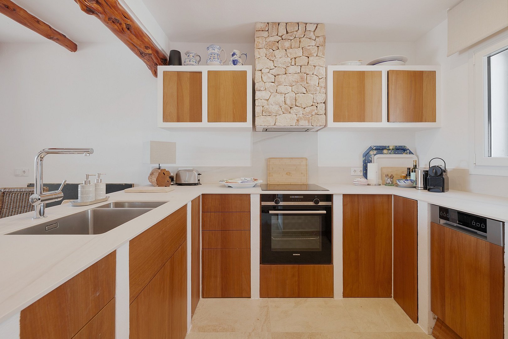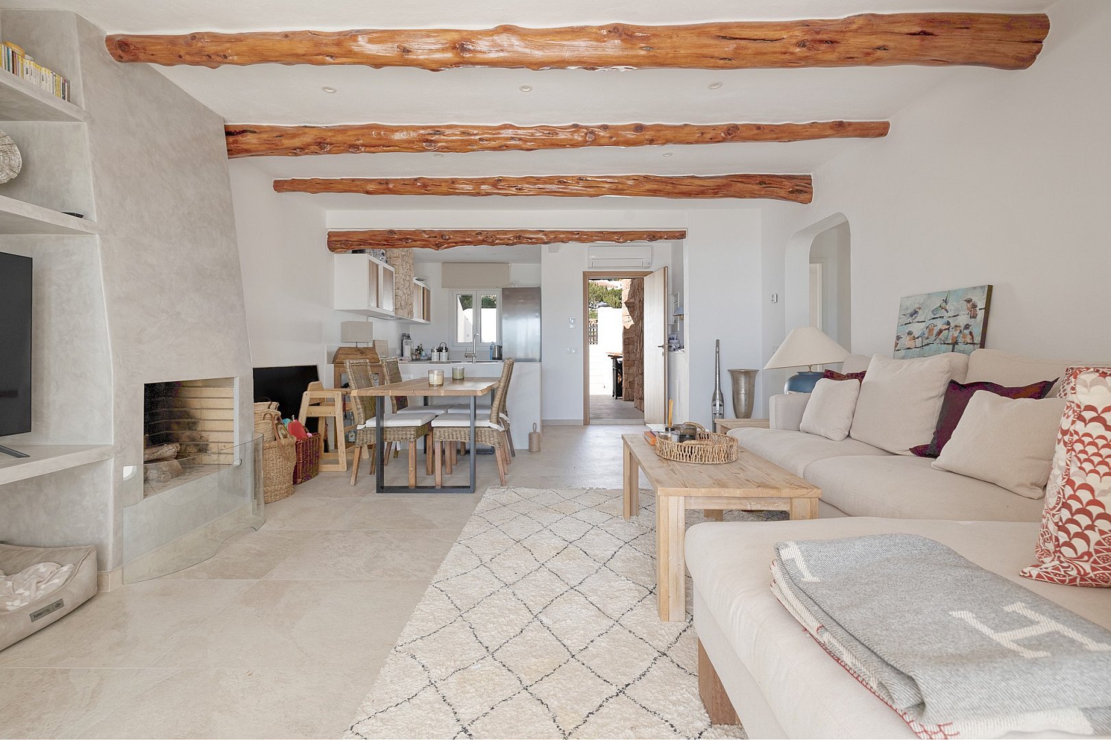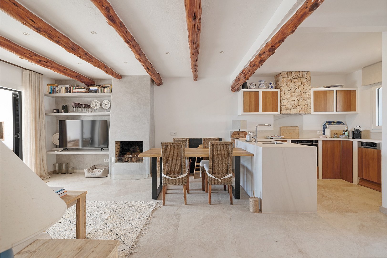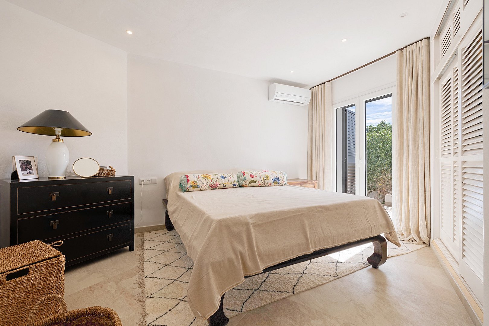 This magnificent townhouse, completely renovated with exquisite taste, is located in a quiet residential area just 100 meters from a beautiful cove. The residential complex has a fabulous communal pool and well-maintained gardens, making this place a perfect retreat for our busy modern lives. Upon entering the house, we are welcomed by a cozy patio ideal for enjoying the outdoors. The house features an elegant living-dining room with a fireplace, perfect for providing warmth during autumns and winters. Additionally, it includes a master bedroom with an en-suite bathroom, a second double bedroom, and another full bathroom. From the living room and one of the bedrooms, there is access to a spectacular outdoor terrace with unbeatable views of the Mediterranean Sea and Es Vedrà, that magical rock everyone admires. A small garden completes this fabulous townhouse; from there, a door gives direct access to the street, where, a few steps away, there is a staircase leading to the sea. This place is not just a home but a true dream.