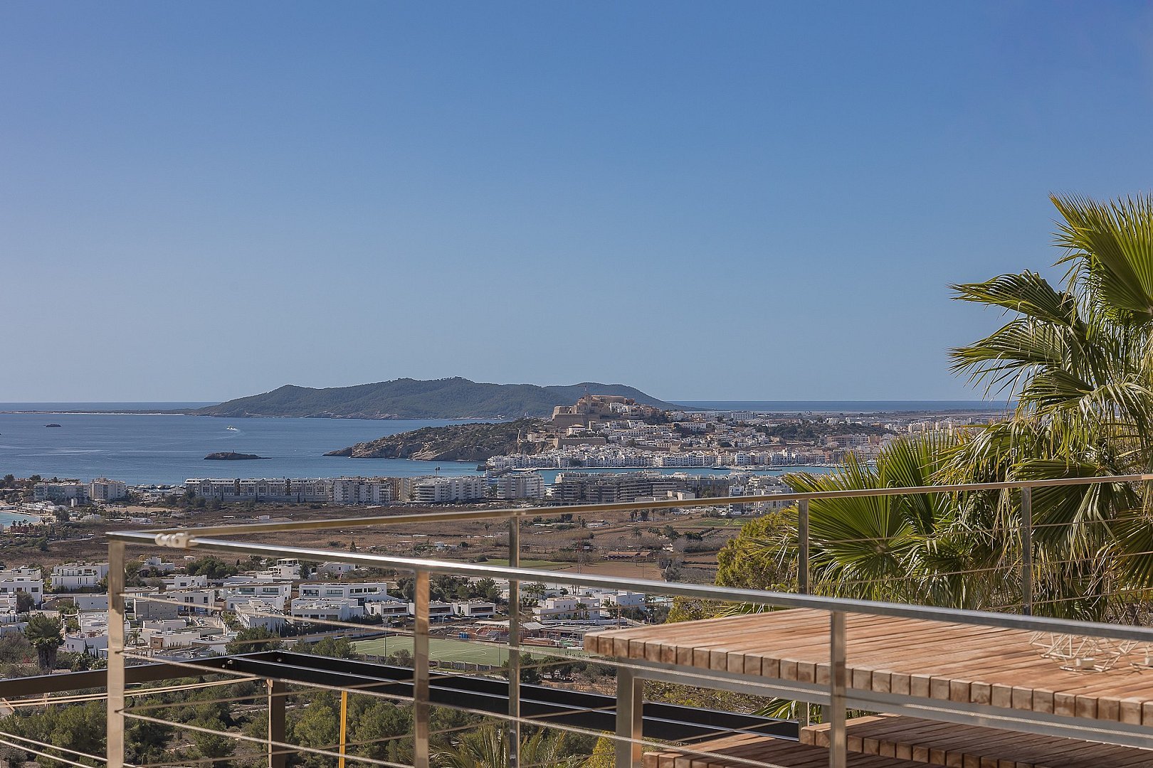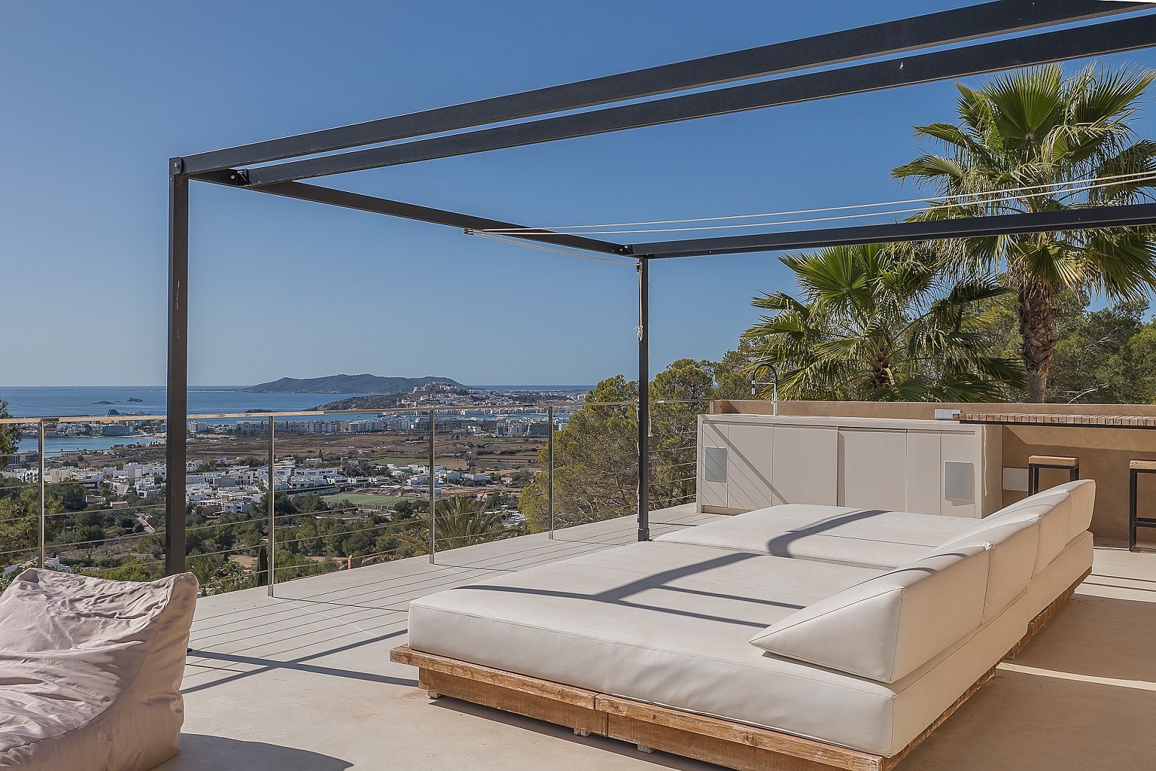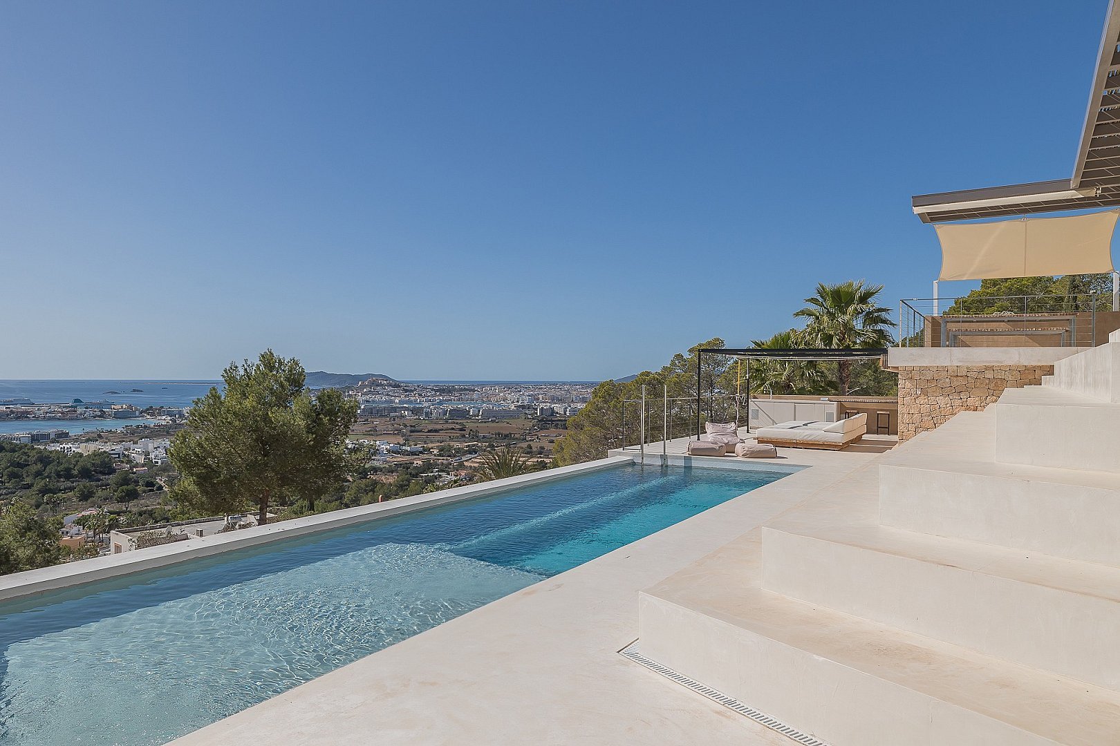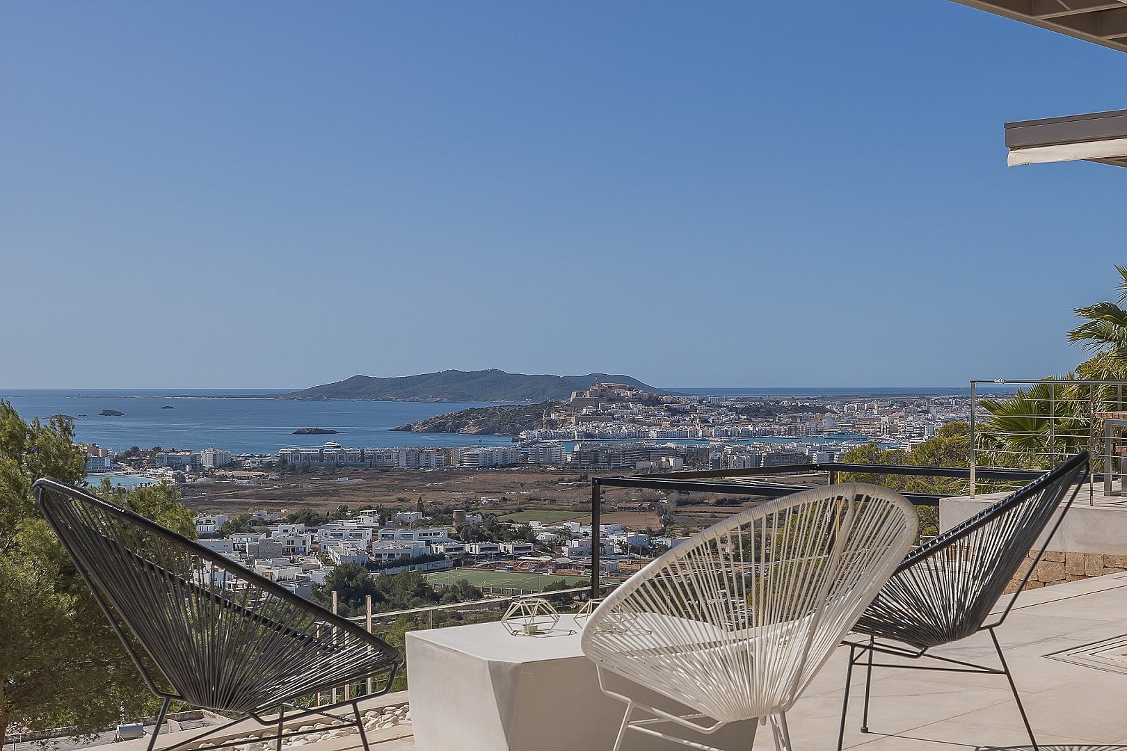 This Mediterranean villa is located in one of the most exclusive gated urbanisations of Ibiza called "Can Rimbau". Sought after for its central location and proximity to Ibiza Town. Within walking distance you reach the village of Jesus which offers a selection of supermarkets, bakery and restaurants. The famous beaches of Talamanca and Ses Salinas are only a few minutes drive. With its natural stone wall and wooden elements you enjoy a cozy mediterranean flair with panoramic sea views including views to old town "Dalt Vila" and Formentera. Divided on three levels the villa offers six bedrooms, an office, an open space living room, a rooftop terrace as well as a night club and a garage. The generous Mastersuite comes with a walk-in closet and private sun terrace with sea views, and four guest rooms each with en suite bathrooms and access to a terrace. The generous living room is divided into a dining area followed by the lounge with fireplace and open plan kitchen with Gaggenau appliances. Sitting on the sofa lounge you enjoy breathtaking views to the Mediterranean sea and old town Dalt Vila. Opening up the floor to ceiling windows you can combine indoor with alfrescoliving. From the main level you have access to the pool with its lounges and outdoor bar. Continuing with the elevator or with stairs you reach the highest level, the rooftop terrace. You will find several lounges and dining possibilities, a jacuzzi, a professional outdoor cuisine with BBQ. The property is equipped with underfloor heating, electric curtains and shutters, garage for 3-4 cars and a night club/cinema room. A plus is the separate staff studio with kitchenette. The ideal estate to host a group of friends and enjoy unique Ibiza vibes.