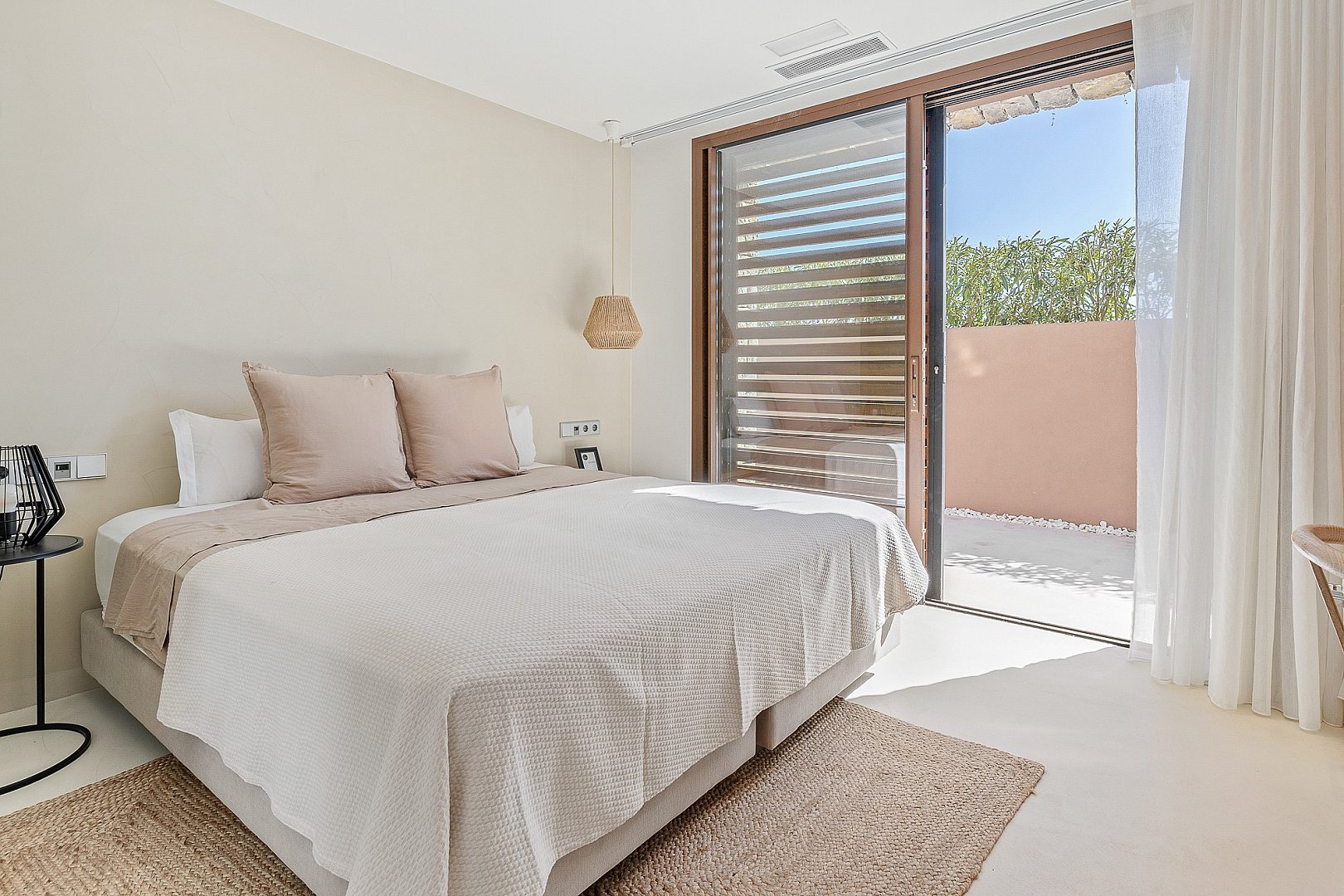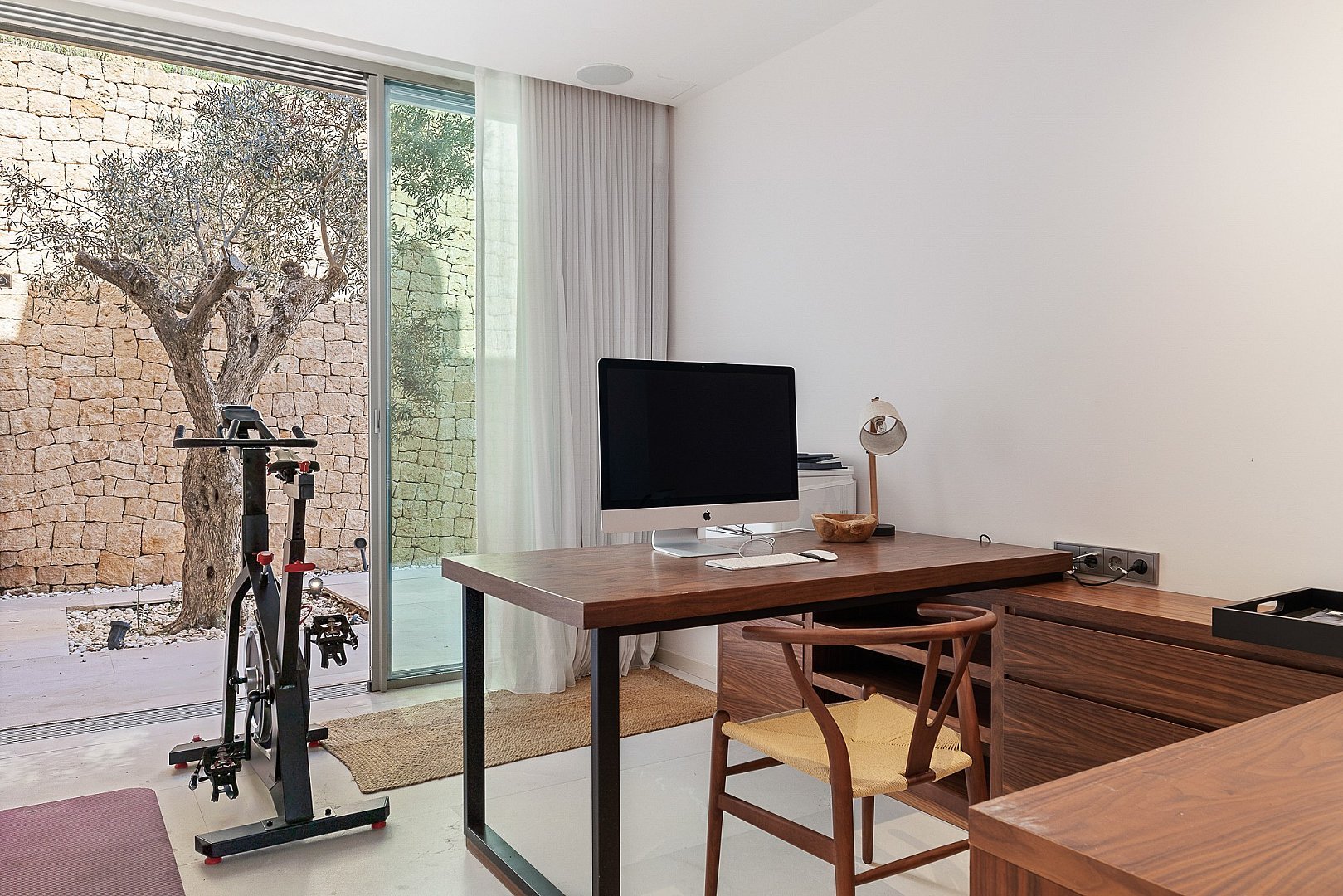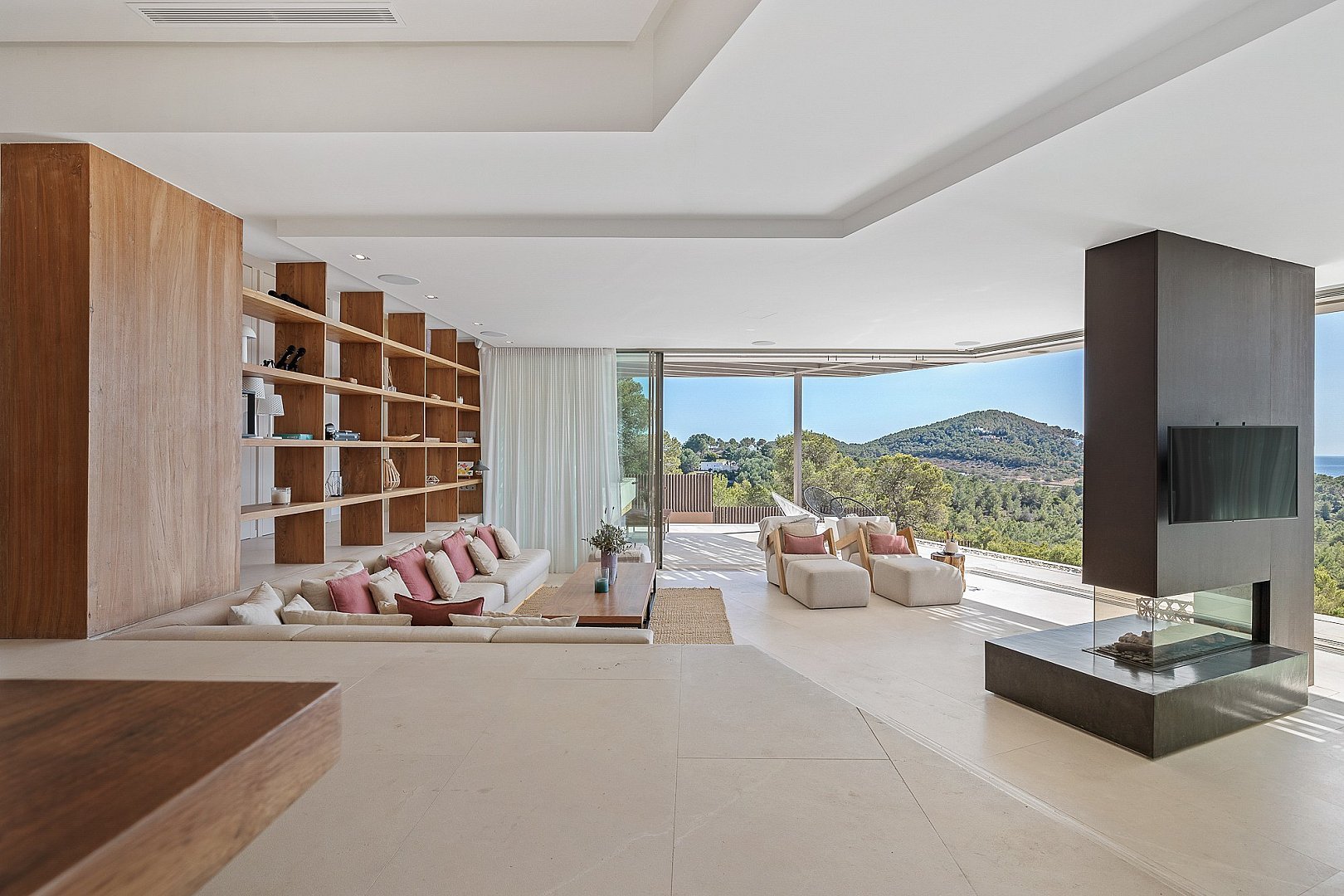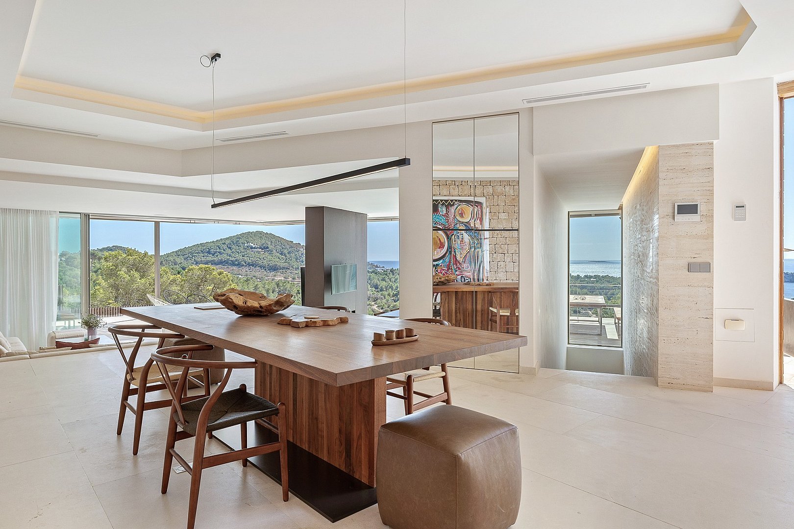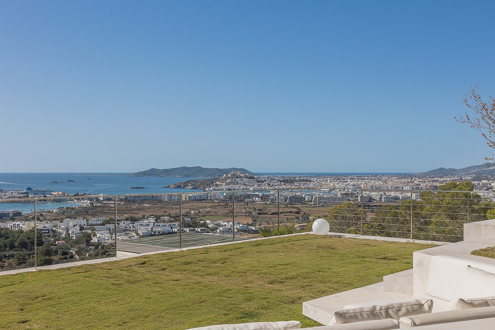 This Mediterranean villa is located in one of the most exclusive gated urbanisations of Ibiza called "Can Rimbau". Sought after for its central location and proximity to Ibiza Town. Within walking distance you reach the village of Jesus which offers a selection of supermarkets, bakery and restaurants. The famous beaches of Talamanca and Ses Salinas are only a few minutes drive. With its natural stone wall and wooden elements you enjoy a cozy mediterranean flair with panoramic sea views including views to old town "Dalt Vila" and Formentera. Divided on three levels the villa offers six bedrooms, an office, an open space living room, a rooftop terrace as well as a night club and a garage. The generous Mastersuite comes with a walk-in closet and private sun terrace with sea views, and four guest rooms each with en suite bathrooms and access to a terrace. The generous living room is divided into a dining area followed by the lounge with fireplace and open plan kitchen with Gaggenau appliances. Sitting on the sofa lounge you enjoy breathtaking views to the Mediterranean sea and old town Dalt Vila. Opening up the floor to ceiling windows you can combine indoor with alfrescoliving. From the main level you have access to the pool with its lounges and outdoor bar. Continuing with the elevator or with stairs you reach the highest level, the rooftop terrace. You will find several lounges and dining possibilities, a jacuzzi, a professional outdoor cuisine with BBQ. The property is equipped with underfloor heating, electric curtains and shutters, garage for 3-4 cars and a night club/cinema room. A plus is the separate staff studio with kitchenette. The ideal estate to host a group of friends and enjoy unique Ibiza vibes.