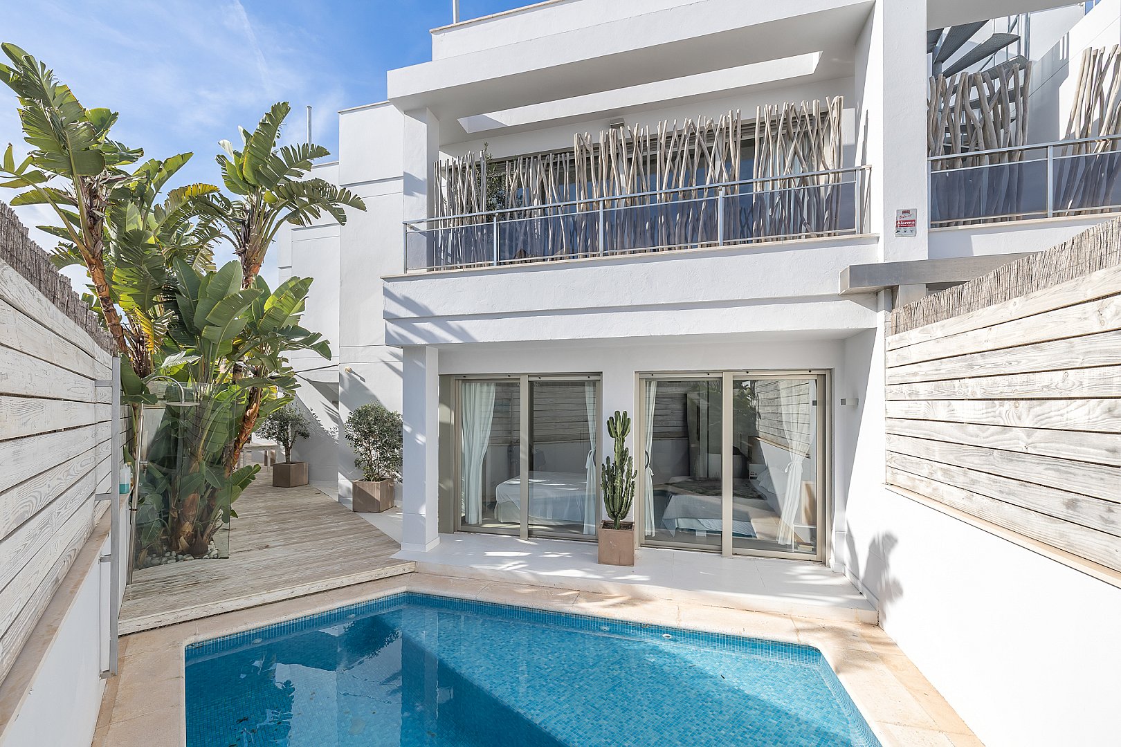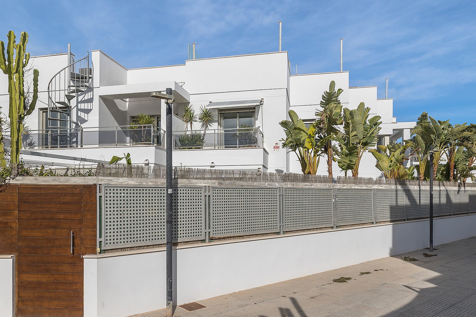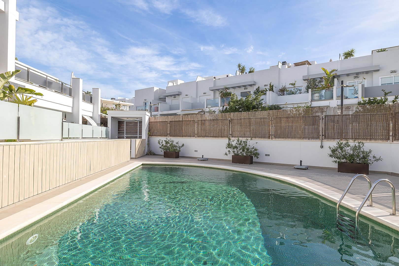 This corner townhouse is located in the sought-after Illa Plana area. The residence offers five spacious bedrooms, three well-appointed bathrooms, and a dedicated office space, arranged over two floors plus a generous rooftop terrace. The ground floor includes the main kitchen, the office, three bedrooms and two full bathrooms. All ground-floor rooms feature sliding doors that open directly to the outdoor chill area and the private swimming pool. A staircase leads to the first floor, which contains the main living room, the master suite with a private balcony, an additional bedroom and a bathroom with a bathtub. For outdoor living, a separate outside staircase provides access to the rooftop terrace, which has been outfitted with a bar area, a gym, and an expansive chill-out space perfect for entertaining and relaxation. For enjoyment, the house features its own private pool, with the added benefit of full use of the community pool from the connected townhouse community. The private basement garage, large enough for six cars, has been transformed to include a secondary kitchen and a comfortable chill-out area, which can serve as a spacious playroom, teenage lounge, or a private entertaining space.