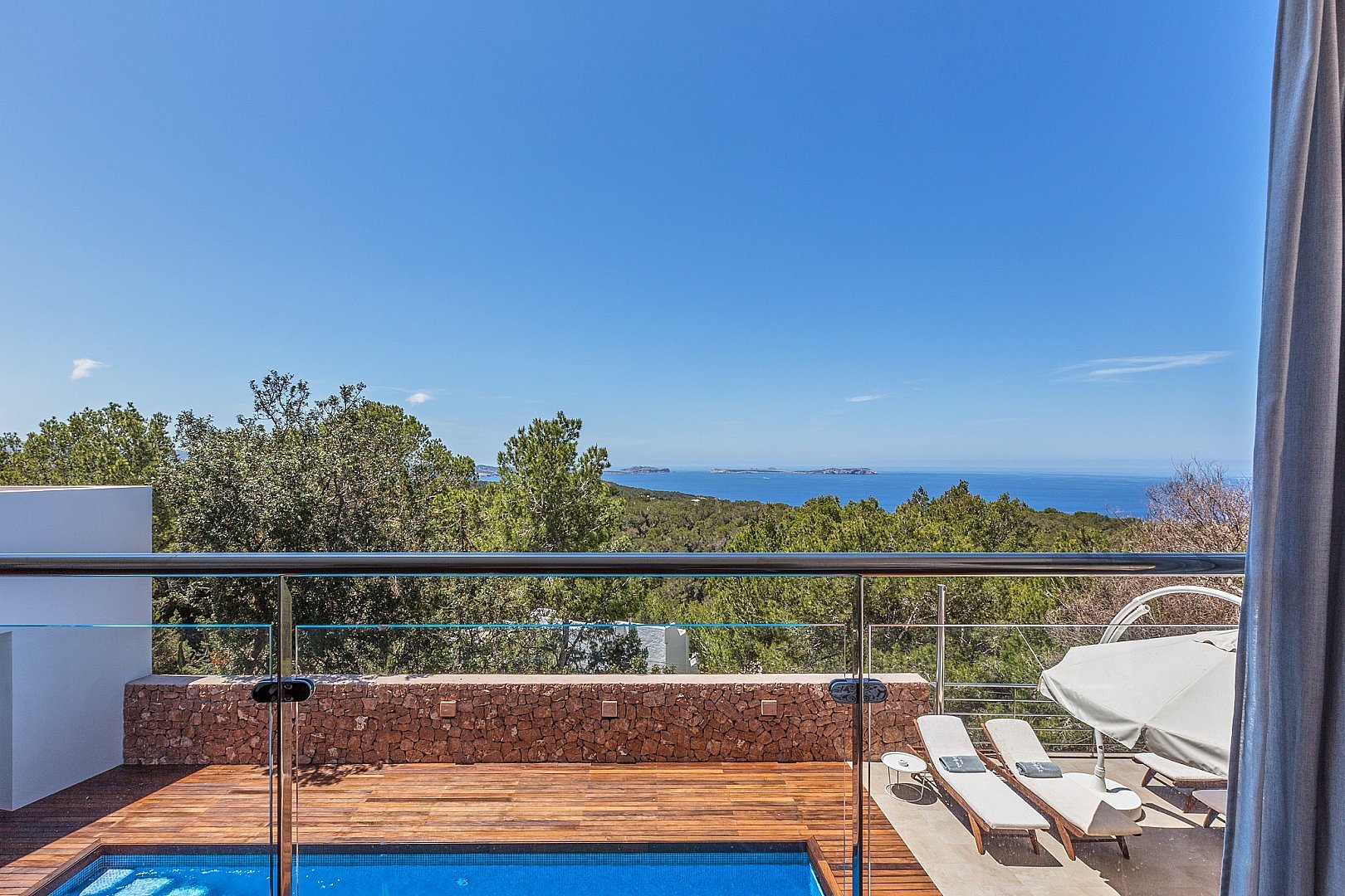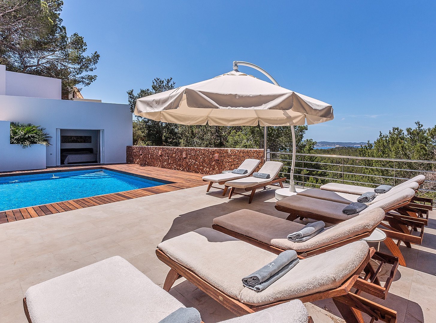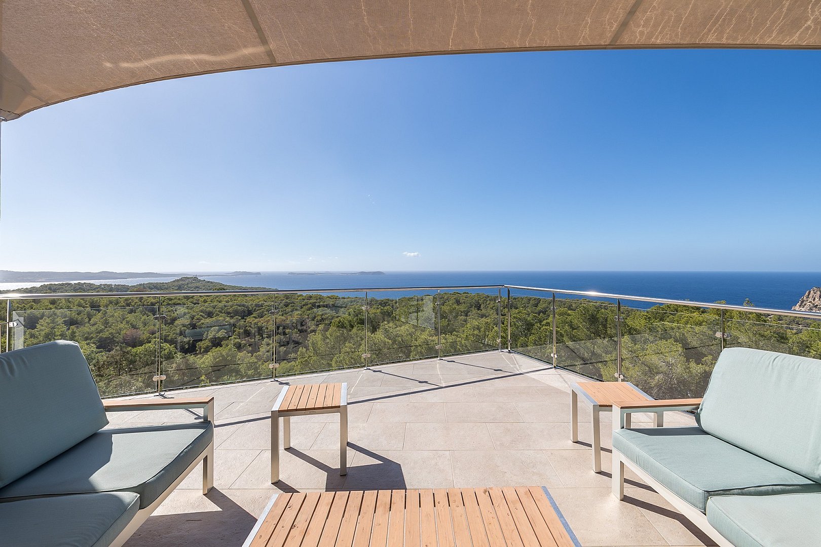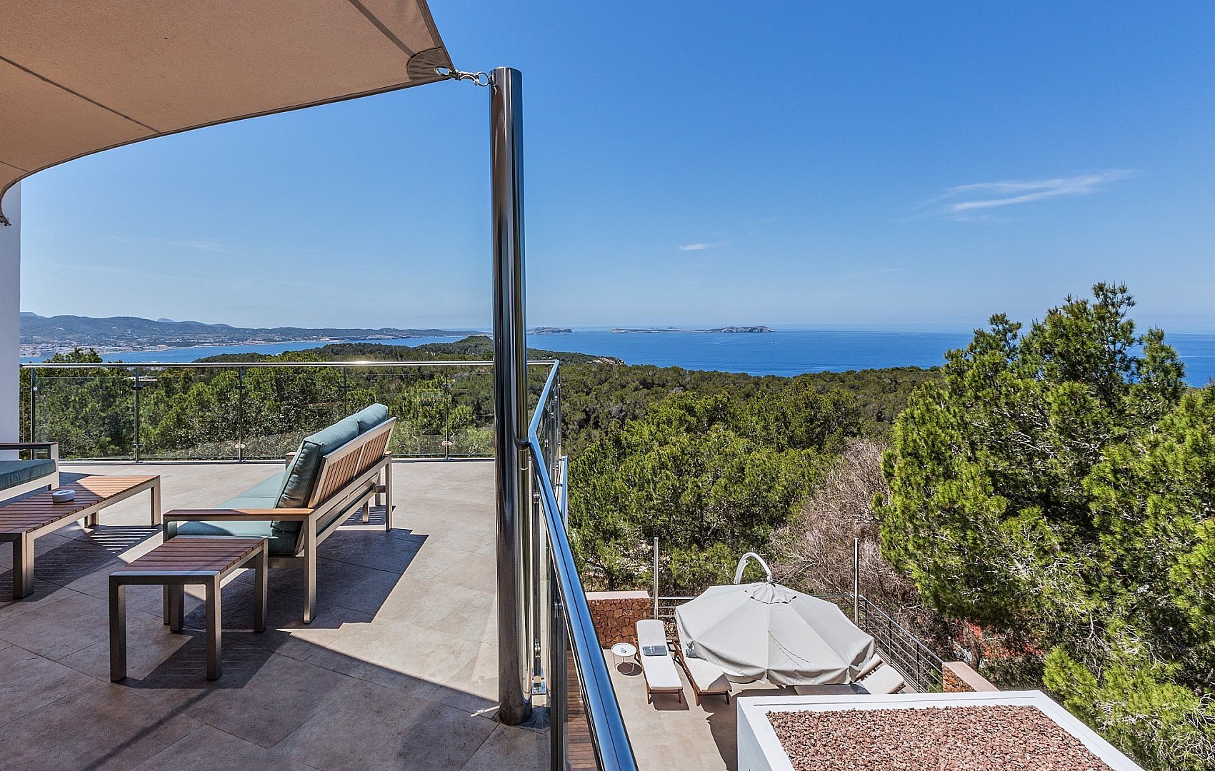 The modern villa is located on the top of a hill and offers breathtaking sea views from almost all rooms, which impress you as soon as you enter. On the entrance level is the spacious open-plan living room, which is fitted with sliding windows that implement indoor/outdoor living and an open-plan kitchen. The terrace in front of the house offers a marvellous view of the sea and the offshore islands. A staircase leads up to the roof terrace with chill-out area, where you can enjoy the sunsets over the sea. The villa has a total of six bedrooms with en-suite bathrooms, all of which are generously proportioned and have ample wardrobe space. On the guest level there is a beautiful terrace, a pool and a covered outdoor kitchen, which invites you to socialise. A staircase leads to a maid's room and the garage. The property has a rental licence for six bedrooms and there is the possibility to take over the existing client base.