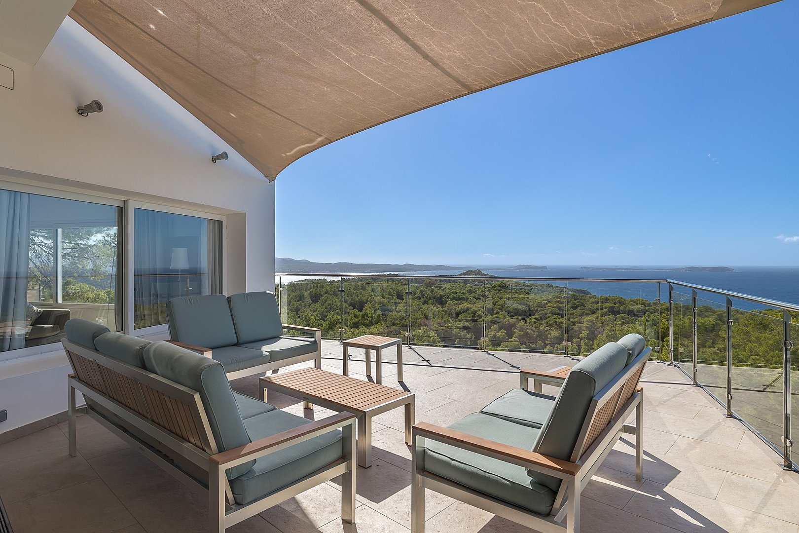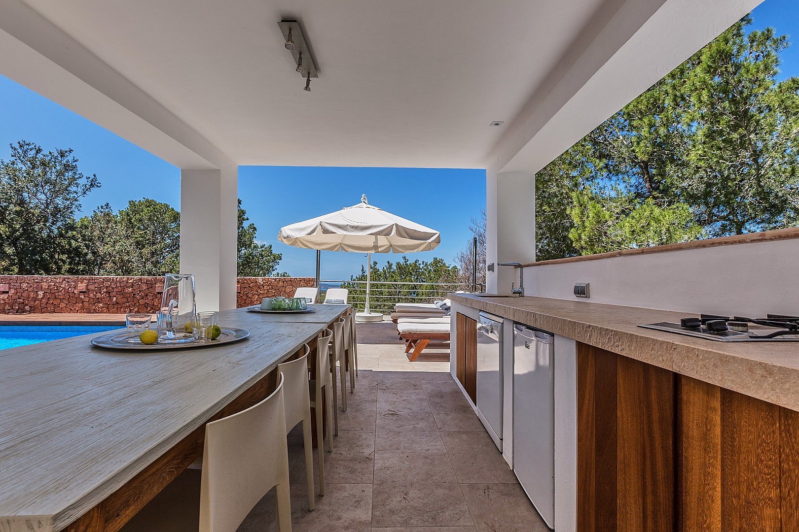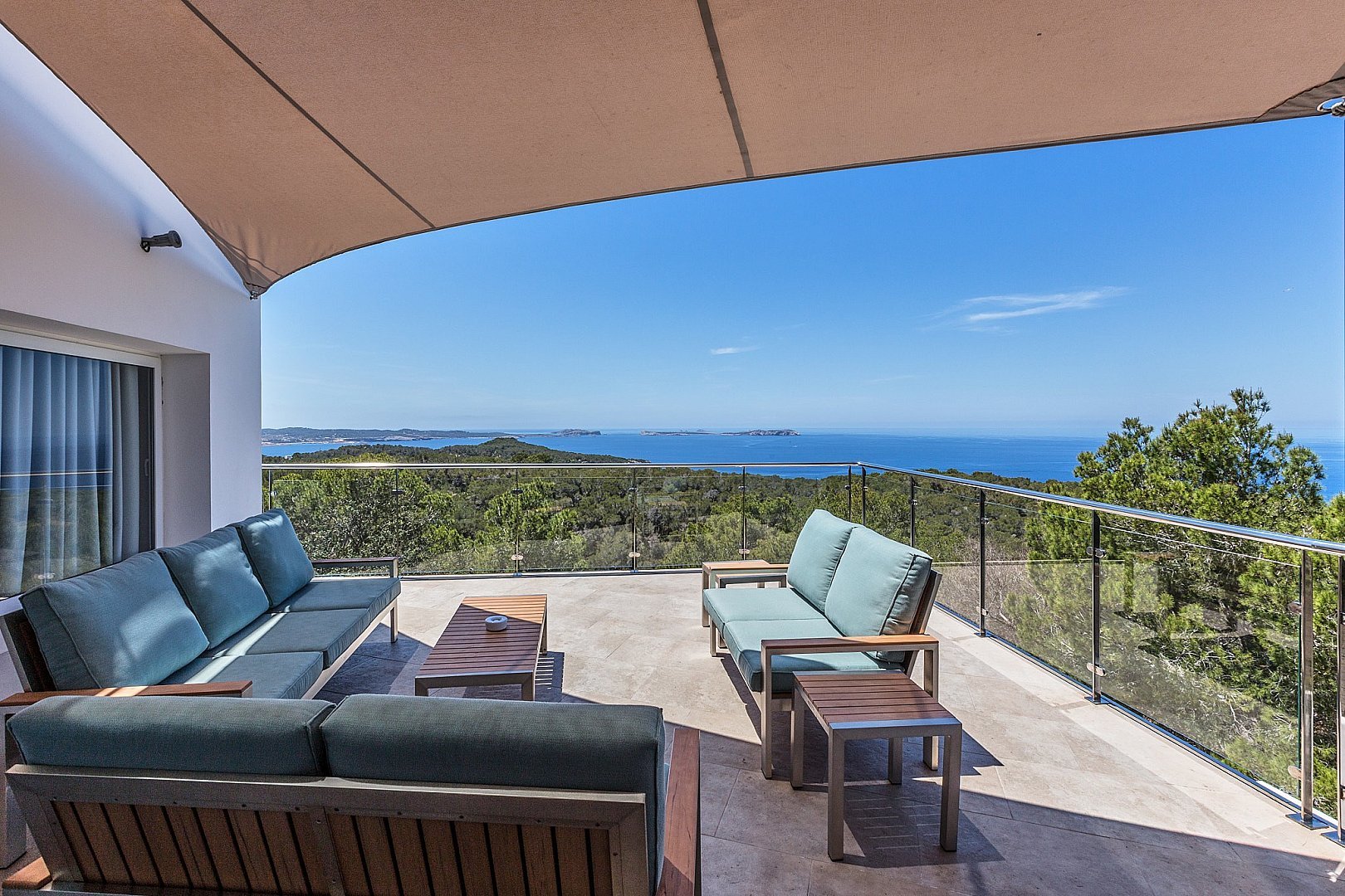 The modern villa is located on the top of a hill and offers breathtaking sea views from almost all rooms, which impress you as soon as you enter. On the entrance level is the spacious open-plan living room, which is fitted with sliding windows that implement indoor/outdoor living and an open-plan kitchen. The terrace in front of the house offers a marvellous view of the sea and the offshore islands. A staircase leads up to the roof terrace with chill-out area, where you can enjoy the sunsets over the sea. The villa has a total of six bedrooms with en-suite bathrooms, all of which are generously proportioned and have ample wardrobe space. On the guest level there is a beautiful terrace, a pool and a covered outdoor kitchen, which invites you to socialise. A staircase leads to a maid's room and the garage. The property has a rental licence for six bedrooms and there is the possibility to take over the existing client base.